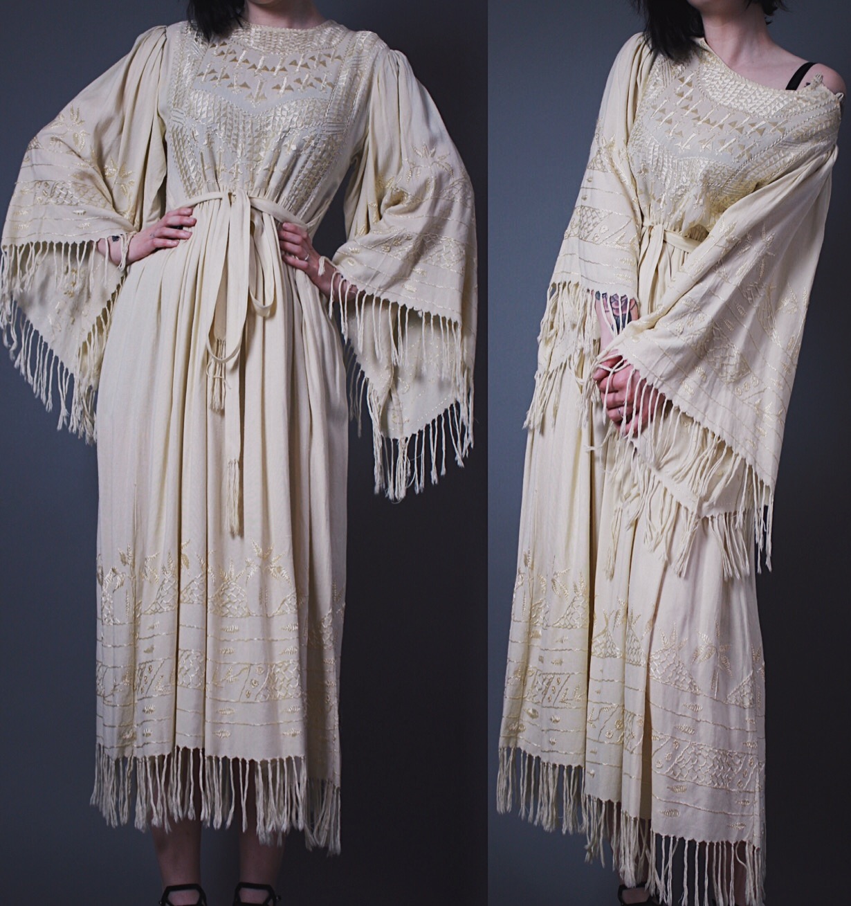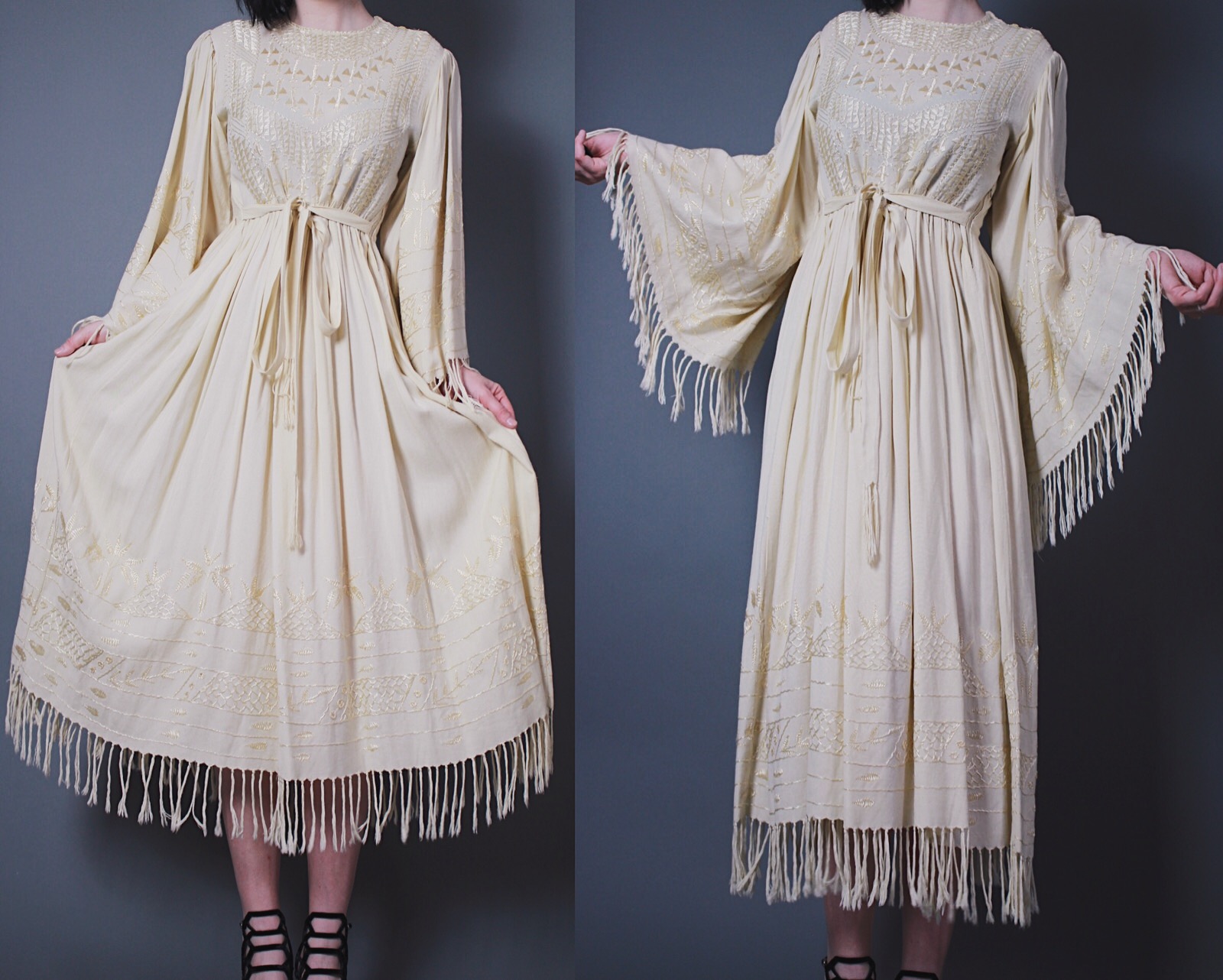- Amazing authentic vintage 1970s bohemian dress. Huge, flowy bell sleeves and a cinched waist. Super intricate embroidery detail at the bodice, up the sleeves, and around the hem of the skirt. Frayed fringe trim at the sleeves and hem. Two-button closure at the top of each shoulder so you can wear it off one or both shoulders! Cotton fabric is an unbleached pale yellow-beige. Has side ties at the back of the waist so you can cinch it and tie in front or back.