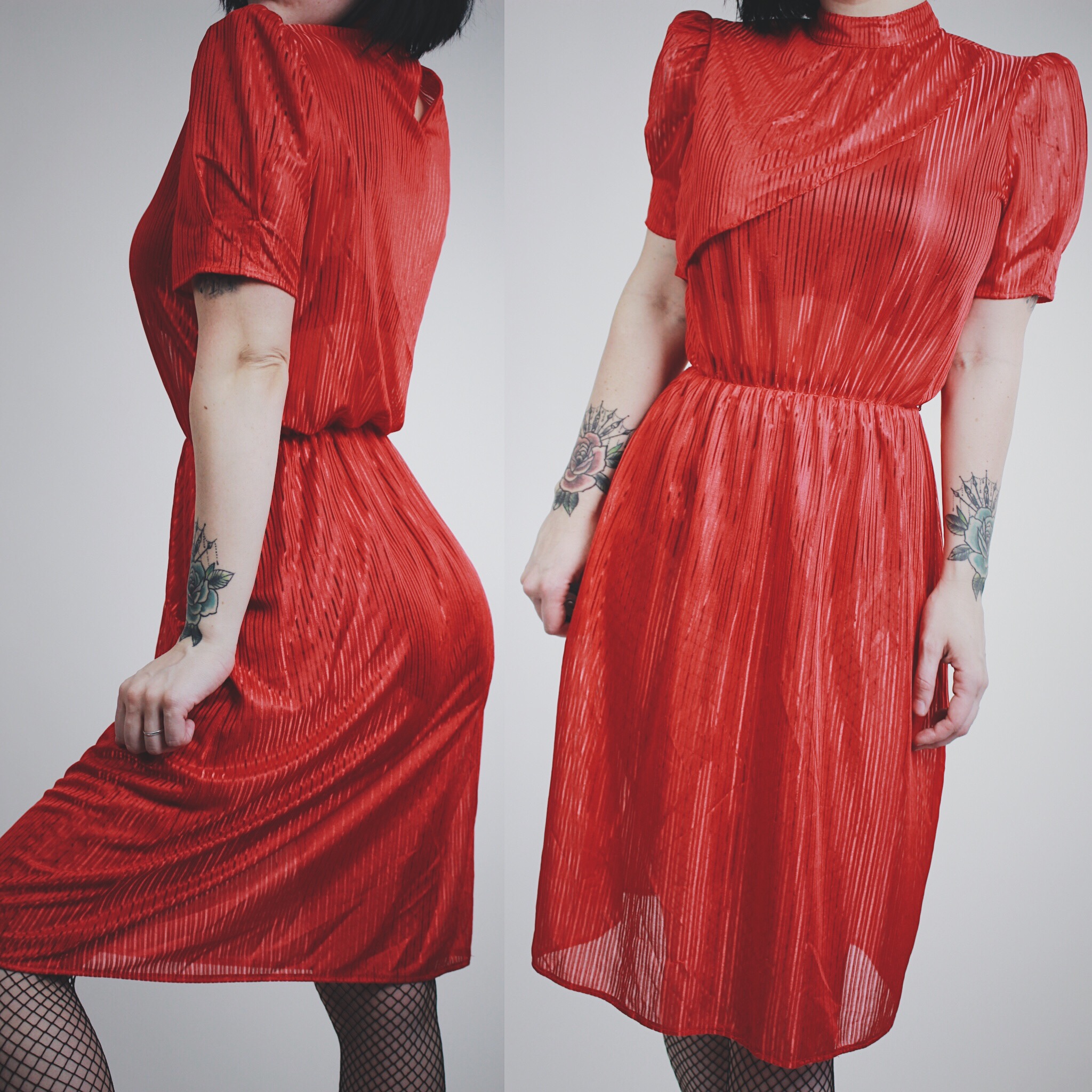 The Villain Dress! Vintage 50s red striped satin day dress. Pointed shoulders have small shoulder pads build in but they can be removed easily if you don't like them. Draping detail on one side in the front. Slightly puffed cap sleeves. Elastic waist. Midi length will hit around the knee or mid-calf on most people (I am 5'2" for reference). Buttons at the back of the neck with a small cutout.