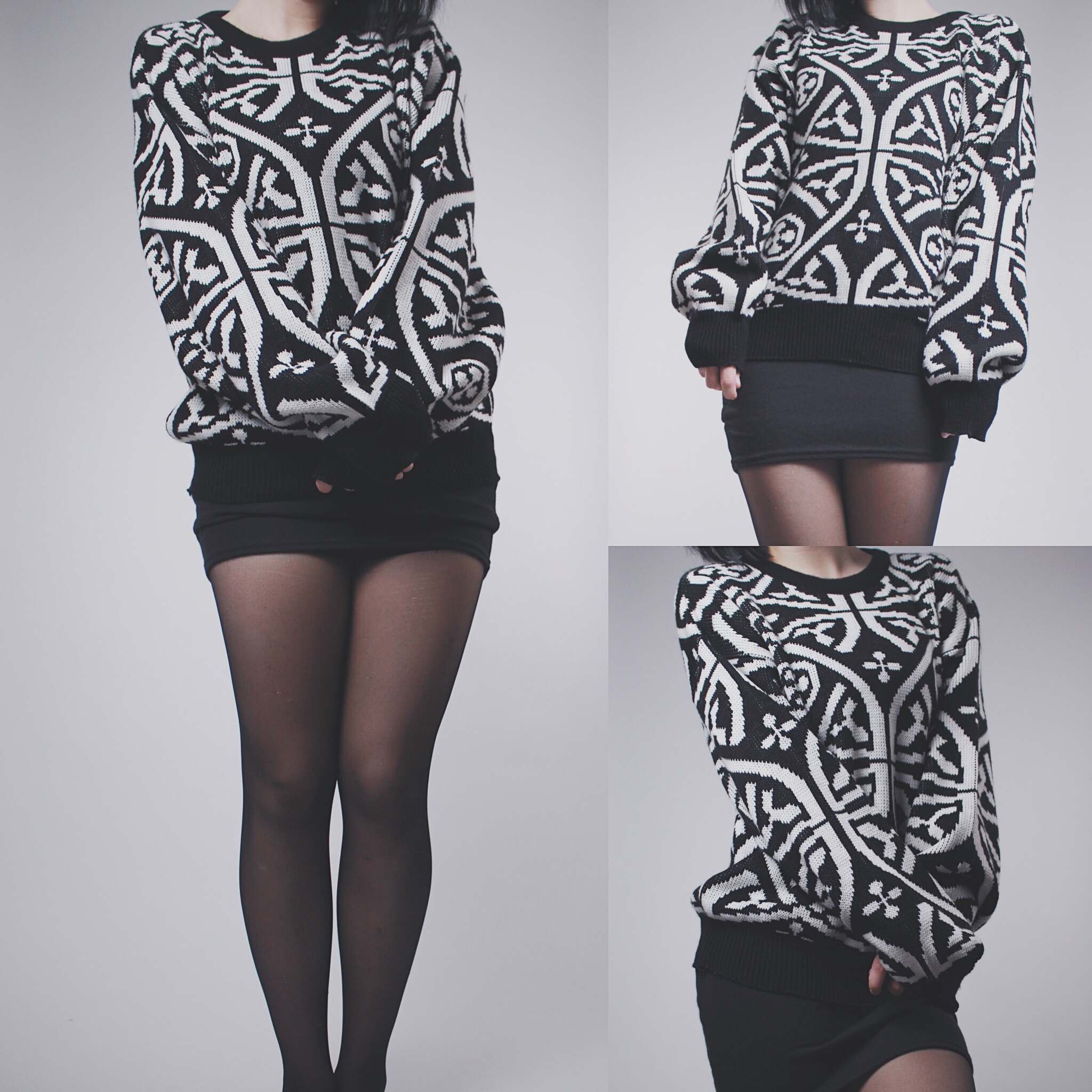 Vintage 80s black & white graphic sweater. Cozy, warm, thick chunky knit. Crew neck with black trim at the collar and cuffs. Meant to be loose, oversized and slouchy. Roomy sleeves. Style with leggings, faux leather skinny pants or a bodycon skirt/dress and patterned tights with your favorite boots! Perfect for layering in fall and winter. Super unique bold medieval inspired graphic print.