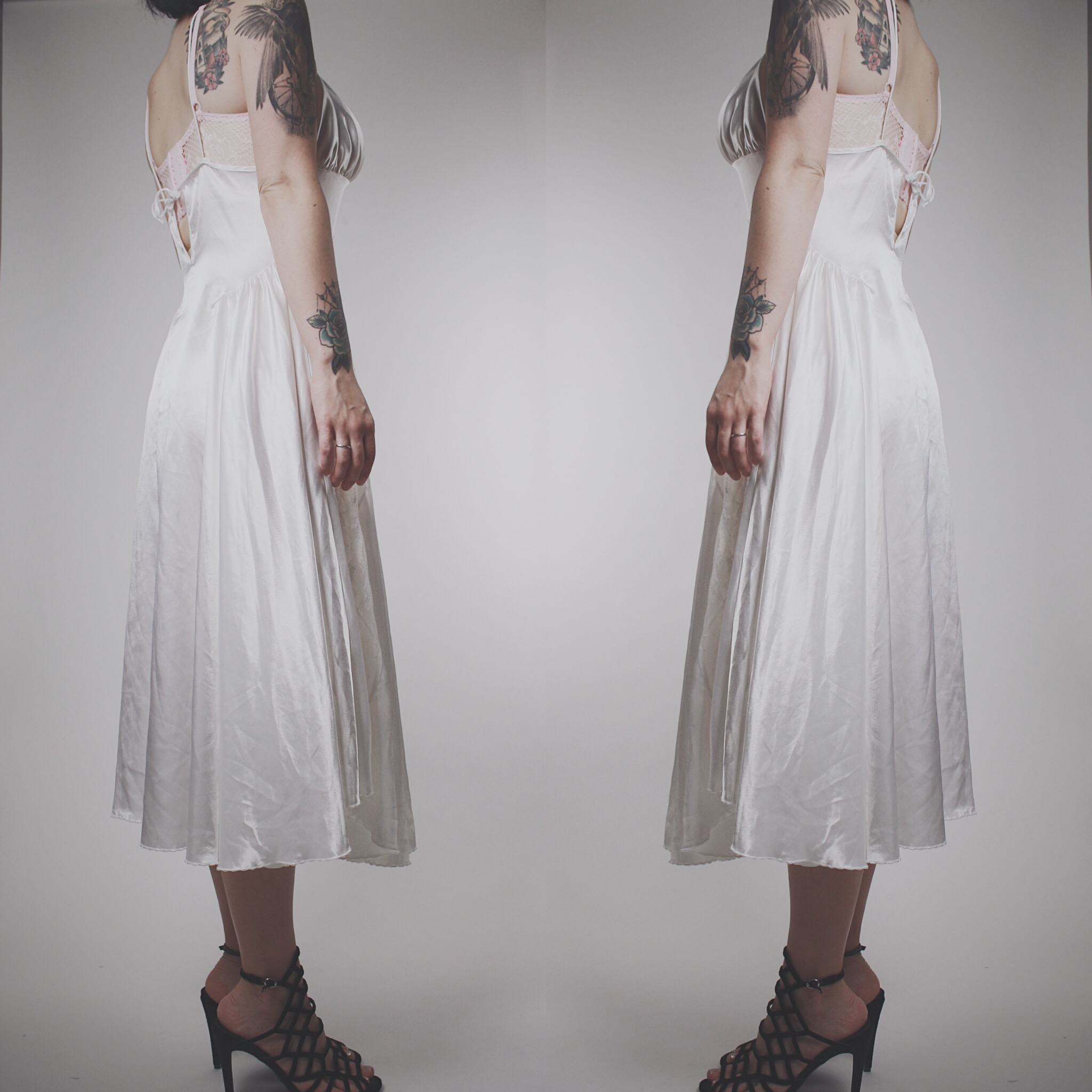 Vintage 80s white satin and lace bridal nightgown. Asymmetrical lace cutout detail wraps around the front and down the length of the skirt. Gathered empire waist and triangle bust with bow detail in front. Ties in the back. Super full flowy circle skirt gives it Marilyn Monroe vibes. No stretch. Straps are non adjustable. Can be styled as lingerie or layered for daytime. If you are extra tiny this would be a bit more slouchy on you and would look amazing with a western-inspired belt and a hat for boho festival vibes.