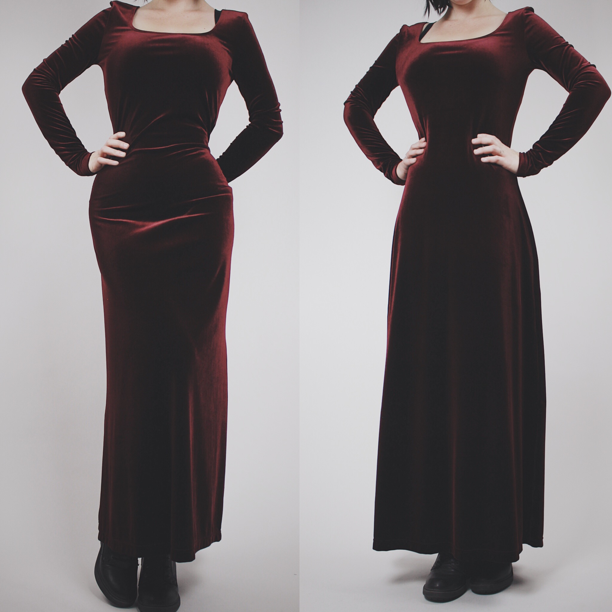 Vintage 90s burgundy velvet gown. Maxi length with long sleeves. Heavy but flowy mid-weight velvet jersey fabric is super soft. LOTS of stretch. Column cut can be loose and drapey or hug your curves depending on your measurements. Perfect for fall and winter layering.