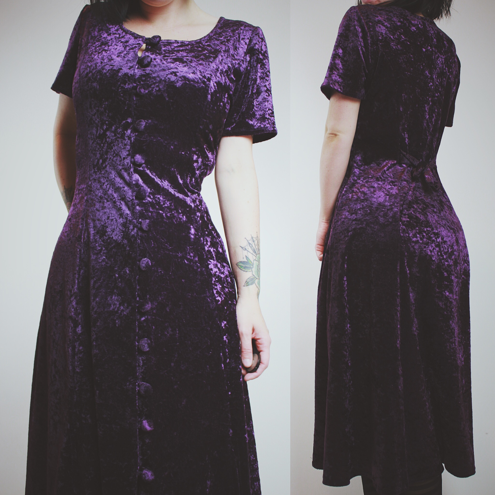 Vintage 90s purple crushed velvet midi dress. The perfect dress for conjuring up midnight margaritas and watching Practical Magic with your best witches.