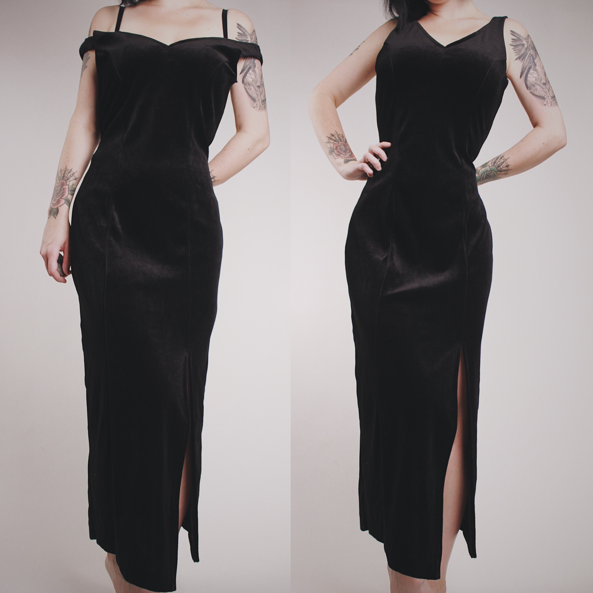 Vintage 80s black velvet gown. V-neck and back. Has a bit of stretch. . Fully lined. Can be worn sleeveless or pushed off-the-shoulder. Zips up the back. Front/side slit is roughly knee-high. Perfect for Halloween - so many vampy costume options!- and fall/winter events and nights out.