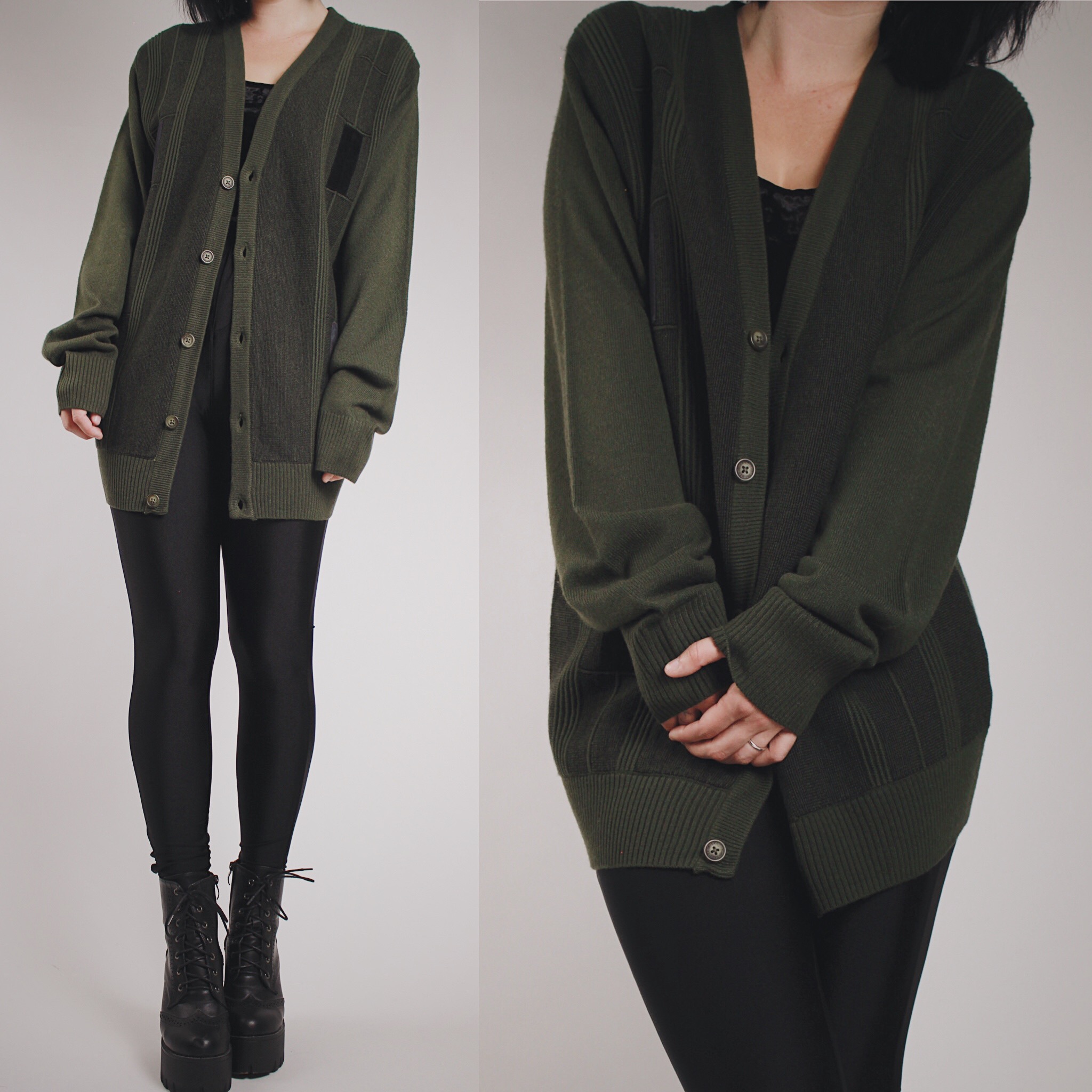 Vintage 90s olive green knit sweater. Unisex, meant to have a loose, slouchy fit. Small suede patches on the front - two black, two navy blue. Buttons down the front. Has a bit of stretch due to the nature of the fabric but is meant to have a slightly oversized fit.