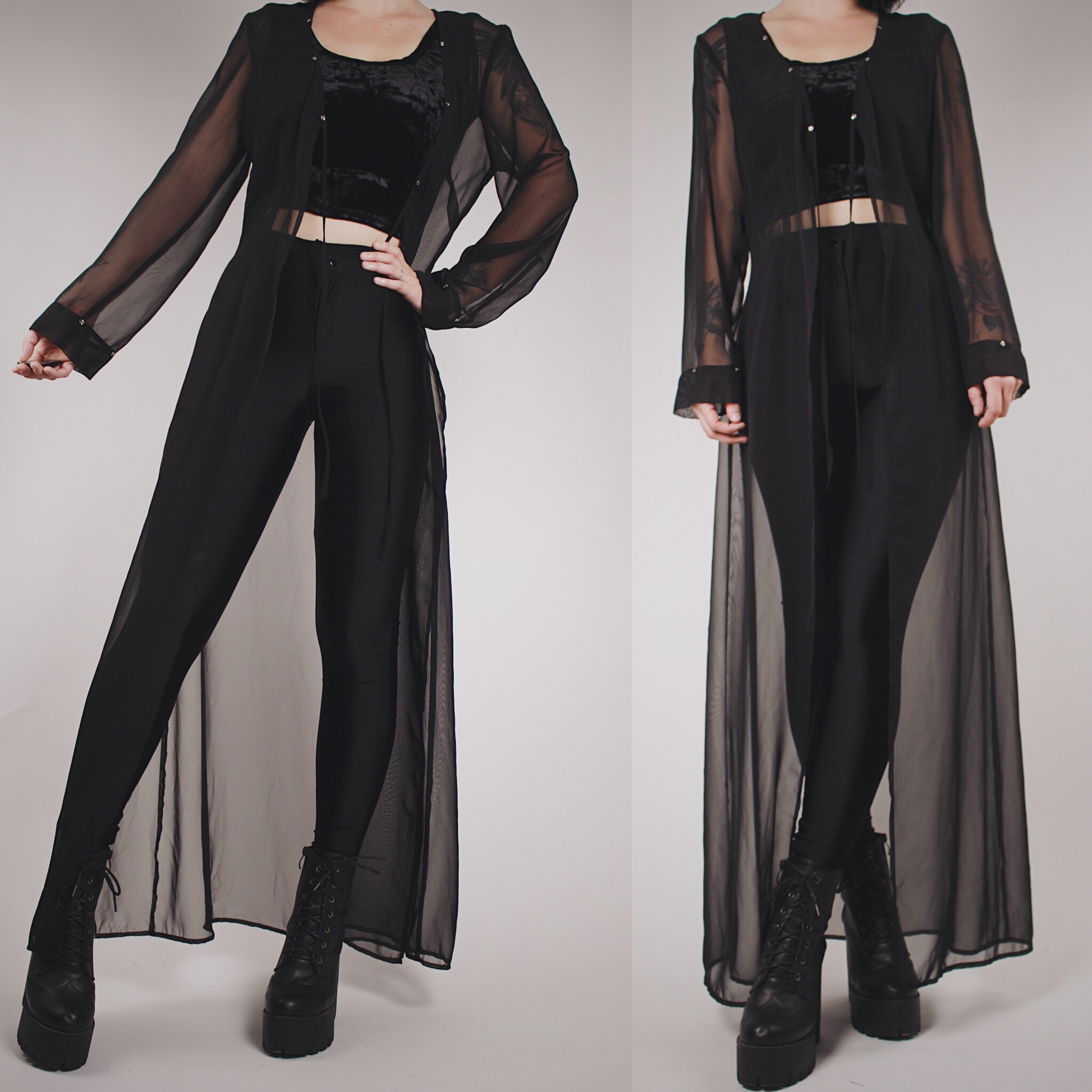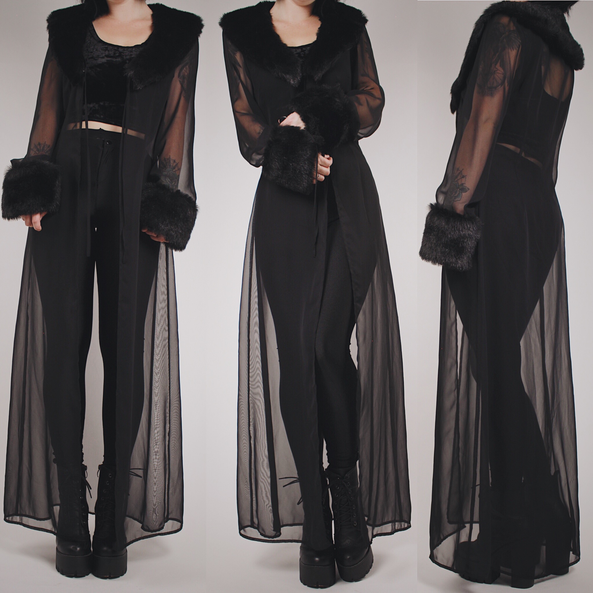 Vintage 90s black sheer dressing gown. Fully removable faux fur trim at the collar and cuffs! The trim is attached by tiny silver snaps and can be easily popped off. Gown ties at the front of the bust or can be worn open. Cuffed sleeves. Slight hourglass shape built into the length of the gown so it hugs your shape and emphasizes your curves while still flowing around you! Fabric has no stretch.
