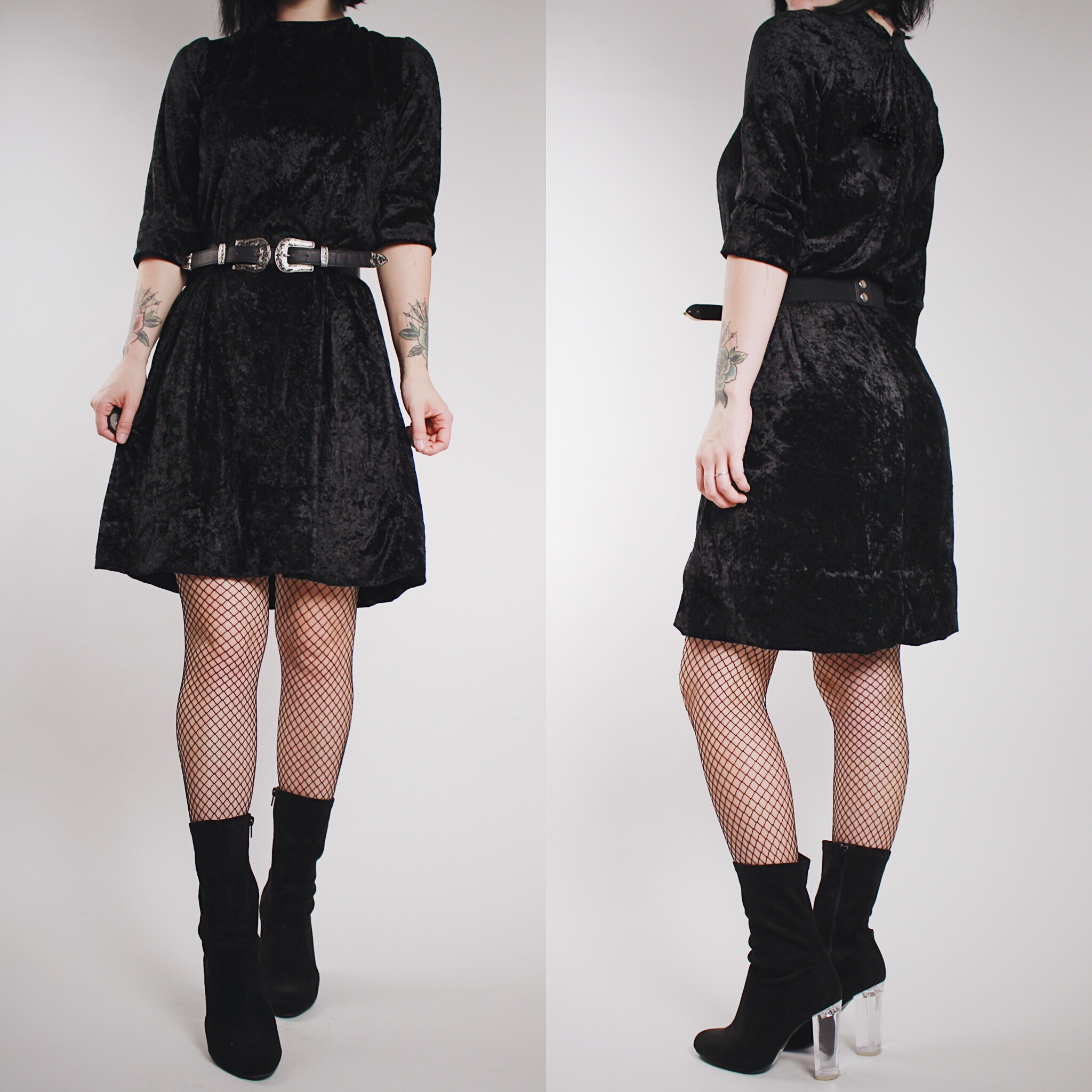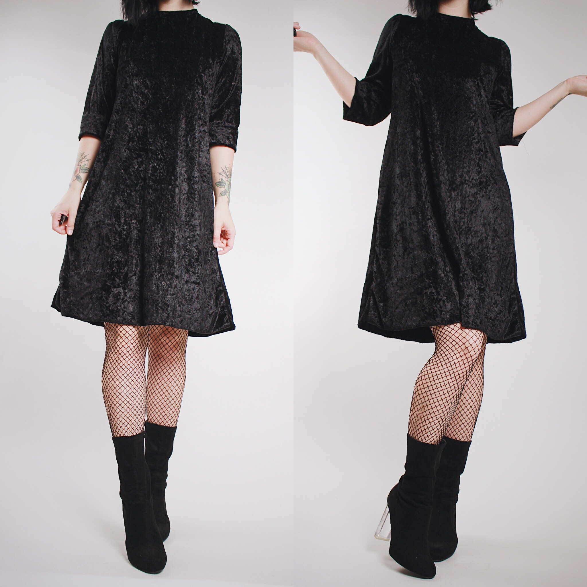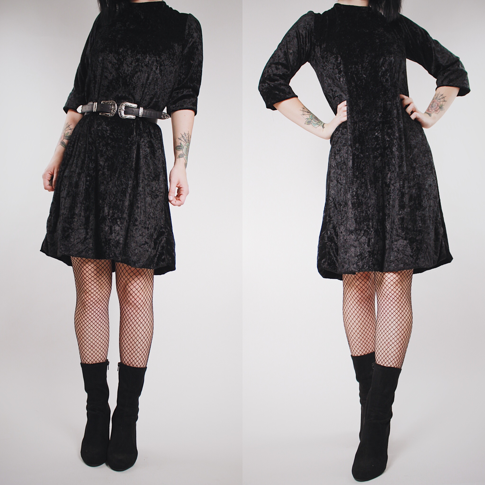 Vintage 80s black crushed velvet dress. High neck with a snap button at the back of the neck. Banded hemline. Banded cuffs can be folded up for extra detail. Thin fabric is unlined and slightly stretchy. Meant to hang loose and slouchy. Flares out slightly from the shoulders down - no defined bust or waist area. Looks amazing belted to emphasize your waist and avoid drowning in fabric! Belt is not included. This appears to be a handmade item - the seams are roughly sewn and unfinished on the inside - this is reflected in the price, as a piece like this would often go for much more.