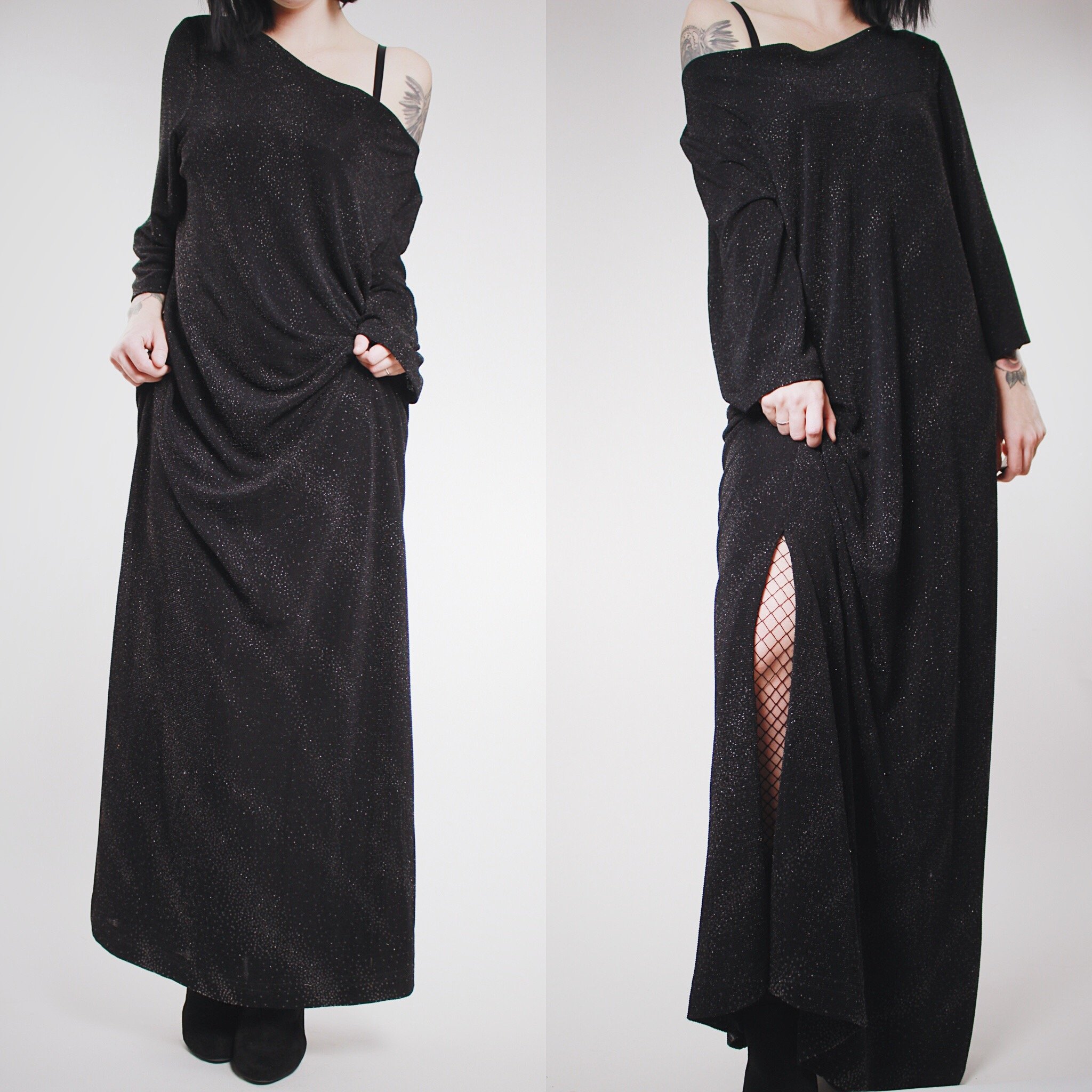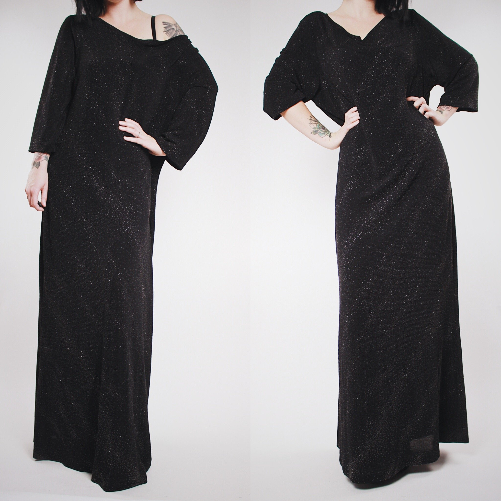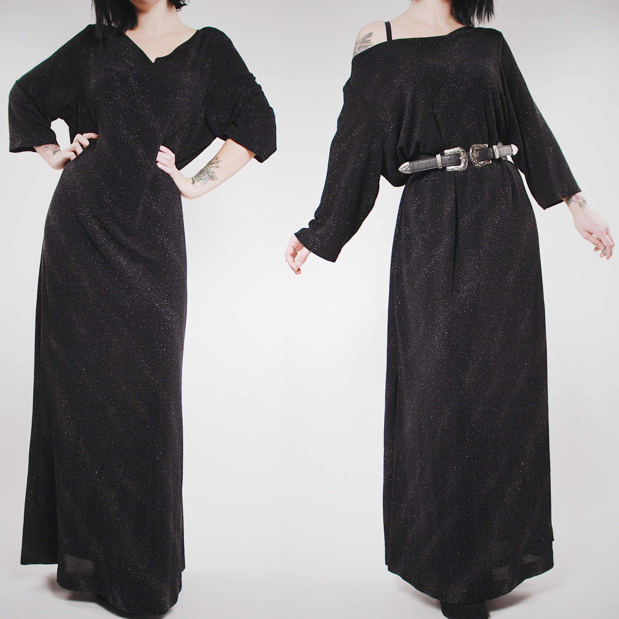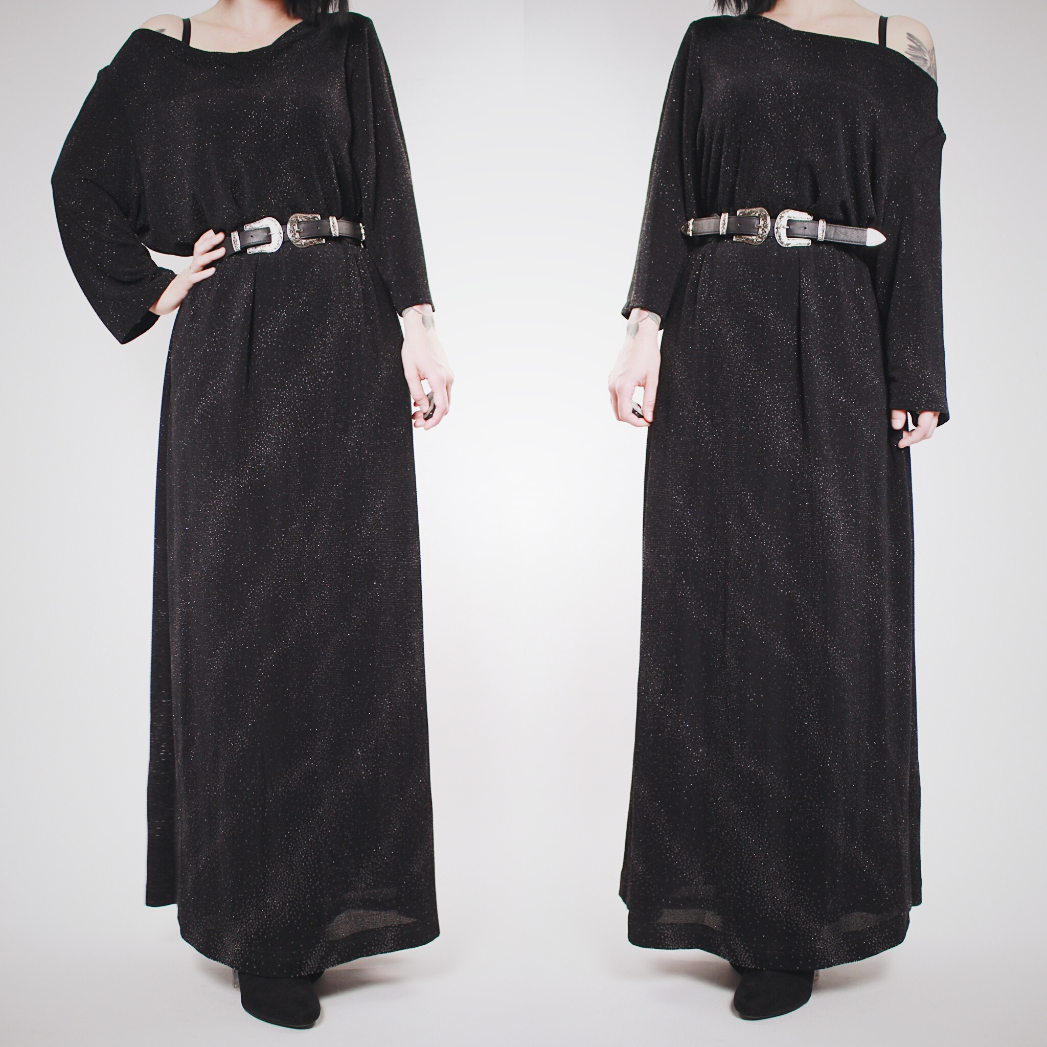 Vintage 80s galaxy gown!. Wide, banded neckline can be worn off one or both shoulders. Sleeves will hit between the wrist and elbow. Gorgeous, luxe, super stretchy jersey fabric with amazing 3D glittery embellished pattern all over. Meant to hang loose and slouchy. Flares out slightly from the bust down - no defined bust or waist area. Looks amazing belted to emphasize your waist and avoid drowning in fabric! Belt is not included.