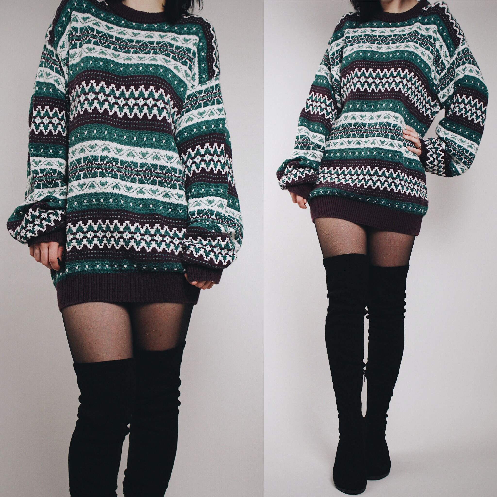 Vintage 90s slouchy knit sweater. Graphic print with purple, teal and white. Crew neck with contrasting purple ribbed trim. This is a longline cut so it would be great for someone taller or if you'd prefer to wear it as a dress and have it cover your bum! 100% cotton is super soft. This is the ULTIMATE staple sweater for fall and winter - cozy, oversized, and super comfy. Perfectly warm and great for layering. Has a small discoloration on the front near the bottom on one of the white panels - not noticeable when worn - this is reflected in the price. Looks amazing with leggings, skinny jeans, leather pants, bodycon layers and tights, tucked into skirts...the options are endless!