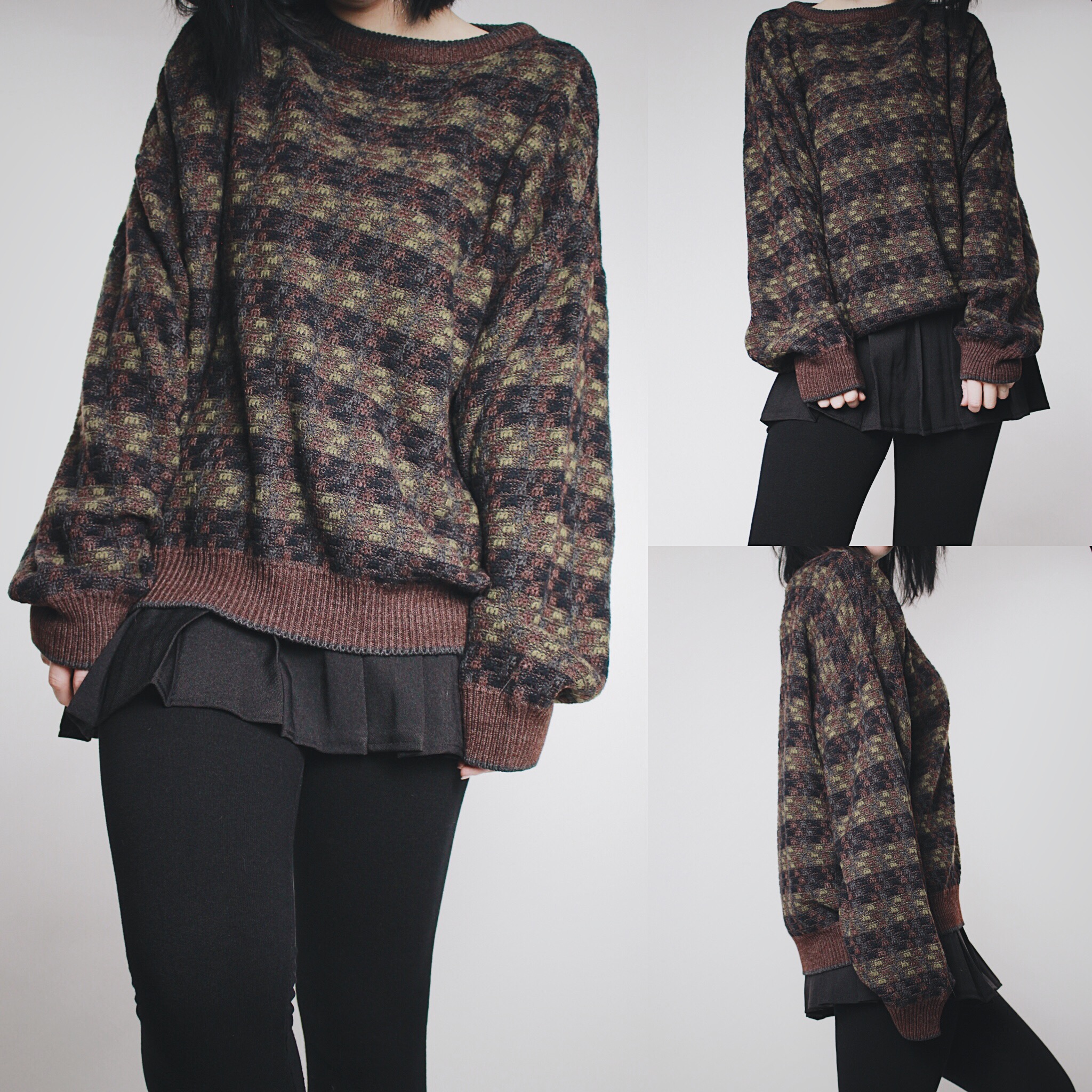 Vintage 90s slouchy sweater. Striped graphic print in burgundy, gray, black and olive green. This reminds me of something you'd wear on the way home from Hogwarts for the holidays. Crew neck with contrast ribbed trim. 80% acrylic, 20% polyester. This is the ULTIMATE staple sweater for fall and winter - cozy, oversized, and super soft. Mid-weight. Perfectly warm and great for layering. Looks amazing with leggings, skinny jeans, leather pants, bodycon layers and tights, tucked into skirts...the options are endless!