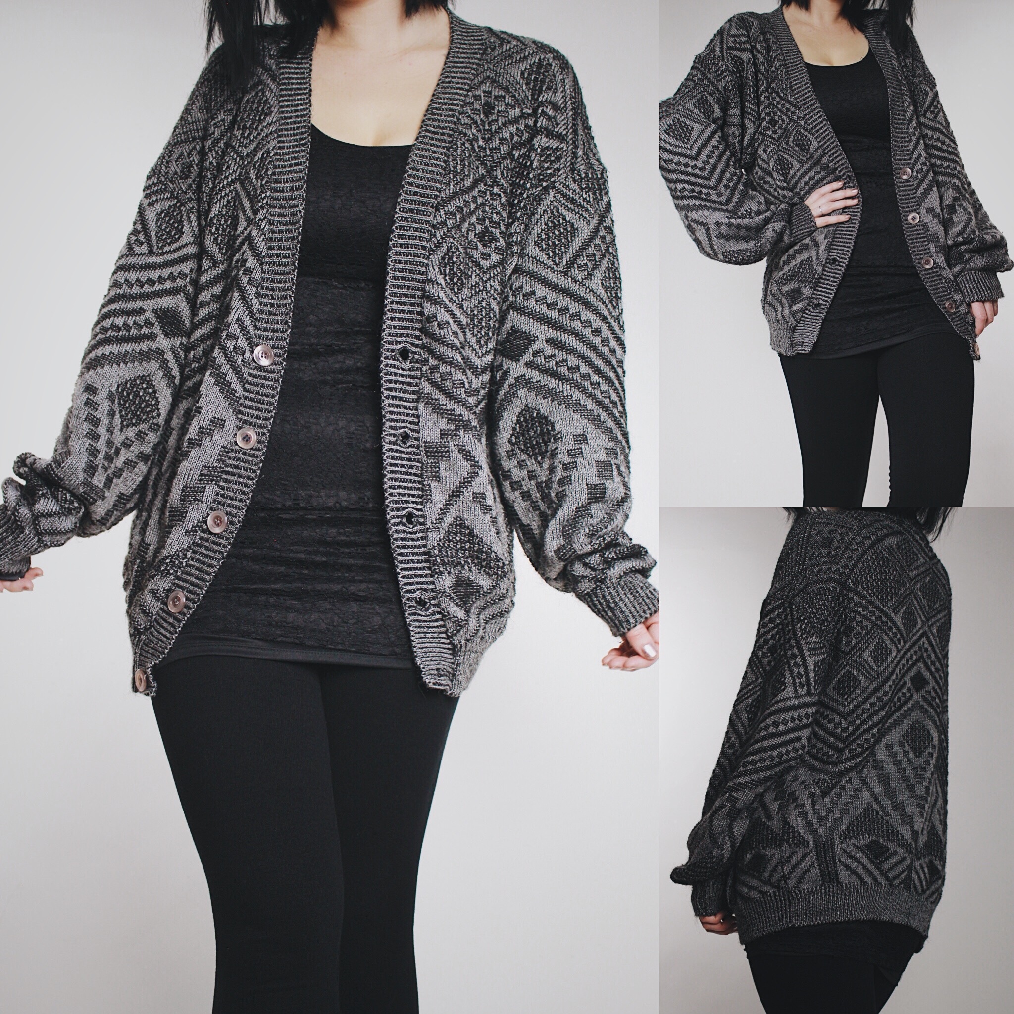 Vintage 90s slouchy knit cardigan. Graphic print in gray and black with ribbed trim. 100% acrylic. Super cozy. This is the ultimate comfy staple sweater! It has the PERFECT amount of slouch and a slight balloon sleeve. Meant to have a loose, oversized fit. Mid-weight and great for layering. Rose gold plastic buttons down the front. V-neck.