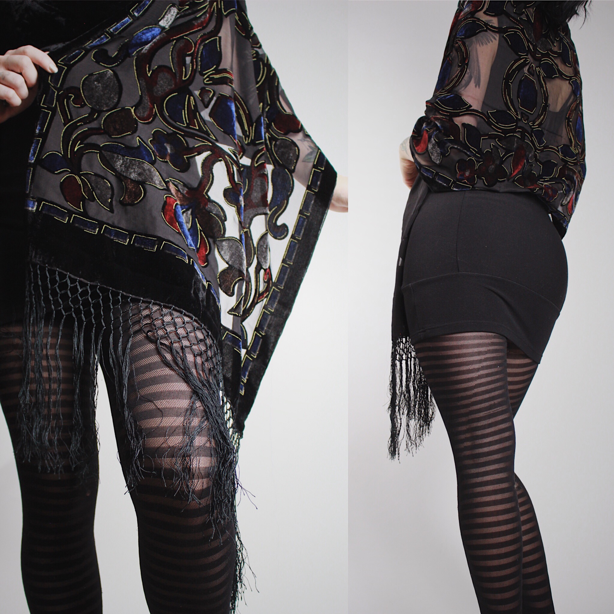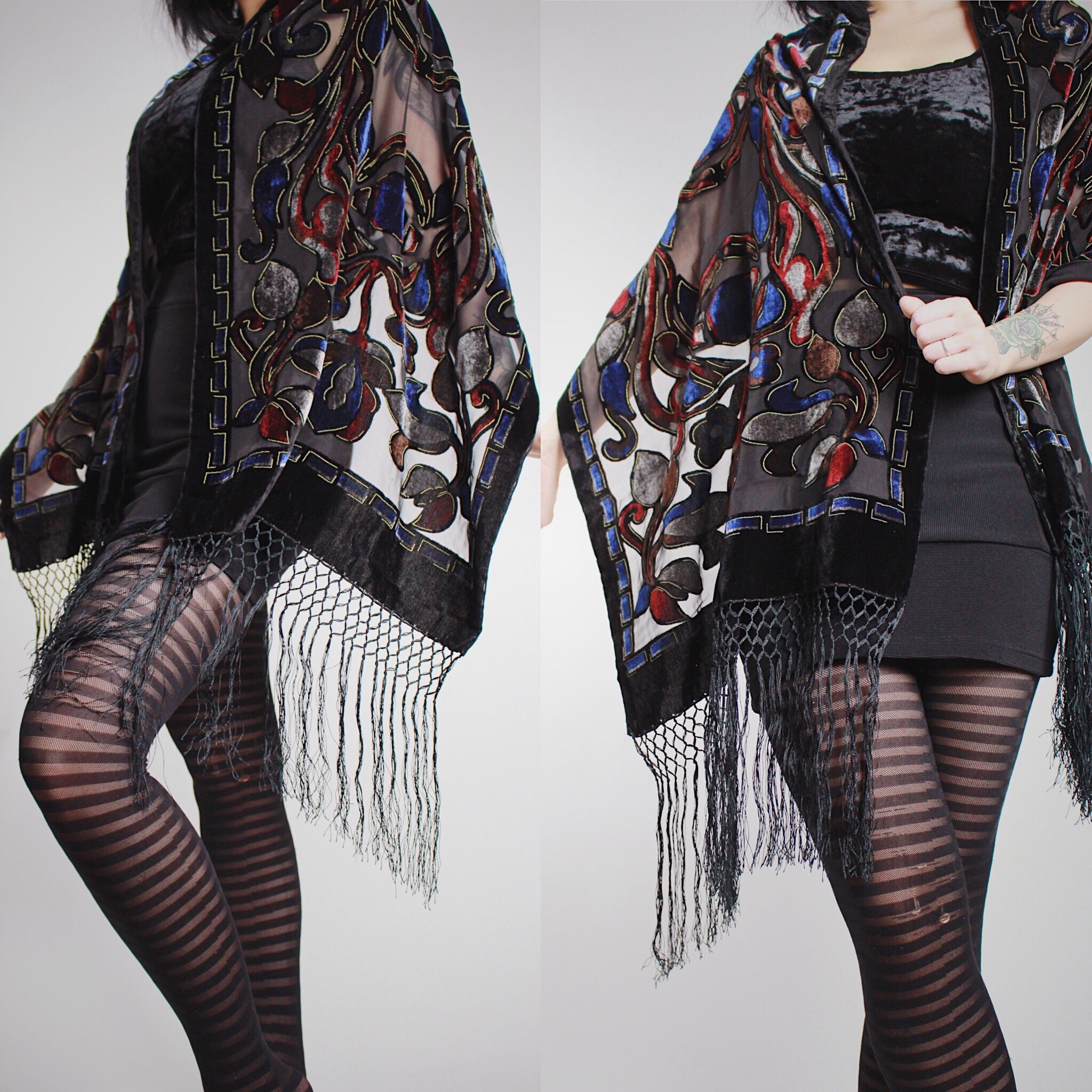 Vintage 90s velvet and sheer burnout shawl. Gorgeous royal blue, blood red, and silver 3D velvet floral pattern with gold detail threading on a black sheer background. Black velvet trim and black piano fringe. Fringe is very delicate and a bit tangly but it can be trimmed to your liking or removed entirely (I would just shorten it a bit to clean it up.) Sold as is, imperfection reflected in price. Rectangular, measures 65" by 20" with about 8" of fringe on either end. This is a perfect throwover piece for chilly nights and can be layered as a scarf, flowy top, belted as a wrap top, worn over the shoulders, or even as a belt or wrap skirt! Super unique and perfect for holiday outfits. Stevie Nicks would be proud. One size fits most.