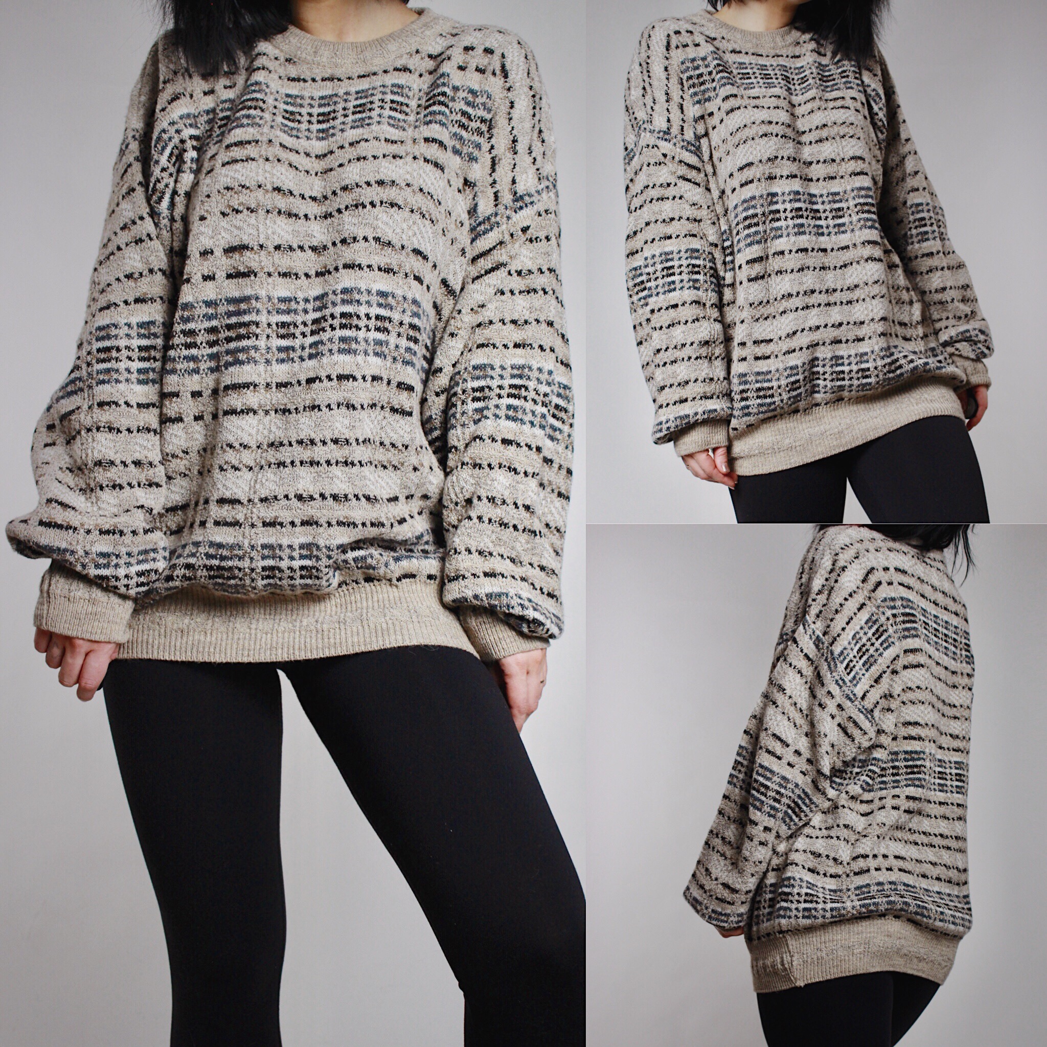 Vintage 90s slouchy knit sweater. Striped graphic pattern with brown, black, white and gray on a oatmeal-cream heathered knit. Crew neck with ribbed trim. 75% Italian acrylic and wool blend. This is the ULTIMATE staple sweater for fall and winter - cozy, oversized, and soft. Midweight, but nice and warm. Perfect for layering. Looks amazing with leggings, skinny jeans, leather pants, bodycon layers and tights...you will want to live in this sweater. Wear it while you sit by the fire with cider or hot cocoa. Or wine.
