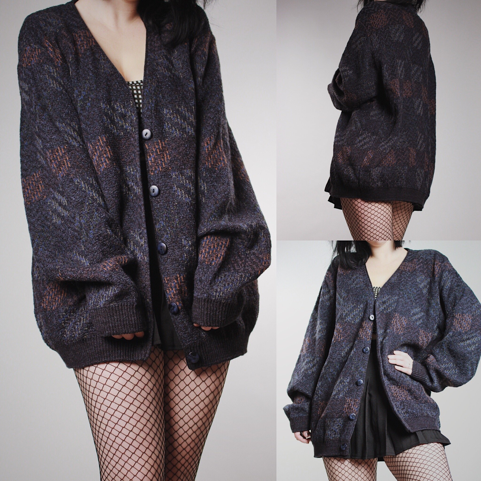Vintage 90s slouchy knit cardigan. Graphic print with orange and green on marled navy. 100% acrylic. Super cozy and not itchy! This is the ultimate comfy staple sweater and you will end up living in it. Meant to have a loose, oversized fit. Warm, mid-weight and great for layering. Buttons down the front. V-neck.