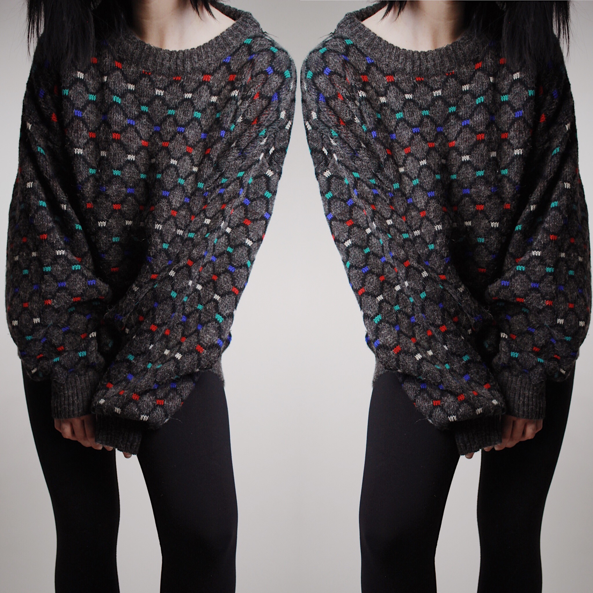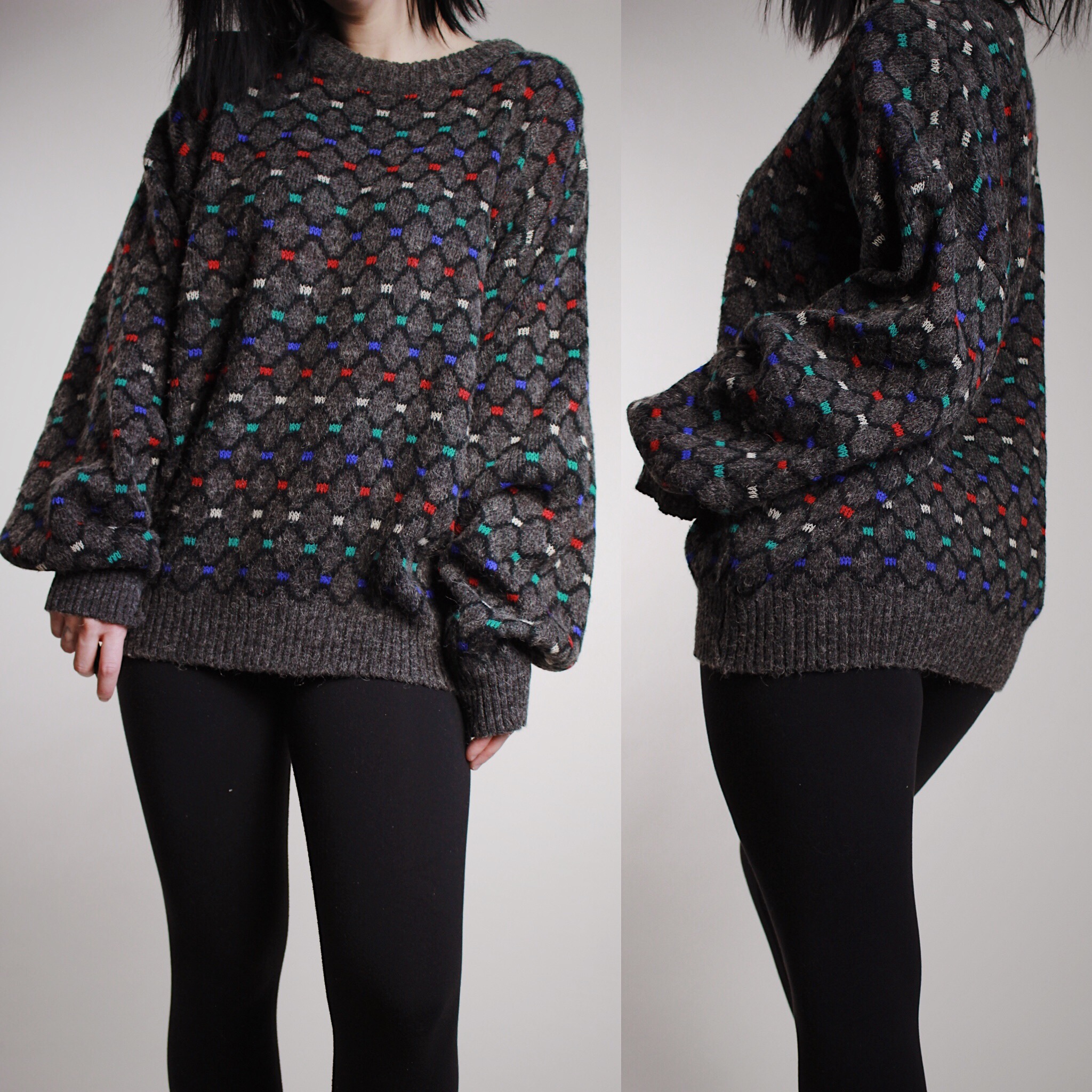Vintage 90s slouchy knit sweater. Geometric graphic pattern with gray, green, red, royal blue and black on dark gray. Crew neck with ribbed trim. 89% acrylic and 11% nylon.This is the ULTIMATE staple sweater for fall and winter - cozy, oversized and super comfy with a one-of-a-kind unique print. Mid to heavyweight, nice and warm. Perfect for layering. Looks amazing with leggings, skinny jeans, leather pants, bodycon layers and tights...you will want to live in this sweater. Wear it while you sit by the fire with cider or hot cocoa. Or wine.