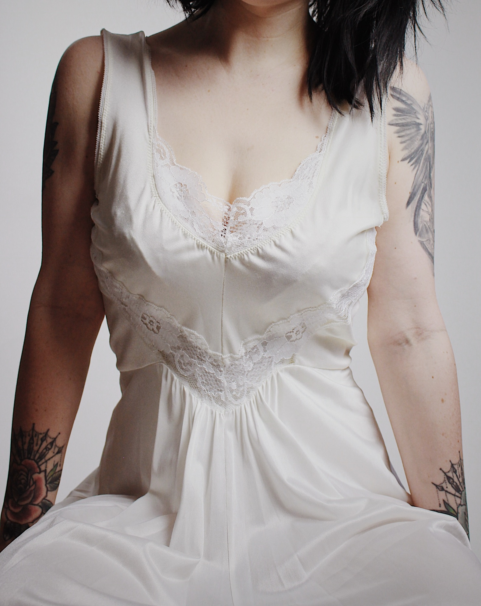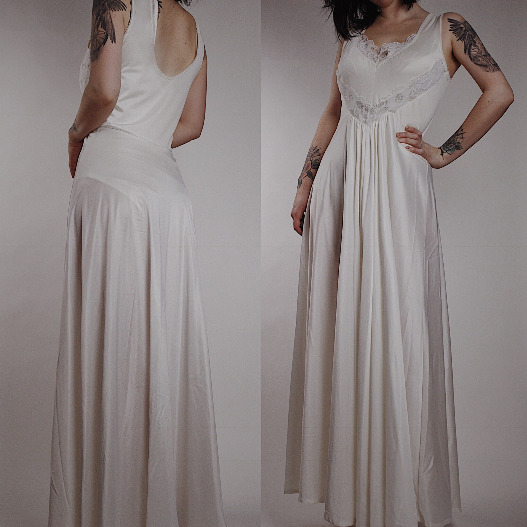 Vintage 1970s ivory satin and lace dressing gown. Full floor length with a super flowy circle skirt - tons of excess fabric that swirls around you when you walk! High waist, strapless cut, v-neck with sheer lace trim and lace cutout detailing at the bodice. Stretchy, pull-on style. Gorgeous cream off-white color. Soft, comfortable and super glam. Can be worn as loungewear, paired with a cozy oversized duster cardigan or robe. This may have been a bridal nightgown. Stunning condition for its age. I'm dying to see someone wear her for a spooky photoshoot. Ghostly glam vibes.