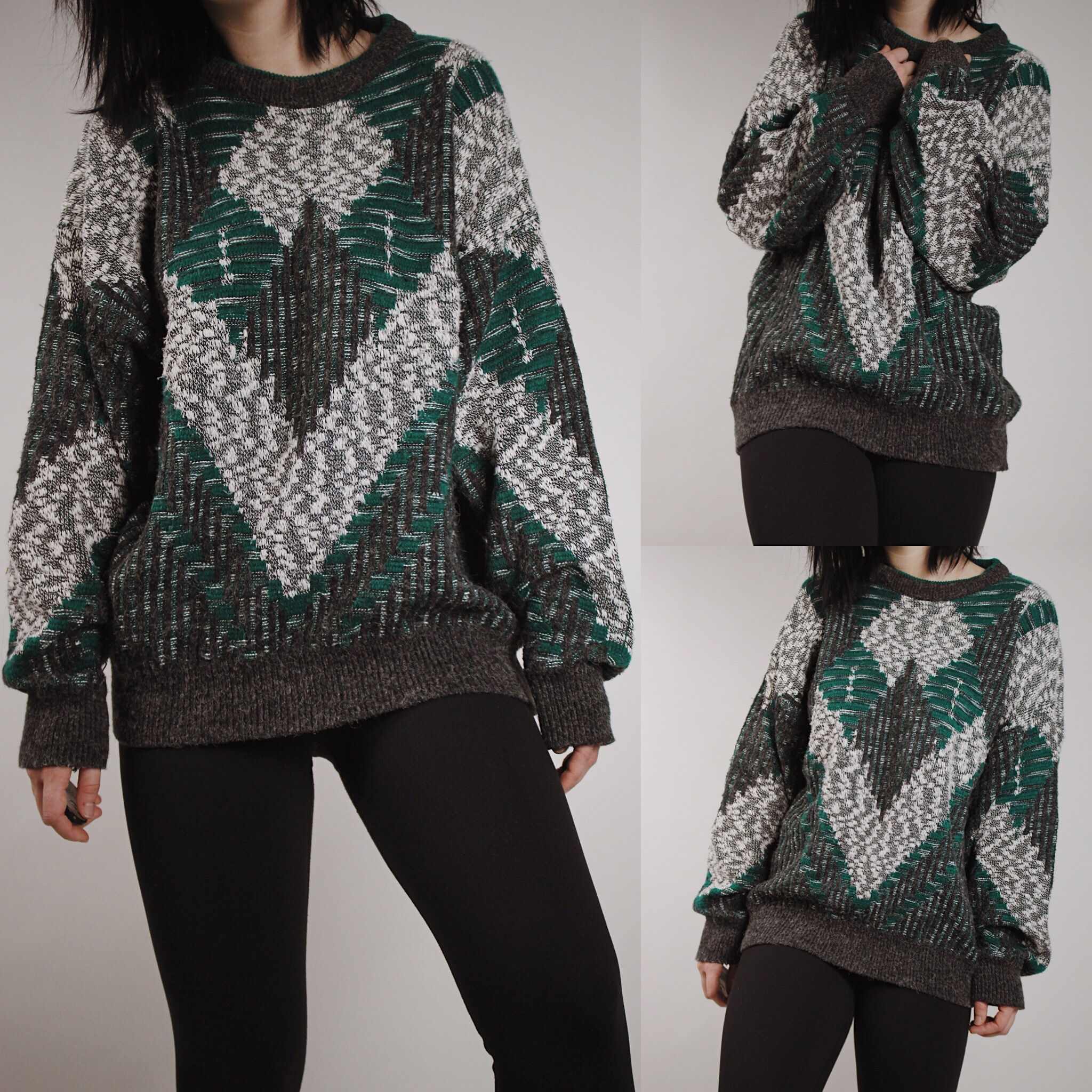Vintage 90s graphic slouchy knit sweater. Chunky knit with white, dark gray and forest green print. Crew neck with ribbed trim. 83% acrylic, 12% nylon, perfectly broken in and super soft. This is a perfect winter staple sweater - cozy, oversized and super comfy. Midweight to heavyweight, nice and warm. Perfect for layering. Looks amazing with leggings, skinny jeans, leather pants, bodycon layers and tights...you will want to live in this sweater. Wear it while you sit by the fire with cider or hot cocoa. Or wine.