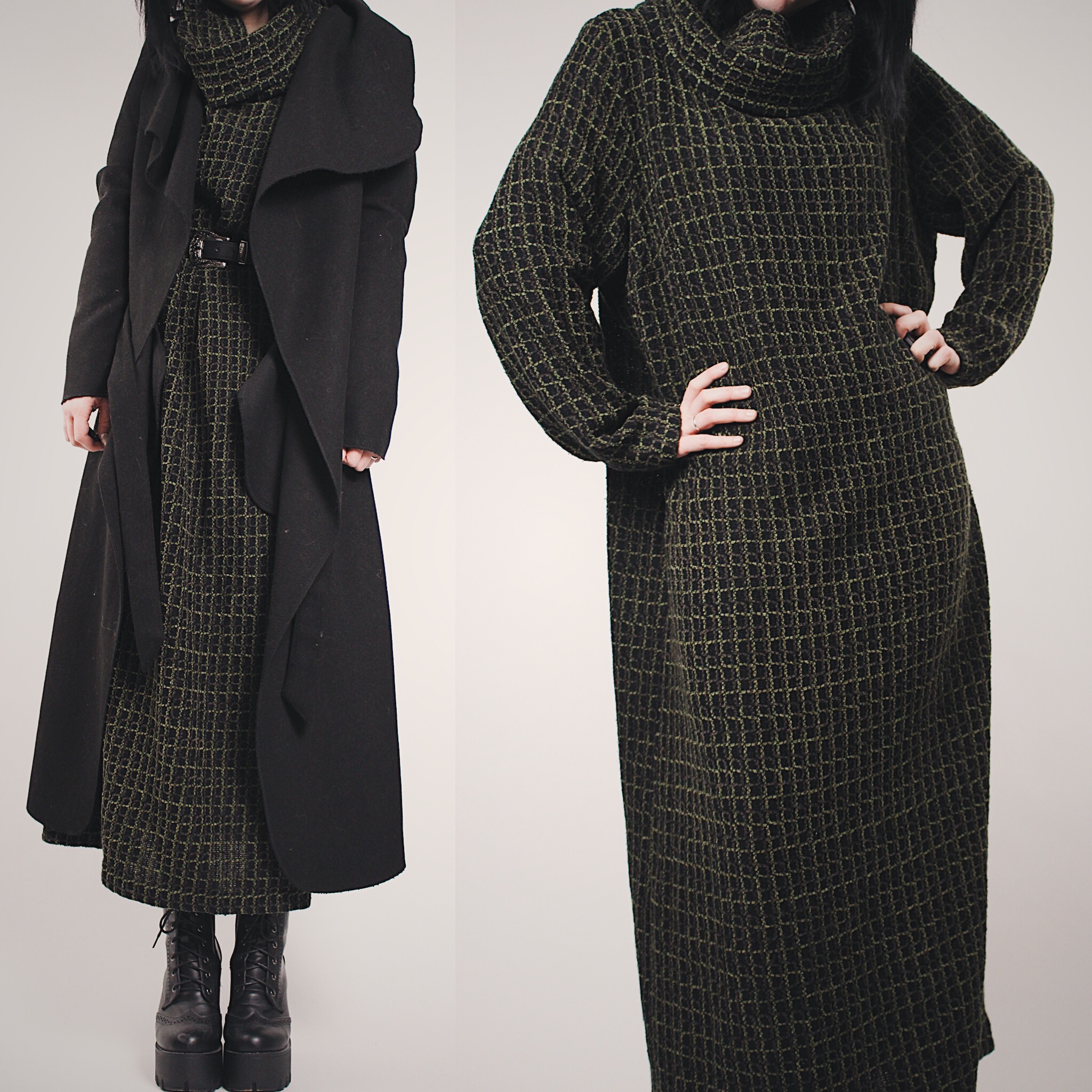 Super cozy with a black and green grid pattern chenille knit. Extremely soft. Slouchy foldover cowl neck isn't too tight but will still keep you nice and warm. Meant to have a slouchy oversize fit but adding any belt will give it some shape and keep you from drowning in fabric. Maxi length will hit between the knee and ankle on most people. I have never seen anything like it!