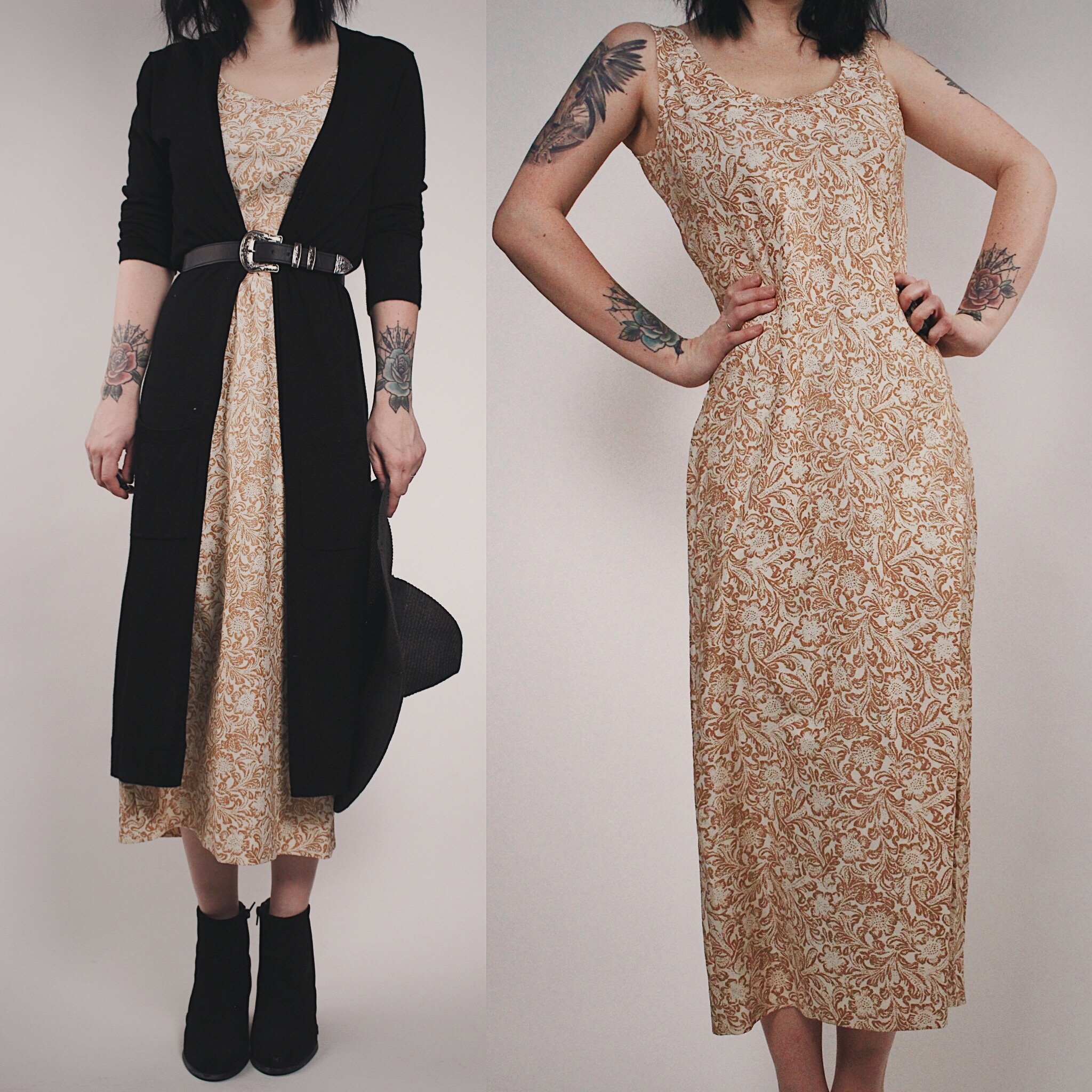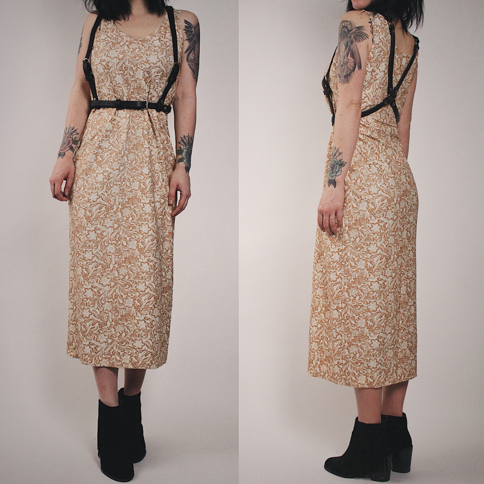 Vintage 70s "Lana" floral maxi dress. 3D prairie inspired tan floral print on cream. No fabric tag but it is a neat sort of thin, lightweight, breathable, slightly stretchy cotton poly-blend. Perfect for spring and summer or can be layered up for transitional weather. Cardigan, harness and belt not included but any of these would be great styling options! Sleeveless, scoop neck and a straight cut all the way down. No slits.
