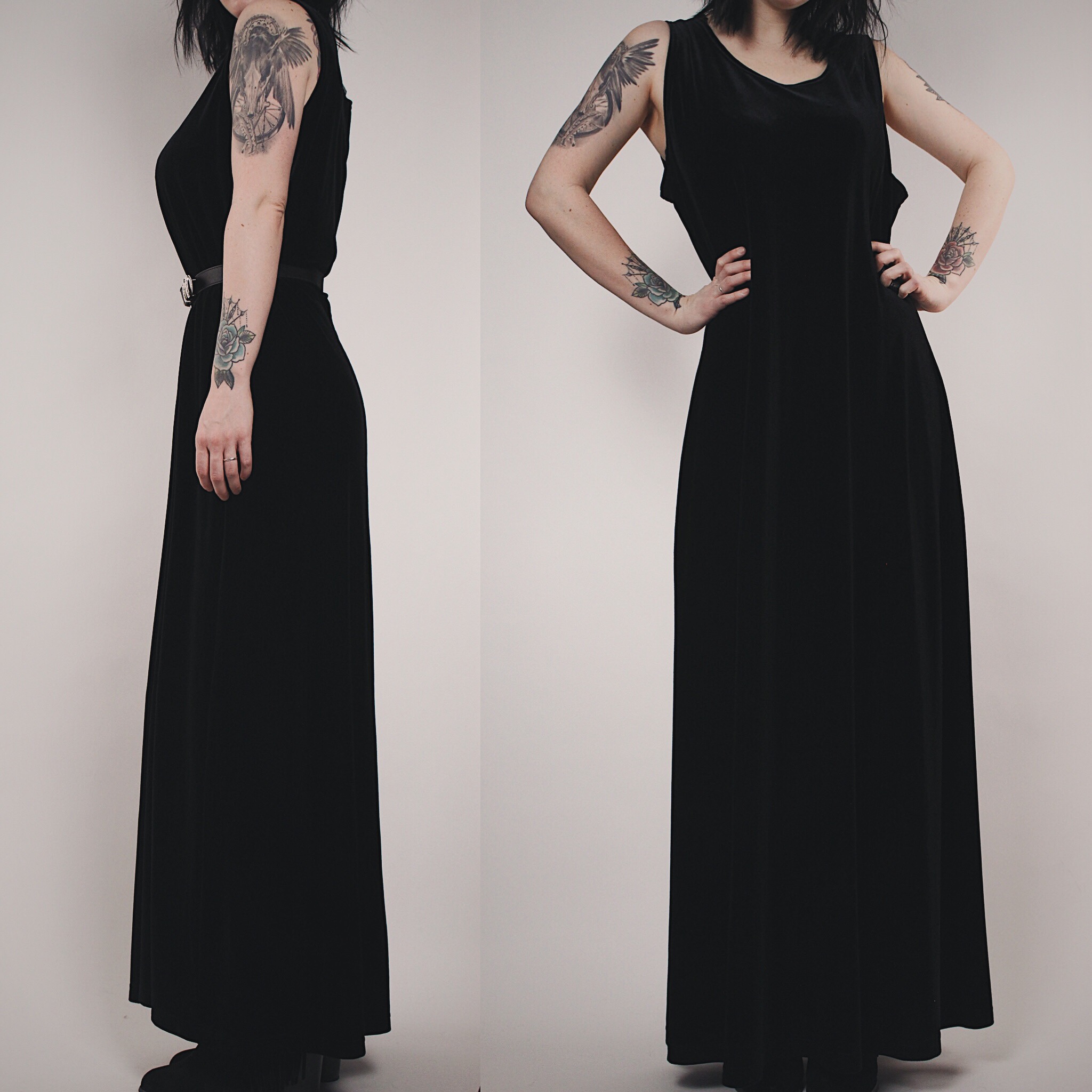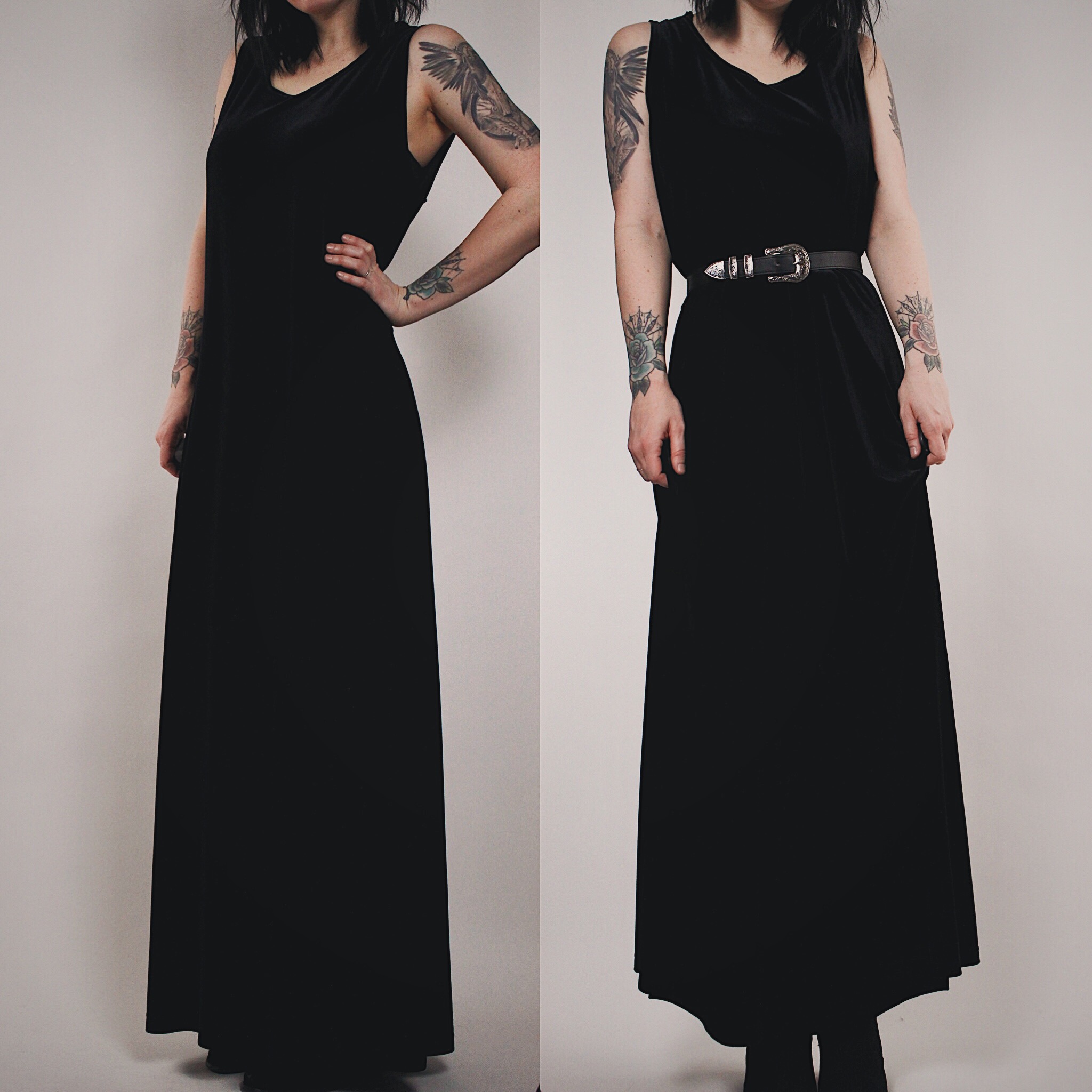 Vintage 80s "Rayna" black velvet classic witch gown. Maxi length with a scoop neck and sleeveless cut. Unlined, super soft and very stretchy. The perfect spooky staple dress! Great for fall and winter layering and can be styled a million different ways.