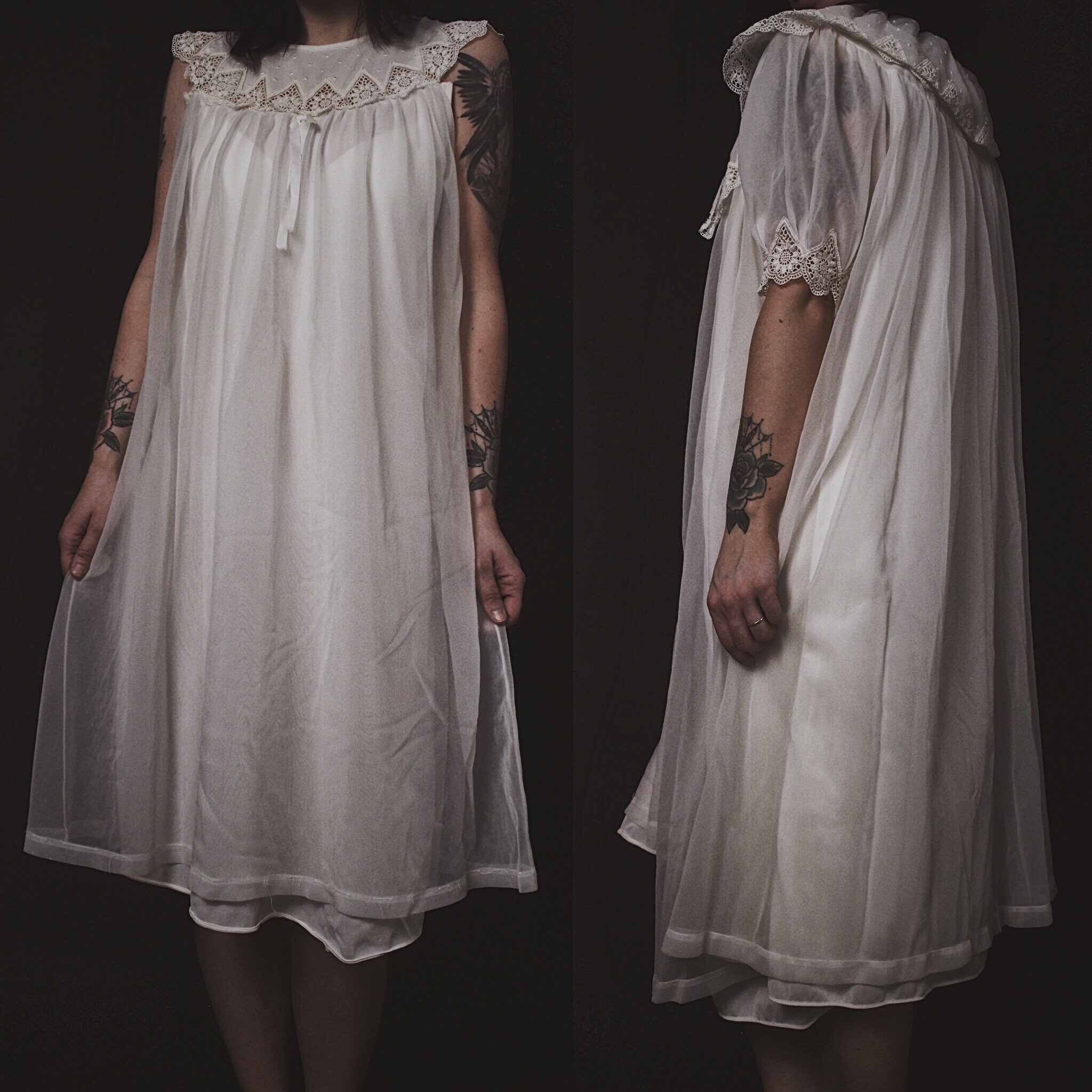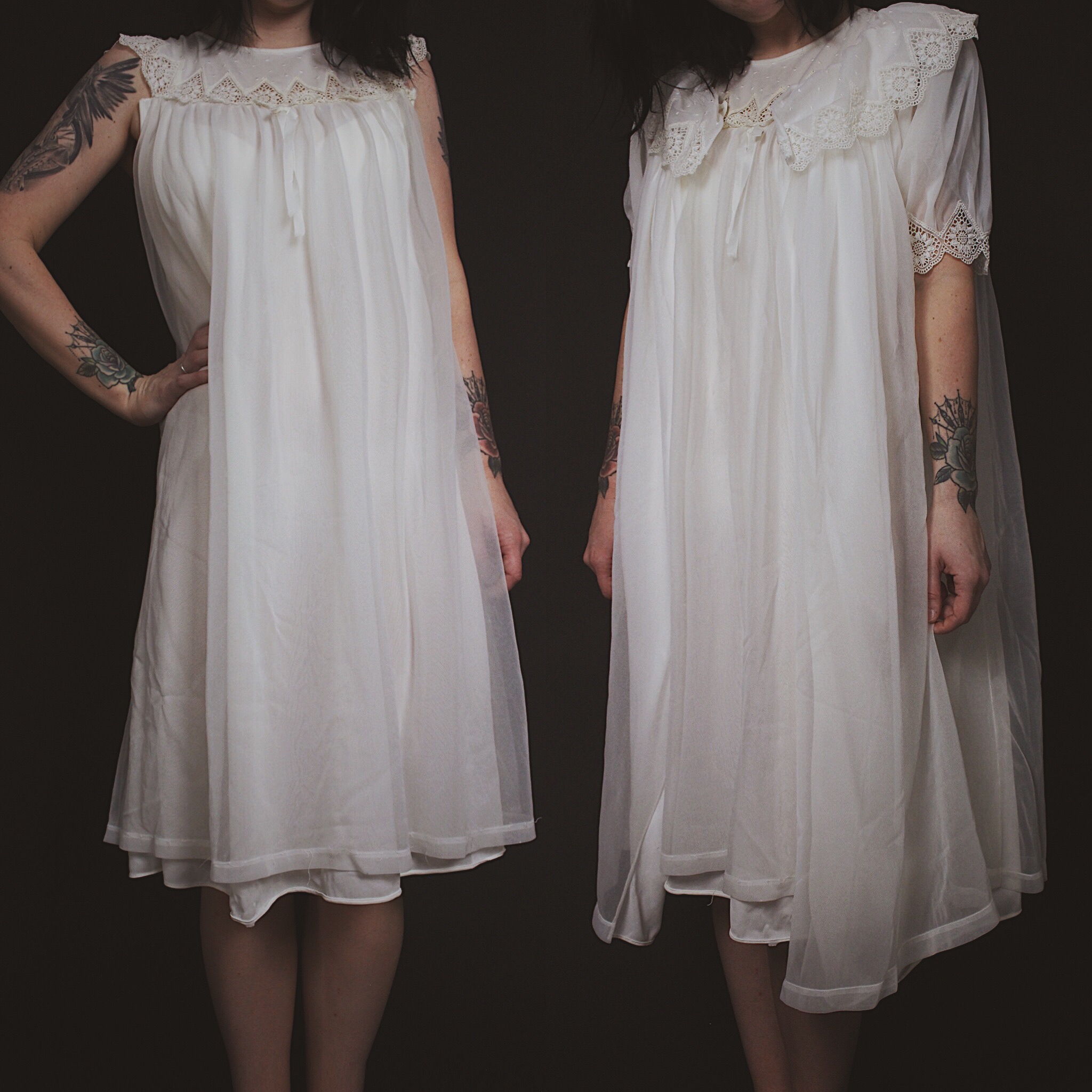 Vintage 60s ivory (off-white) chiffon babydoll nightie set. Sleeveless short nightgown with a matching puff-sleeve robe. Matching crochet lace trim on both pieces. Robe has a foldover collar and pearlescent button closure. No stretch. Flowy fit, flares out slightly from the shoulders on both pieces - true babydoll cut. Multiple layers of fabric gives this set an extra spooky, haunted doll-like vibe.