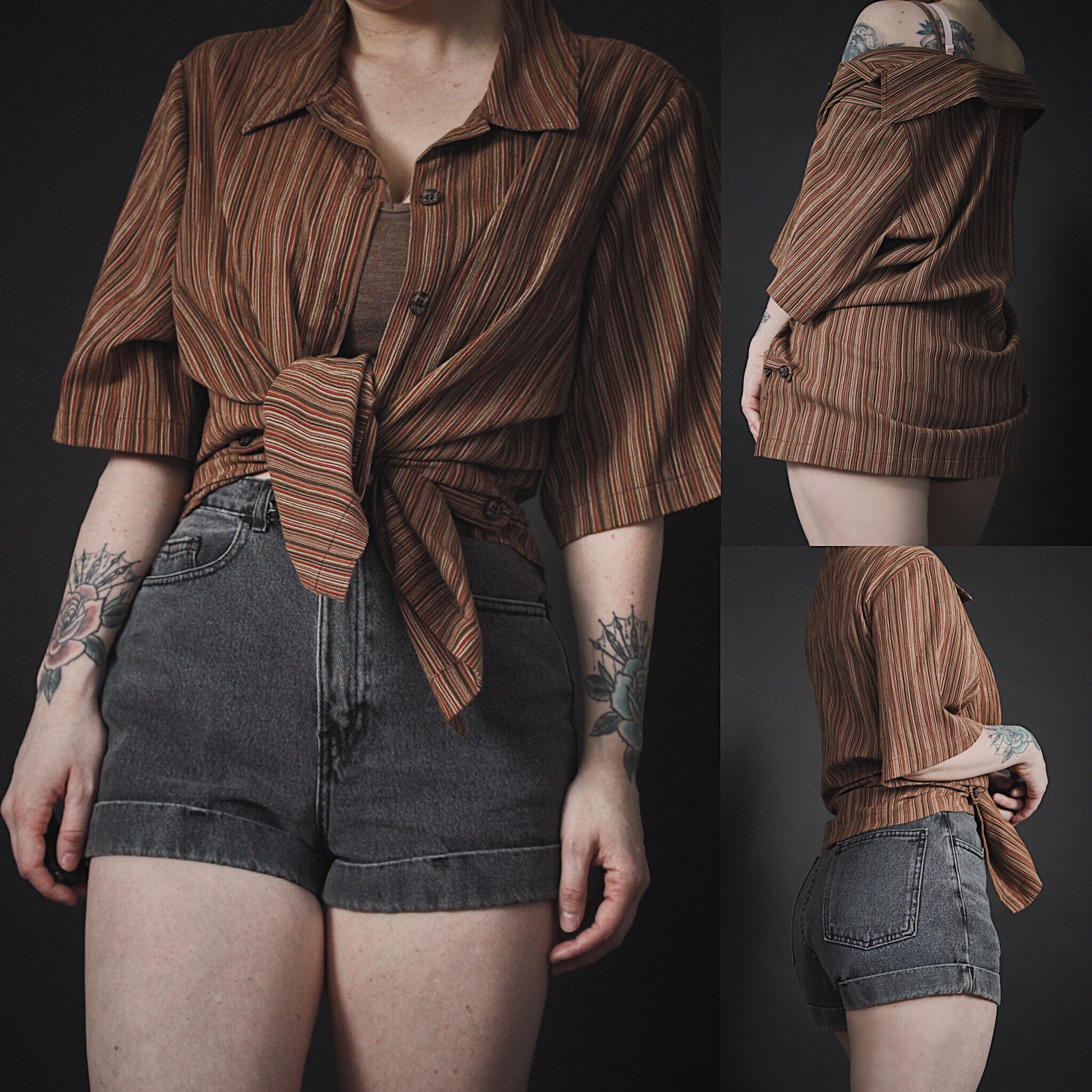 Vintage 90s button down shirt. Brown, red, black and tan striped pattern. Short sleeves and a classic collar. Longline cut with low hip pockets in front. Cotton/poly blend material is super lightweight, breathable and comfortable - perfect as a throwover piece for warm weather. This is the BEST kind of top to take on a vacation, since you can wear it over pretty much any dress, top, swim suit, or romper but still be comfortable. Knot it up around your waist for chic beachy vibes, tuck it in, or wear it open and flowy. Loose, boxy shape.