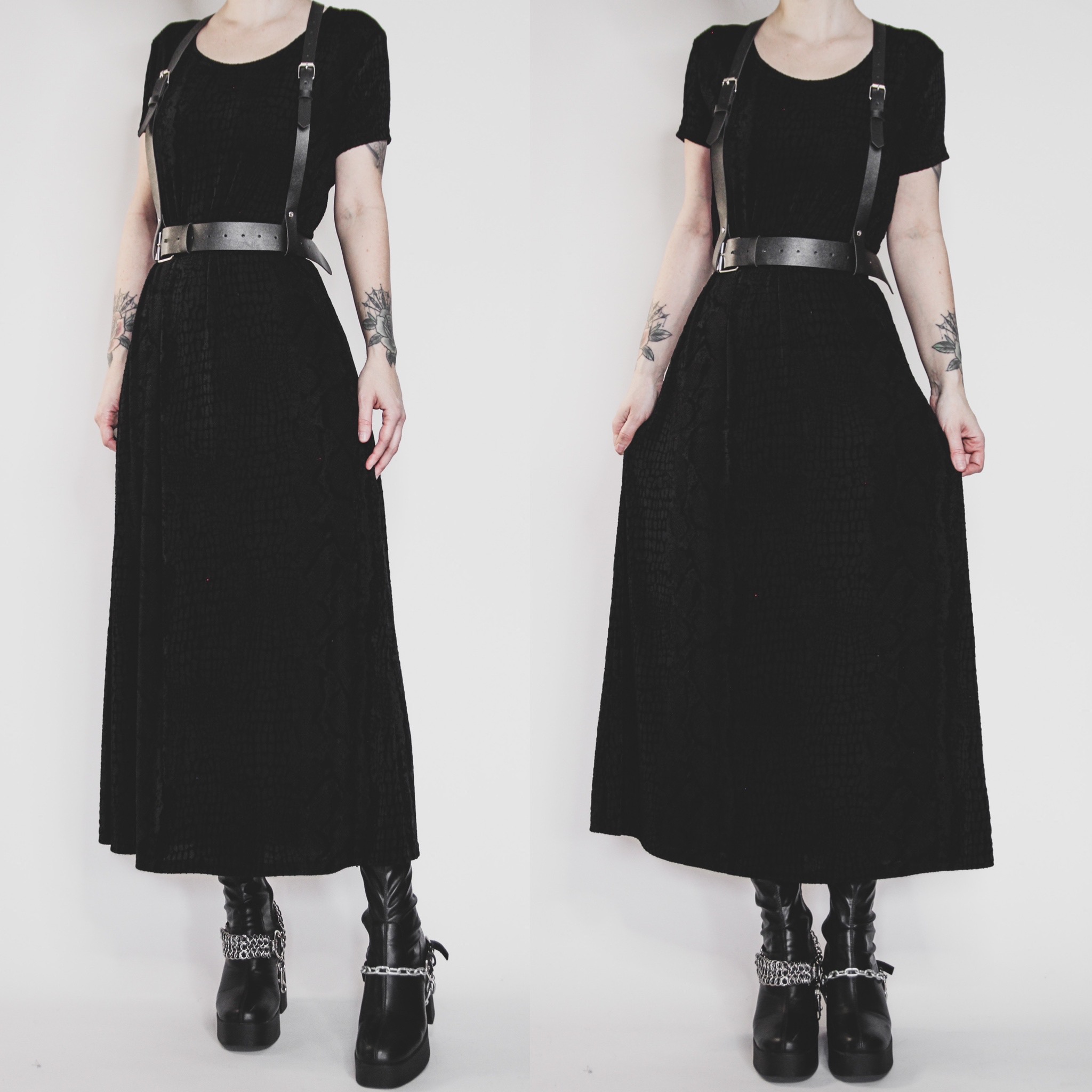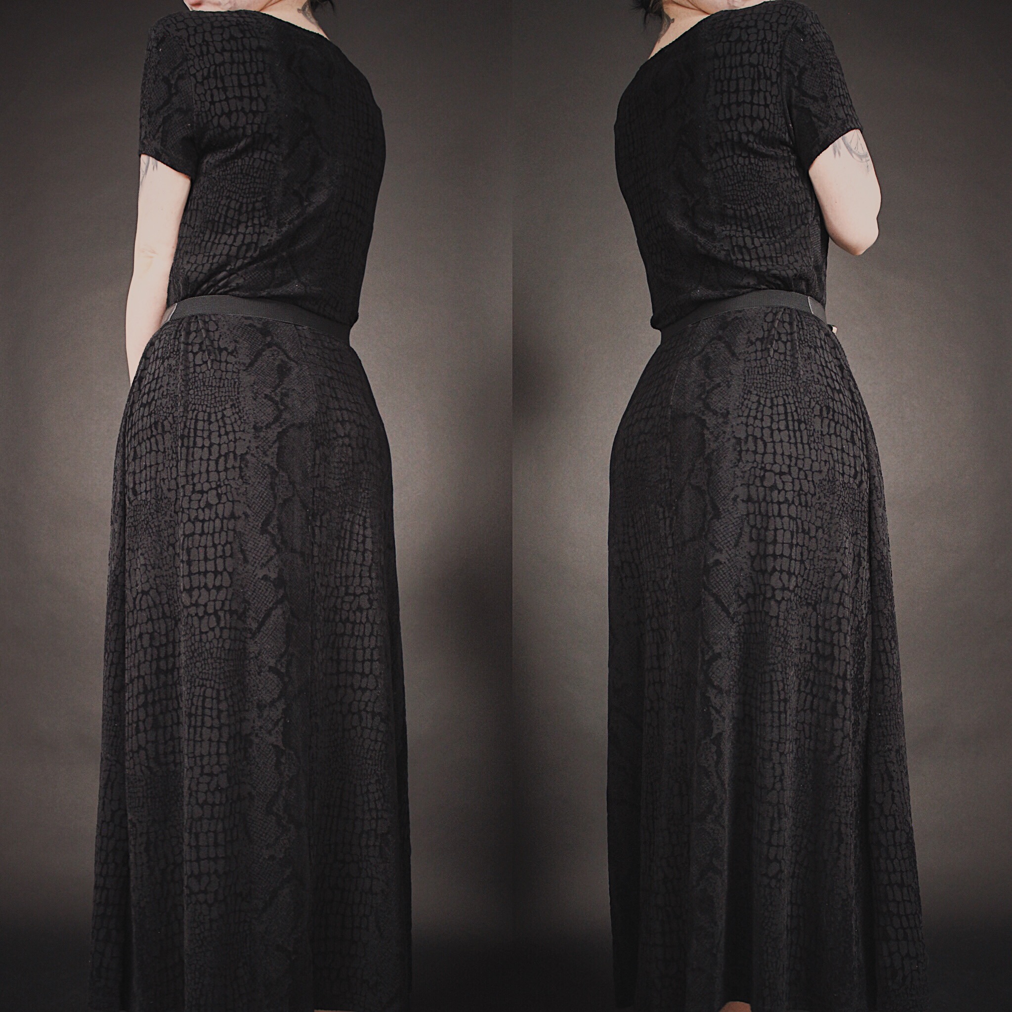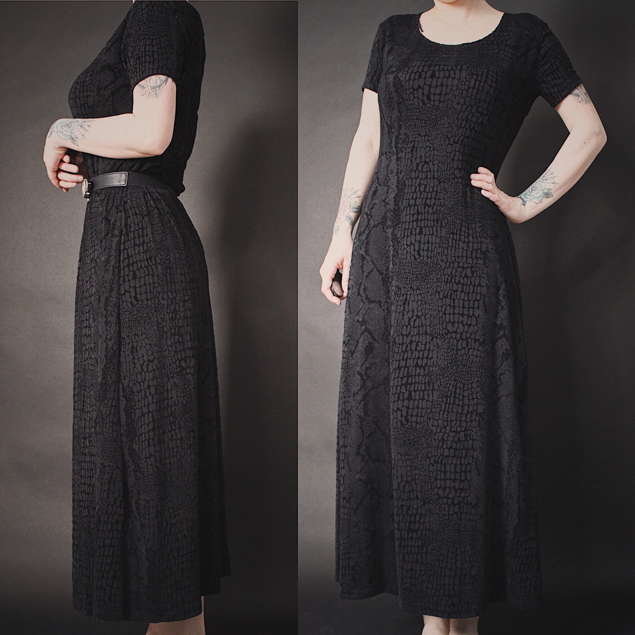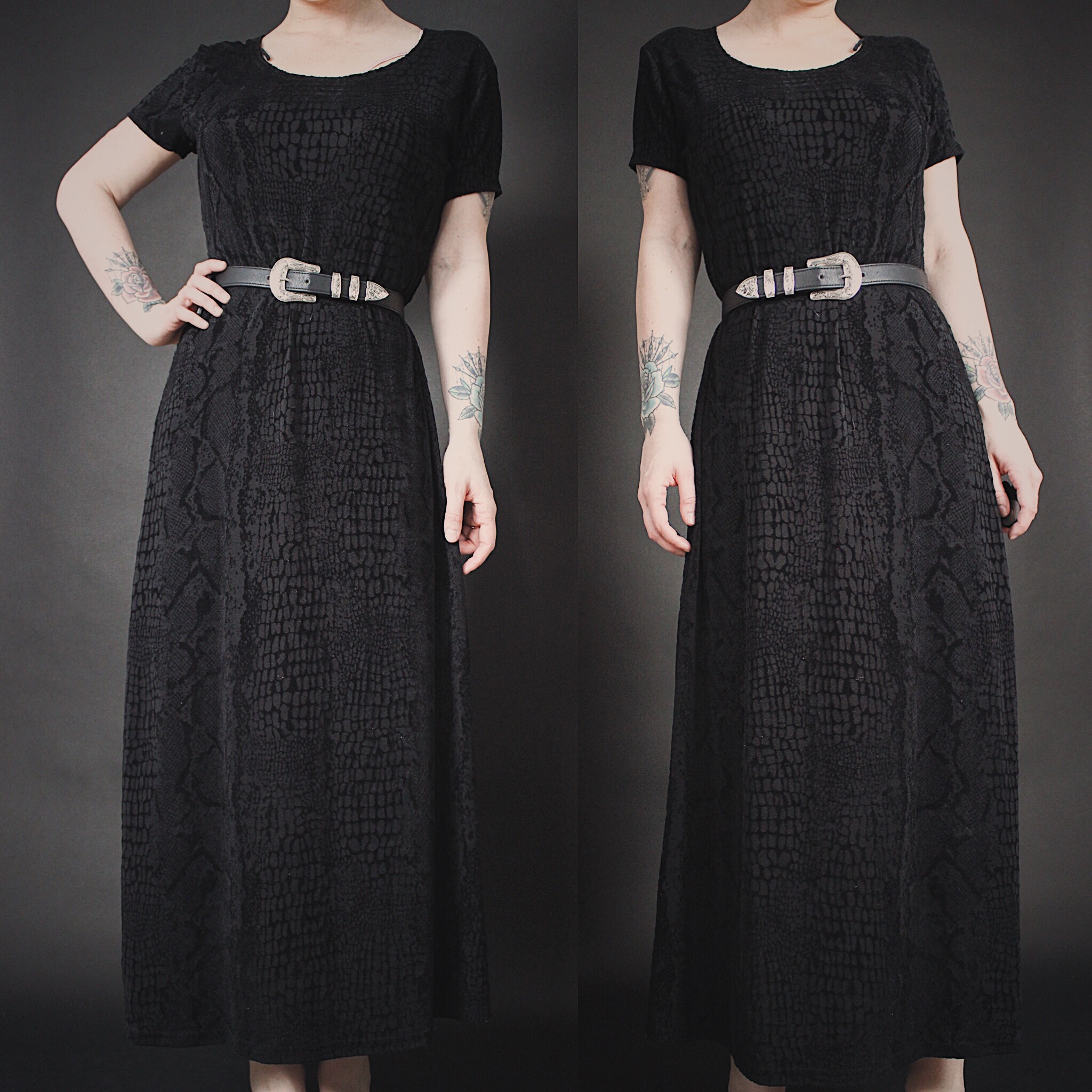 Vintage 90s black jersey maxi dress. Super cool velvet burnout snakeskin print. Very stretchy, slinky, lightweight and comfortable. Pull-on style, unlined. 92% poly, 8% spandex. May be slightly sheer in direct light so you may want to wear bike shorts, a bodysuit, or a slip underneath. Belt not included.