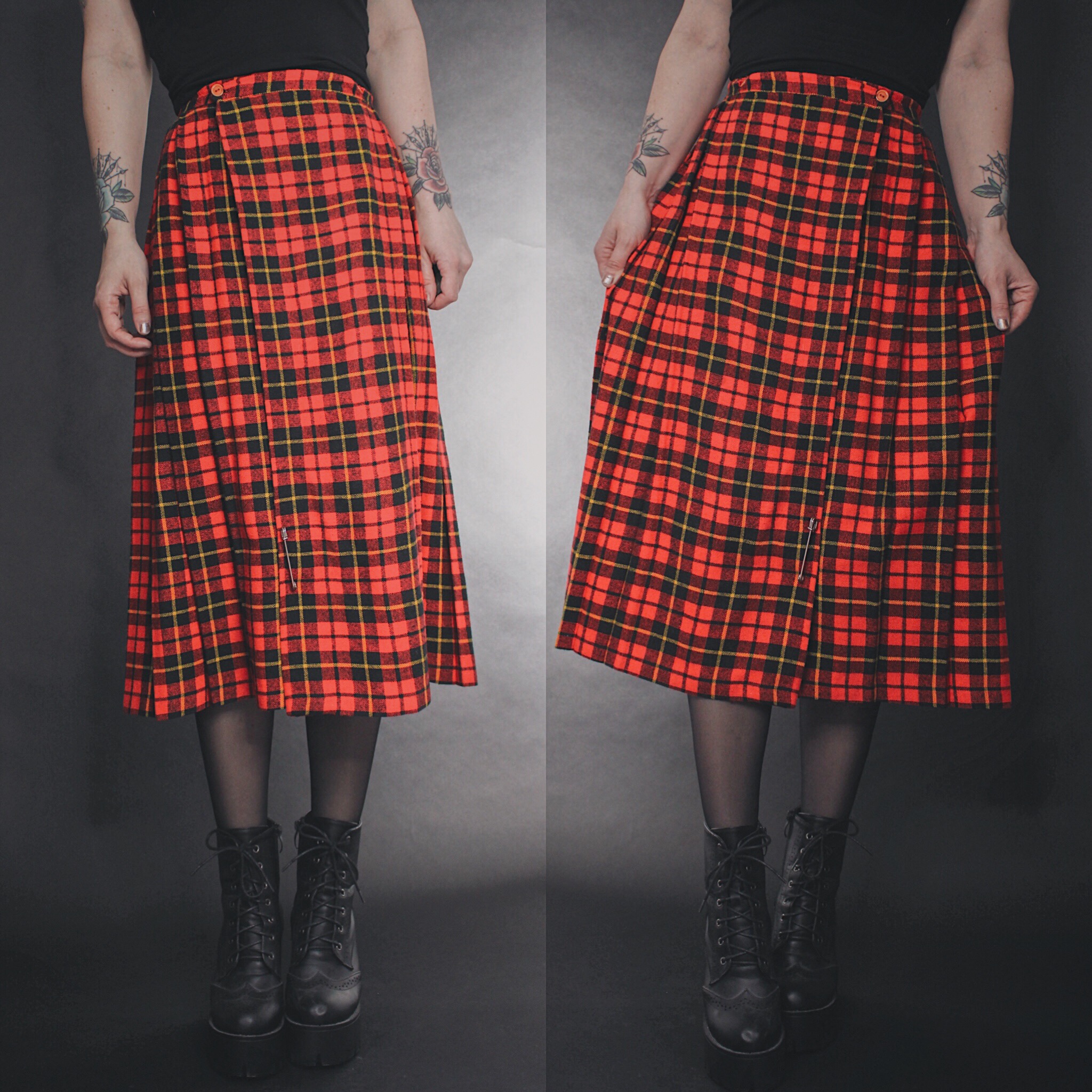 Vintage 90s red, black and gold plaid flannel maxi skirt. I am loving plaid skirts lately and this print is extremely trendy right now. Full, pleated kilt-style wrap situation. Double button closure at the top and an oversize safety pin to keep the bottom closed. 100% cotton is breathable, easy clean and easy on the skin, but still warm. Mid to heavyweight, great for transitional weather.