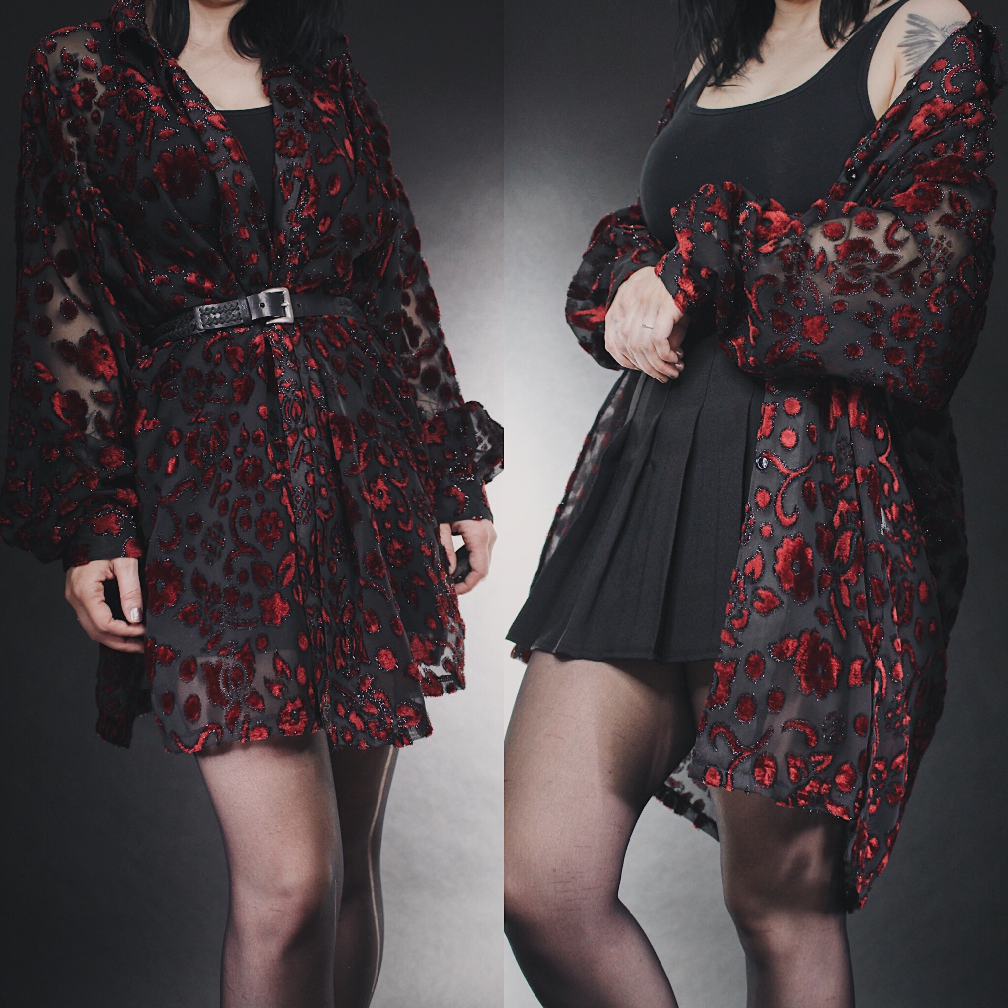 Vintage 90s red and black glittery sheer button down.Textured blood red crushed velvet floral overlay with glittery 3D detailing. Black buttons set with rhinestones down the front and buttons at each cuff.