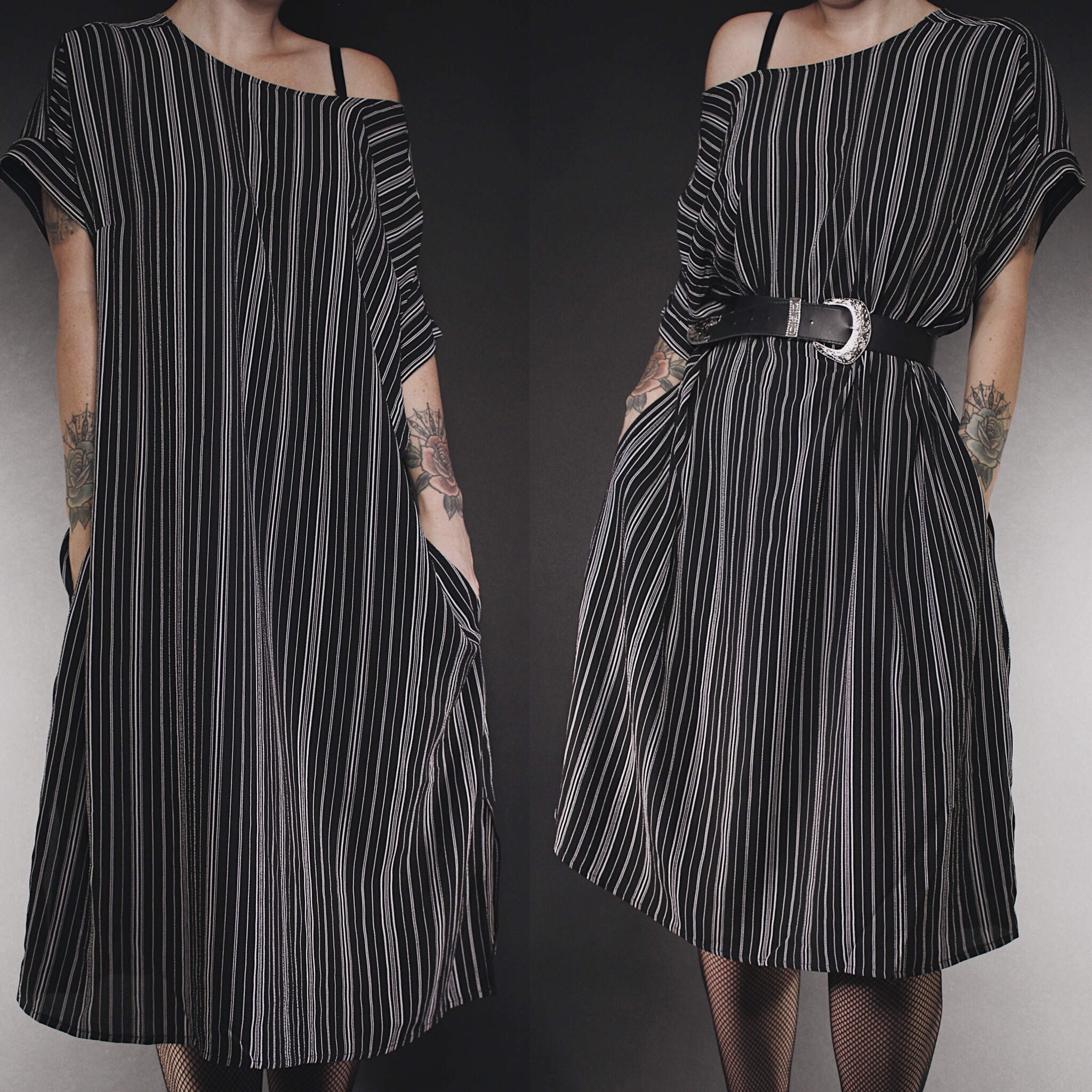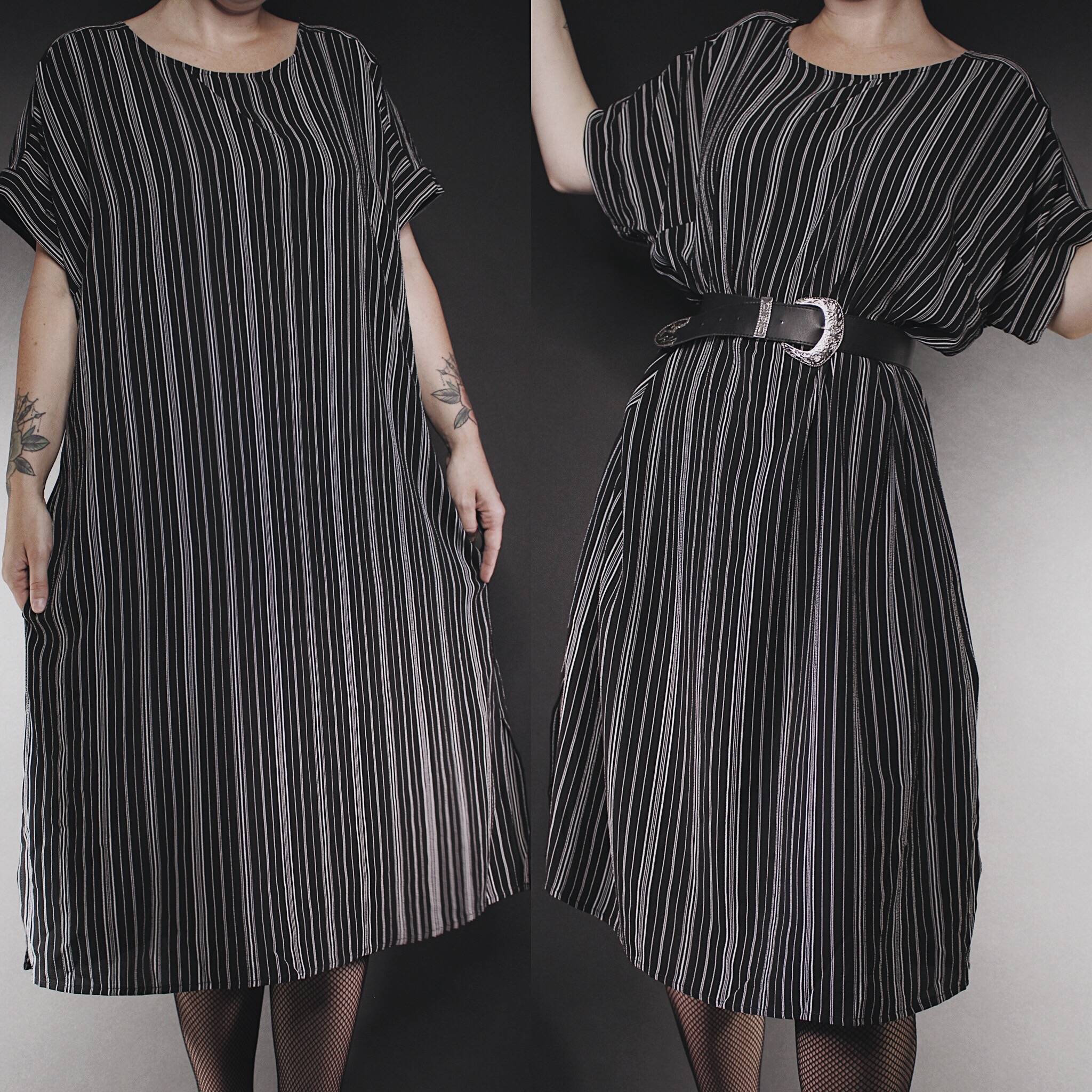 Vintage 80s black & white striped Jack Skellington inspired midi dress. SHE HAS POCKETS! Loose, flowy, oversized cut, short batwing sleeves. Small side slit at the hem and mini belt loops on either side. Lightweight, breathable, airy crepe fabric.