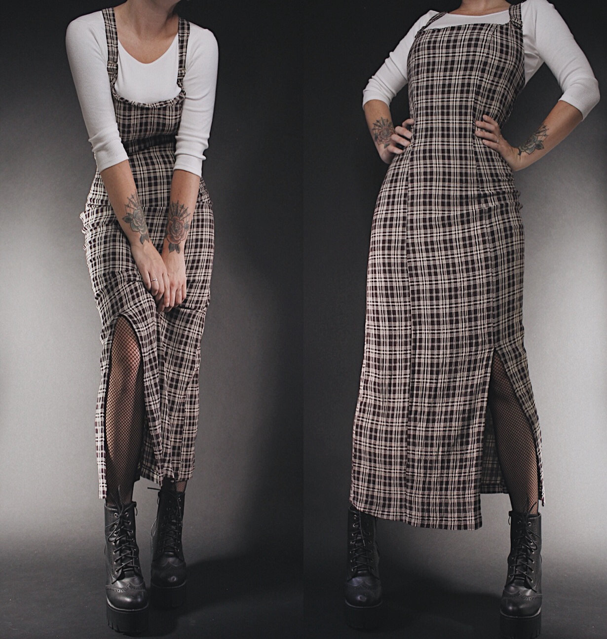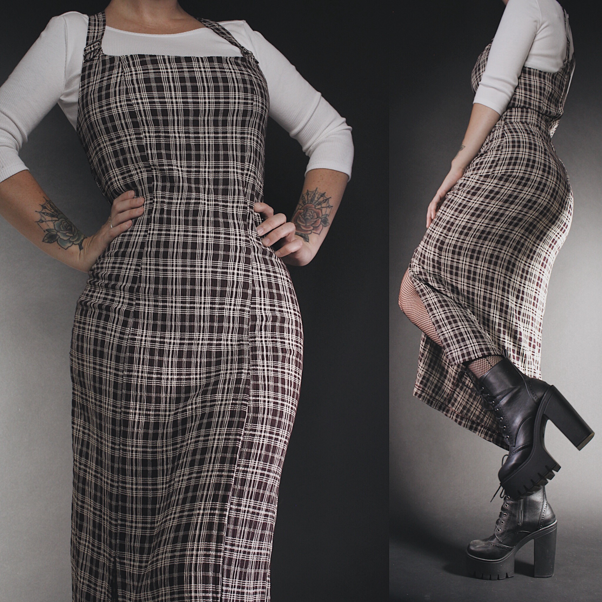 Vintage 90s plaid maxi dress. This one will make all your grunge dreams come true! Sleeveless, cut straight across at the bust line, wide straps are fully adjustable with metal buckles. Zips up the back. White thermal shirt pictured here is not included. High side slit. Lightweight, linen-like poly fabric is comfortable, breathable, and great for layering. Fabric is not stretchy but it has a little bit of give to it.