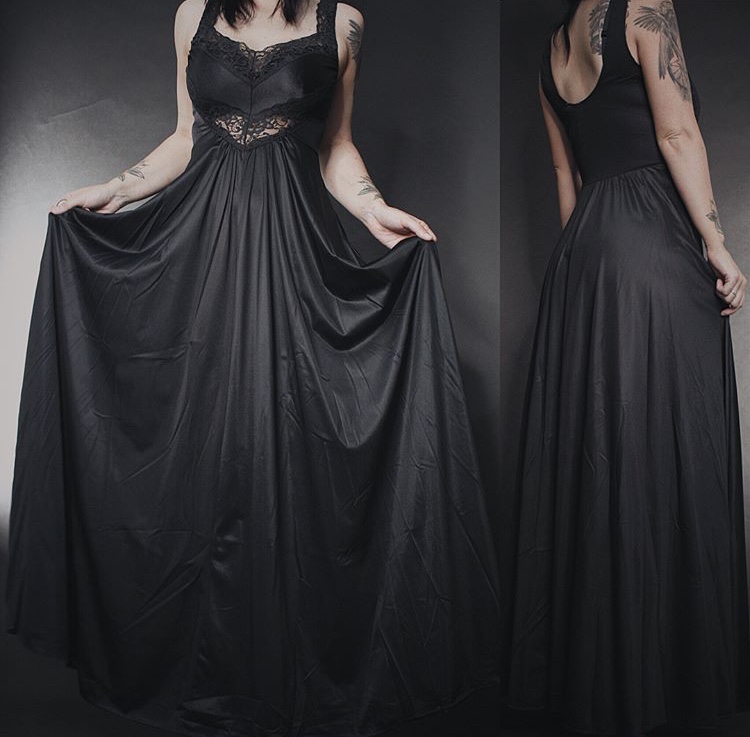 Vintage 80s black satin dressing gown. This is a Last Rites signature piece! Full, flowy circle skirt flows beautifully when you walk. Empire waist. Sheer lace cutout detailing at the shoulders and bust. V-neck, scoop back. Has a bit of stretch all over. Pull-on style.