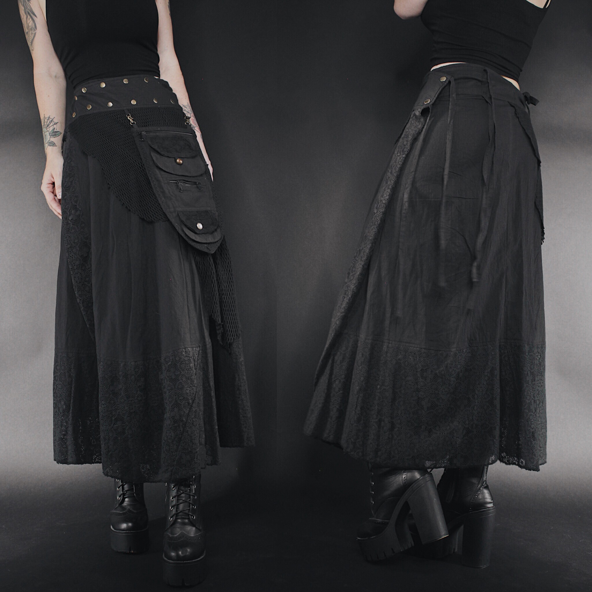 Vintage 90s ultimate goth wrap skirt! This is a true relic from the 90s and is still a must-have in any goth babe's wardrobe. Full, flowy maxi skirt in 100% cotton with layers of lace and raw-hem fishnet mesh. Two rows of brass grommet snaps all around the top of the wide waistband. Two sets of kimono-style ties on the inside and outside of the hips give you full adjustable freedom. The best part - she comes with a removable, matching pouch that attaches to the side of the hips with brass clasps. The pouch has one big deep zippered pocket and three smaller pockets on the outside, either with double zipper closure or lace-trimmed button-closure flap pockets. Never lose your essentials at a show, festival or the club ever again!