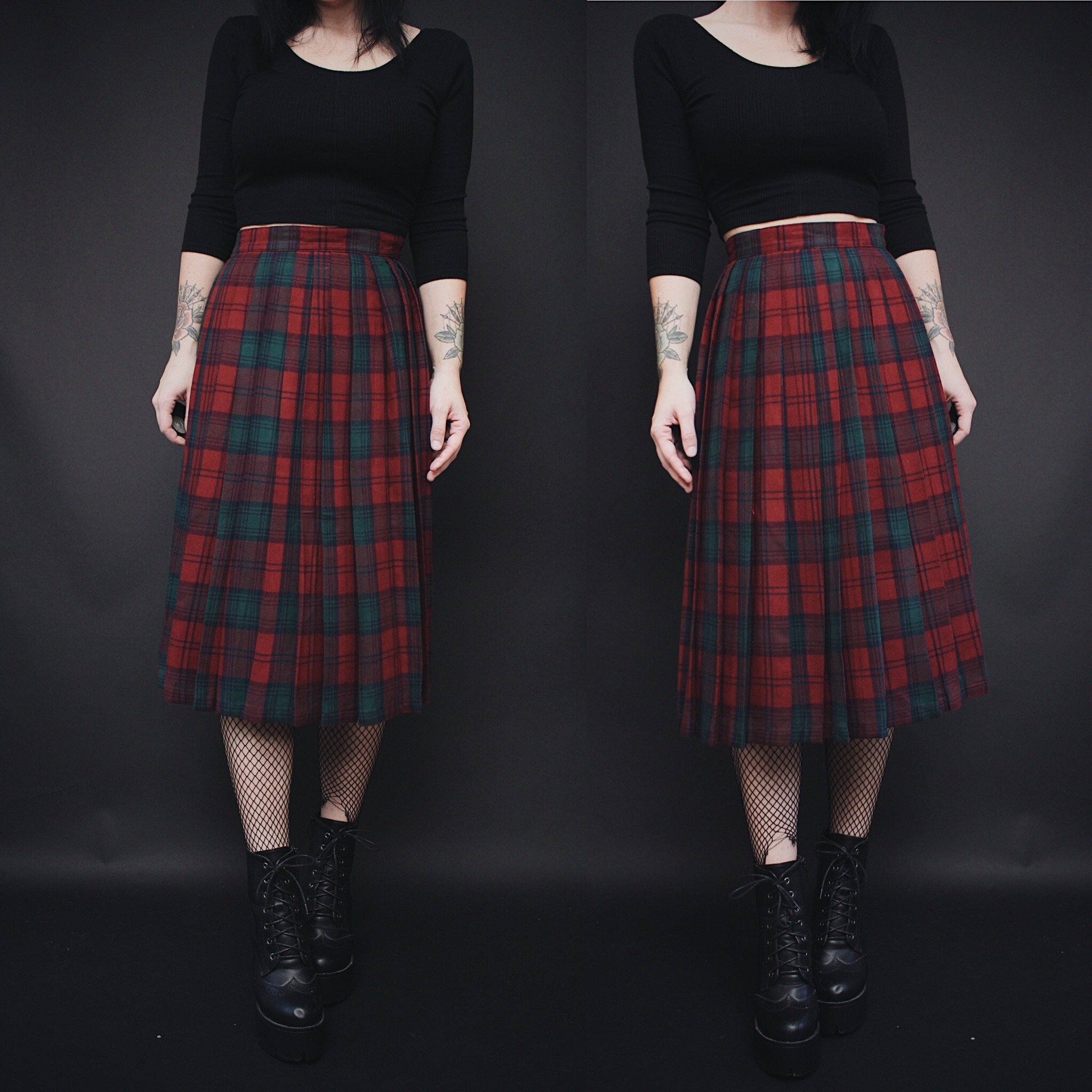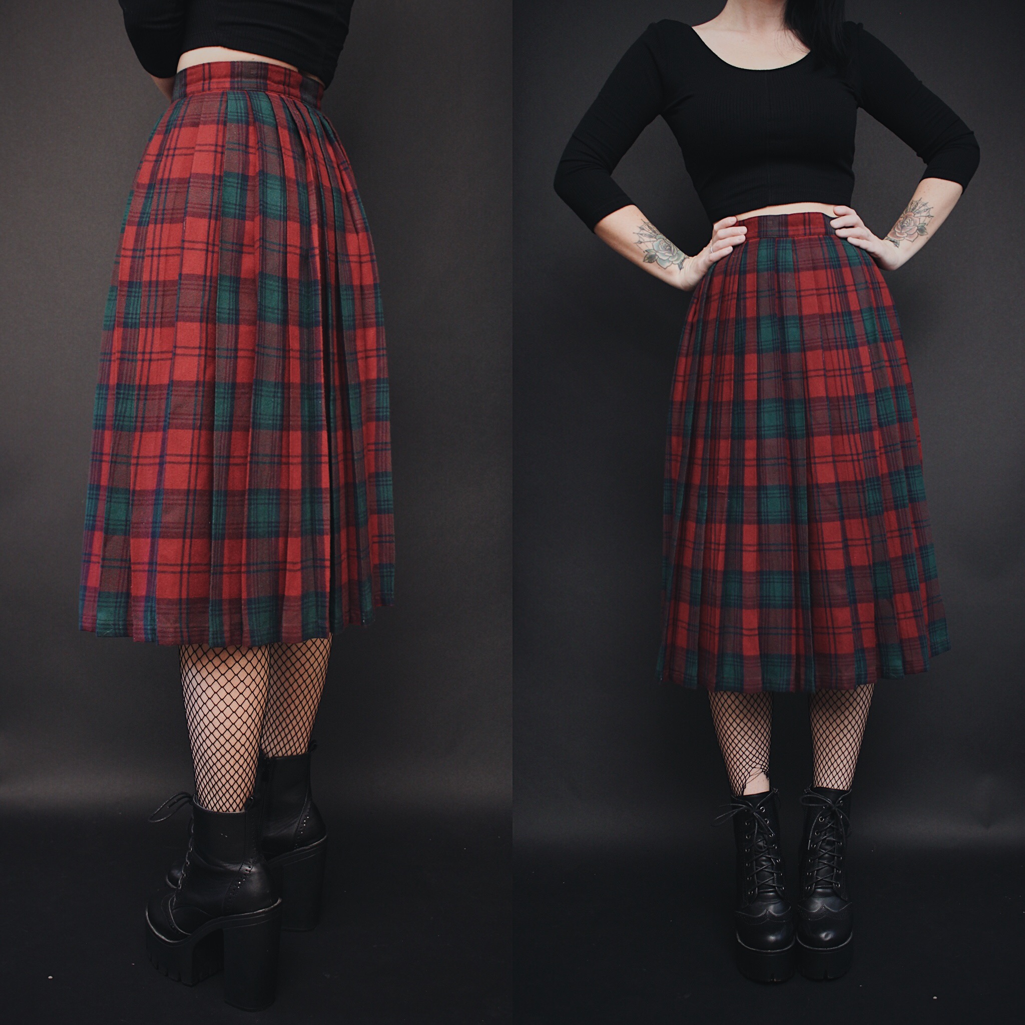Vintage 90s plaid pleated midi skirt. This is a classic fit and reminds me so much of Lydia Deetz school uniform! Deep burgundy, navy and forest green plaid is perfect for fall and the holidays. Full pleats give it lots of volume and movement. Super cute with tights and boots!