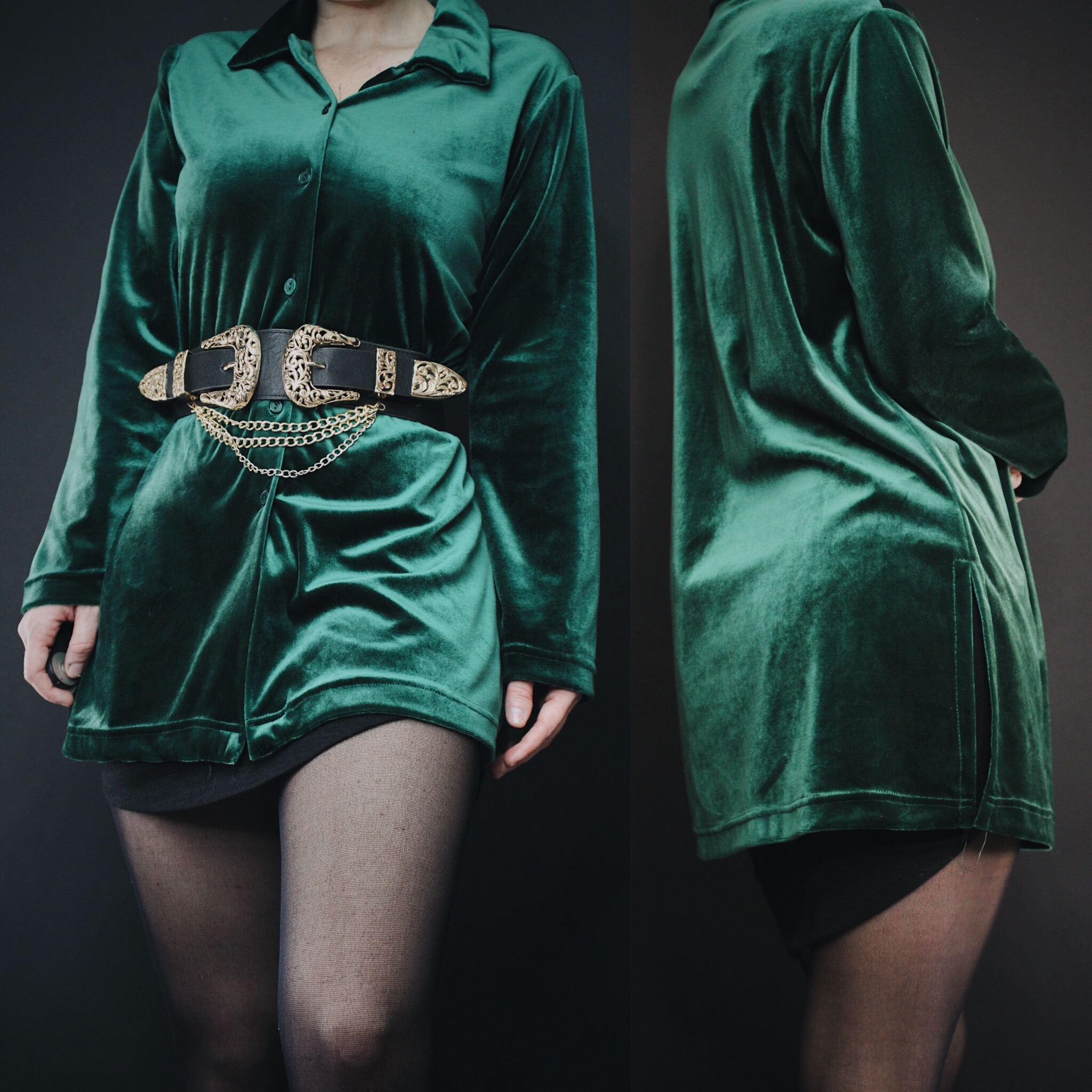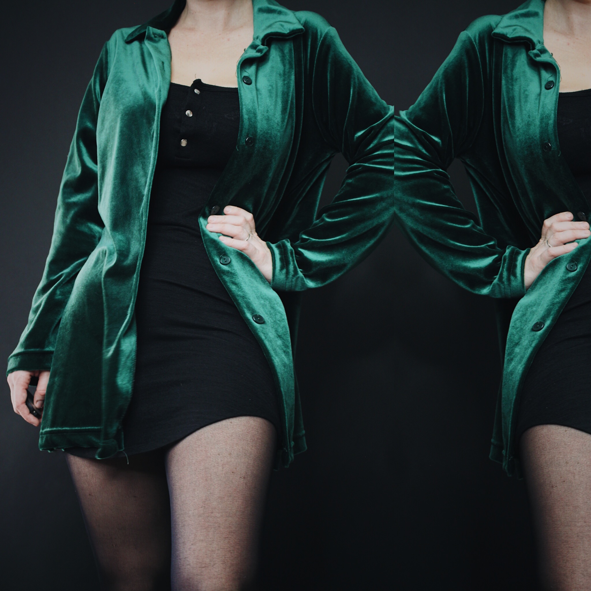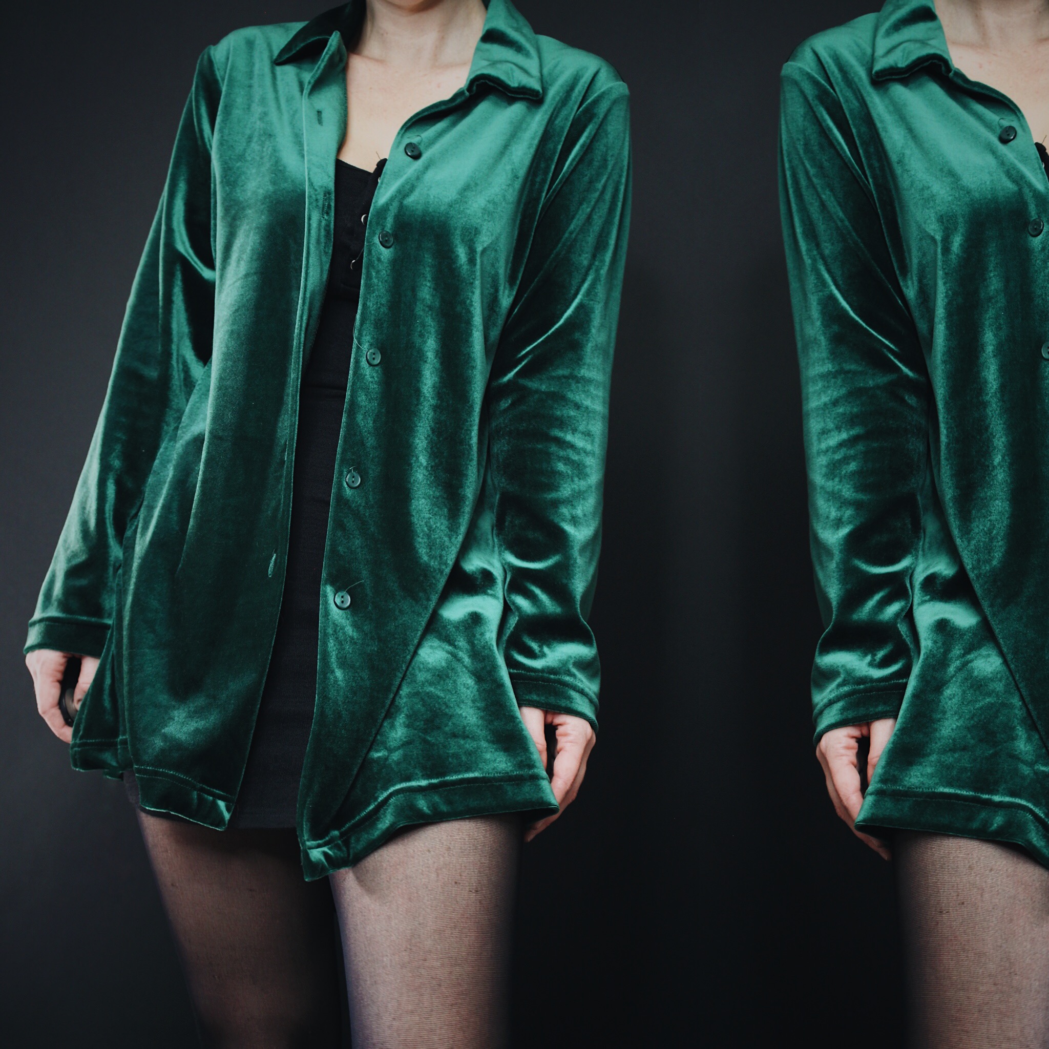 Vintage 80s emerald green velvet button down. This is a Last Rites signature piece! Perfect for the holidays. Mid-weight super soft unlined velvet fabric. Not quite stretchy but definitely has some "give" to it for just the right amount of slouch.
