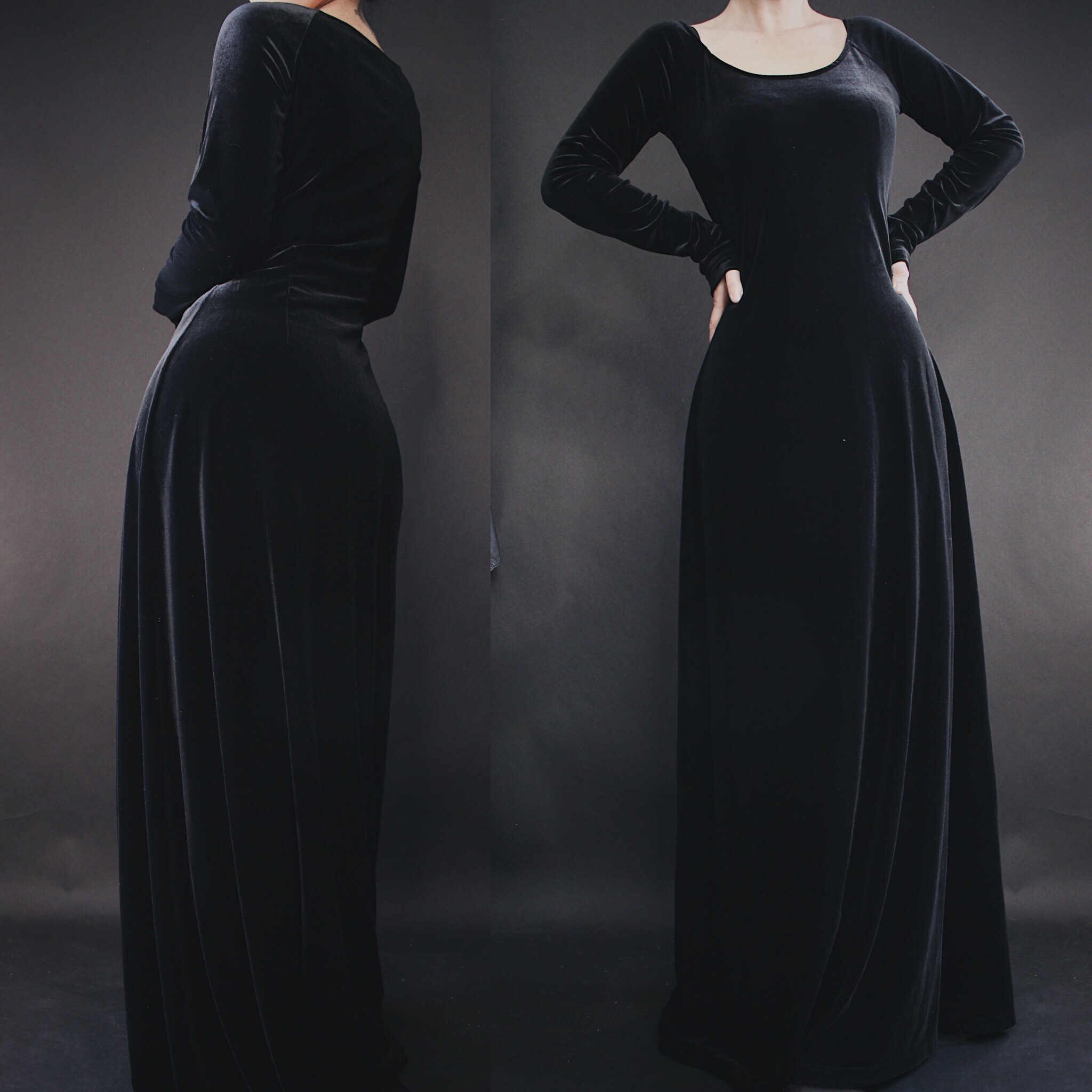 Full floor length in a luxe poly-spandex stretch velvet. Mid-weight, super soft and cozy but majorly glam! Long sleeves, scoop neck, straight cut and flaring out slightly from the hips down. Pull-on style. Perfect for all your holiday events, but can be styled for all year round and dressed up or down! Every ghoul needs a classic velvet gown in her wardrobe.