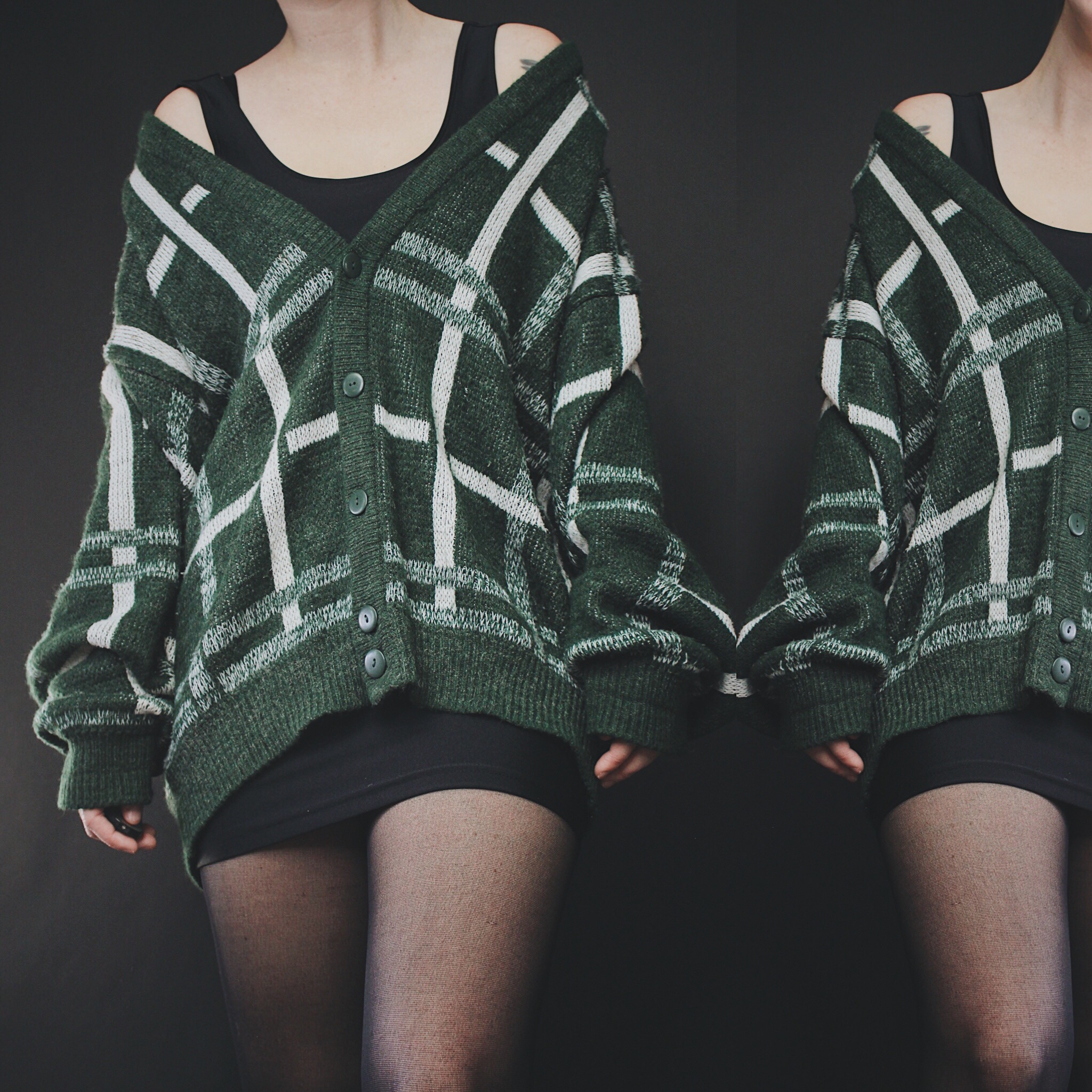 Vintage 90s Slytherin signature slouchy sweater. All Last Rites signature sweaters are one-of-a-kind unisex vintage finds straight out of the 80s and 90s, with unique collars and patterns! This one is inspired by the beloved Hogwarts house, with a deep forest green and white oversize plaid print. Perfectly oversized, slouchy and cozy. V-neck, buttons down the front, loose balloon sleeves and a boxy cut. Acrylic and nylon knit, may be slightly itchy to some but if you usually wear long sleeves under your sweaters or you aren't bothered by knits, you'll be fine!