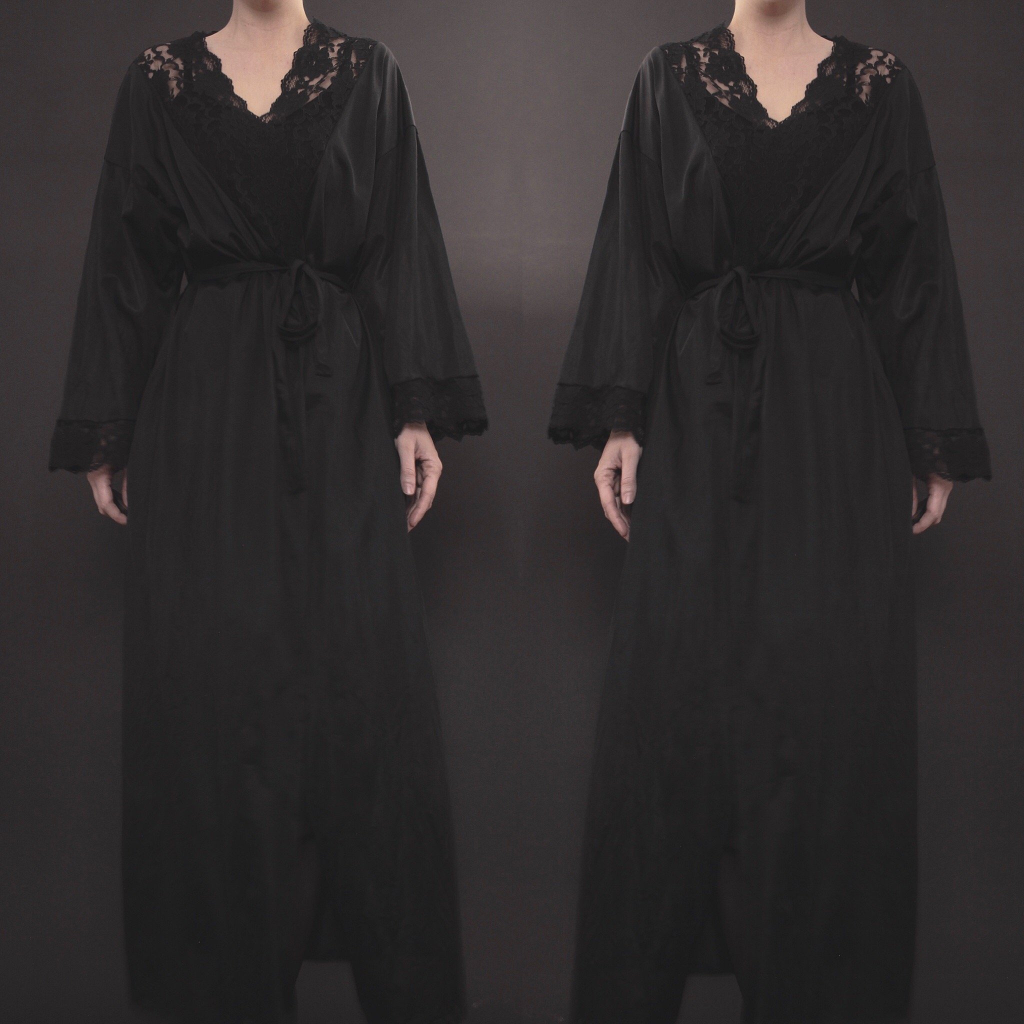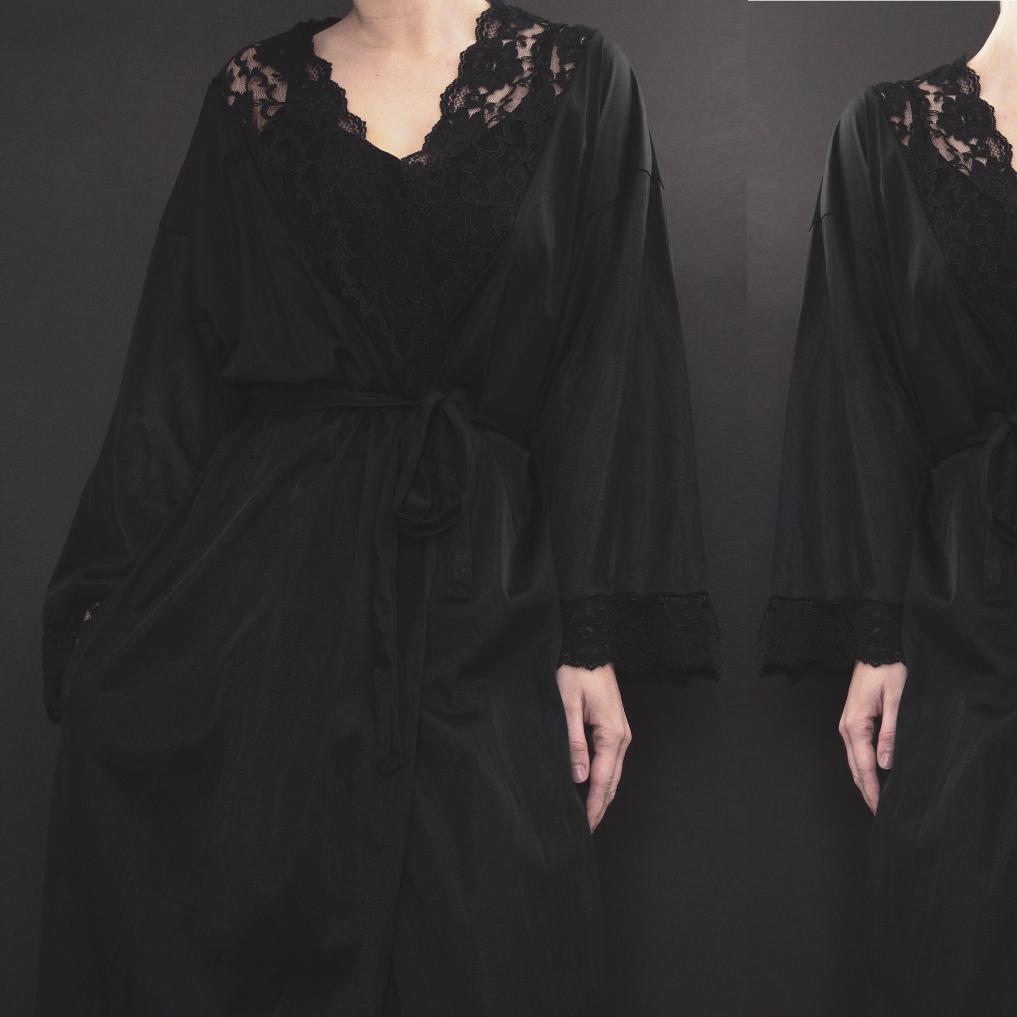 MADAME - Vintage 80s signature dressing gown. All signature LRV gowns are one of a kind, with extra-special witchy details fit for a true femme fatale. This one is black-on-black, semi-sheer poly satin with gorgeous lace trim and detailing at the lapels and sleeves. SHE HAS A POCKET! Wide, flowy kimono-style sleeves. Full length, flows beautifully around you when you walk. Ties on the inside at the hip on one side, and comes with a removable matching wrap belt.