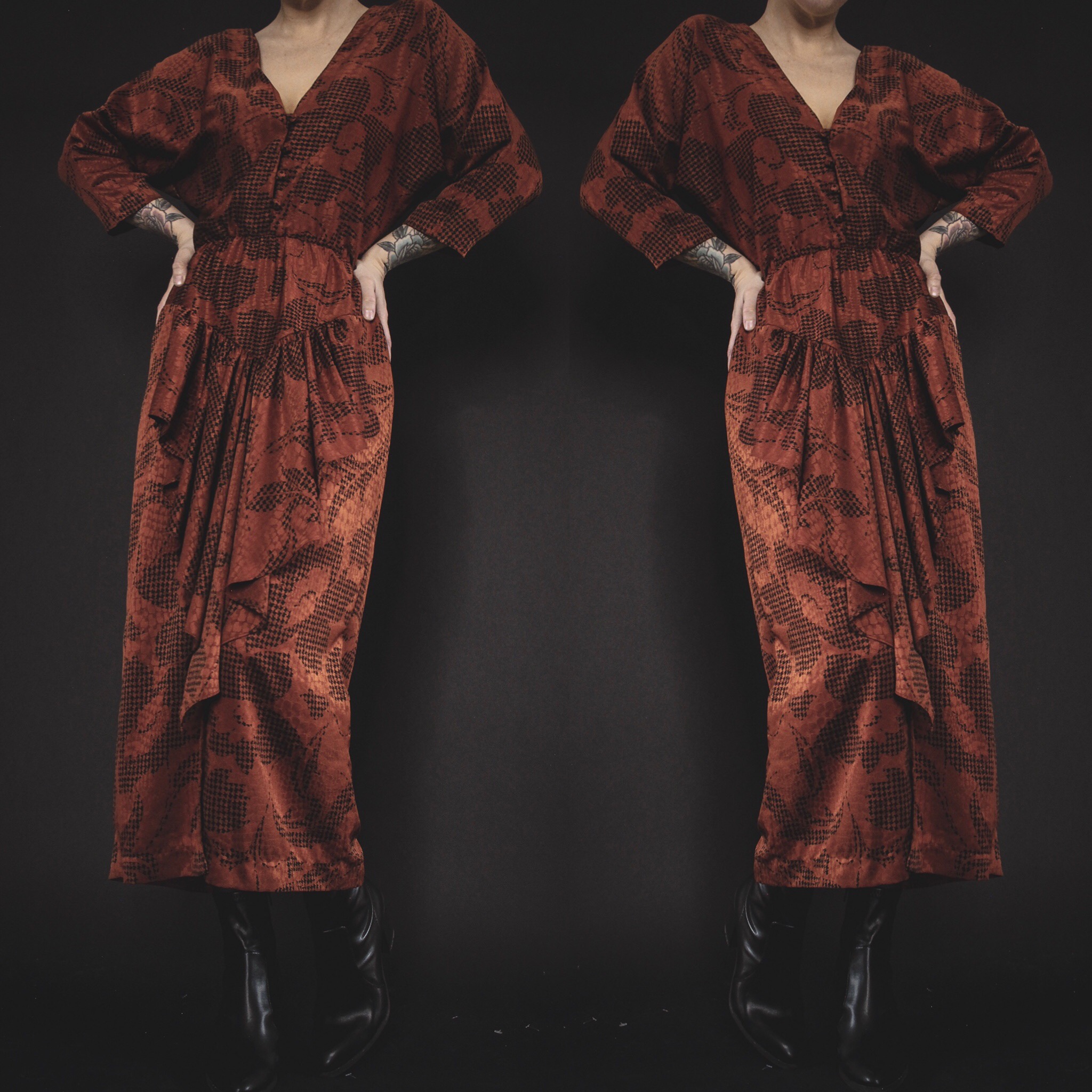 Vintage 80s batwing midi dress. This one is super unique and so fun! Silky, soft, flowy, lightweight poly blend fabric in a gorgeous deep rusty pumpkin colour with black abstract print all over. Midi-length pencil skirt, batwing sleeves that taper to a 3/4 length, with 4-button closure in front and a deep V neckline. Double waistline - elastic empire waist as well as a lower basque waistline that flows into the skirt and ruffle detail. No stretch, pull on style. Best fits a women's size Small or Medium, please refer to measurements.