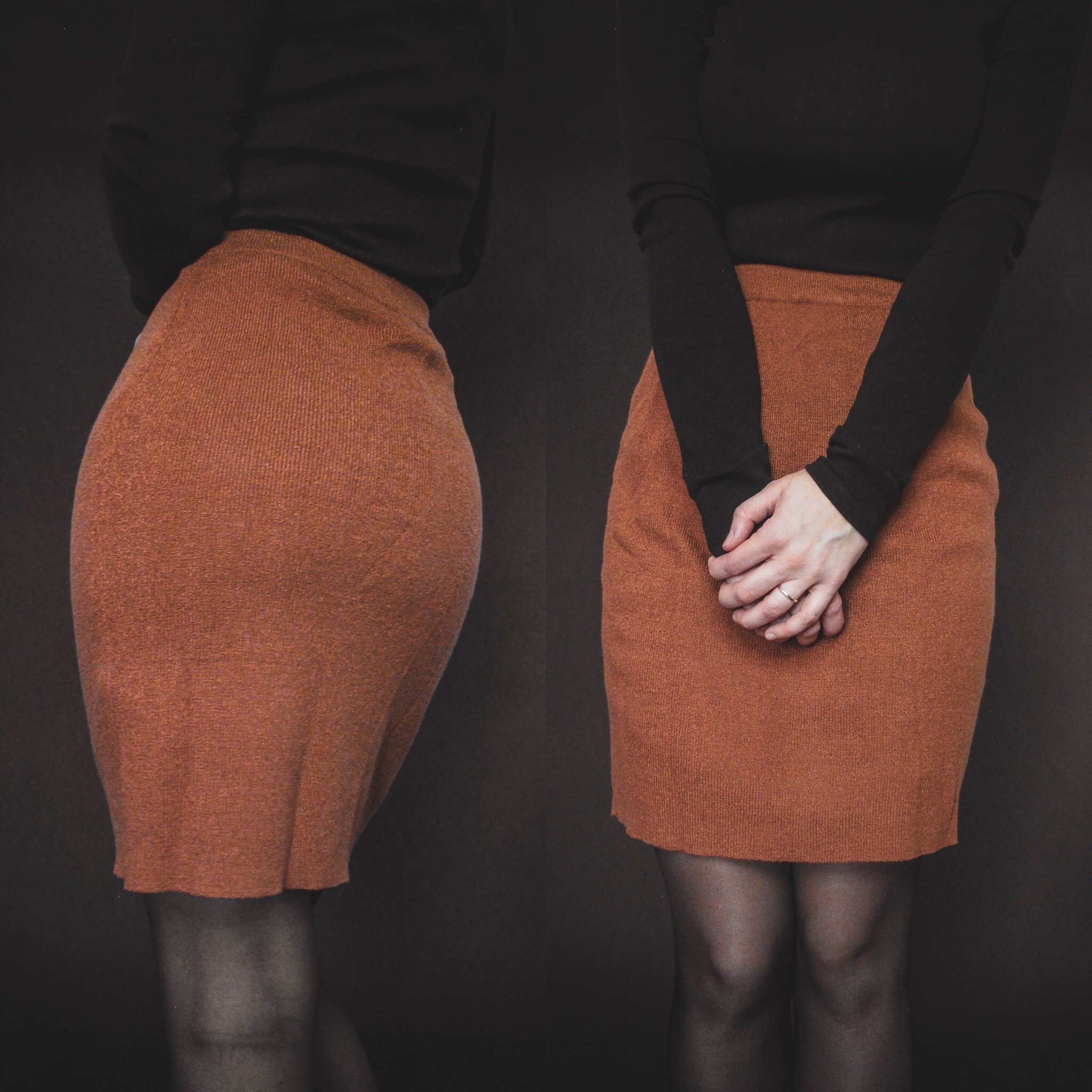 Vintage 70s knit pencil skirt in a beautiful muted pumpkin orange shade. Soft and cozy, stretchy all over with a wide elastic waistband. Pull-on style. Pair with your favorite vintage tee, witchy blouse or slouchy sweater!