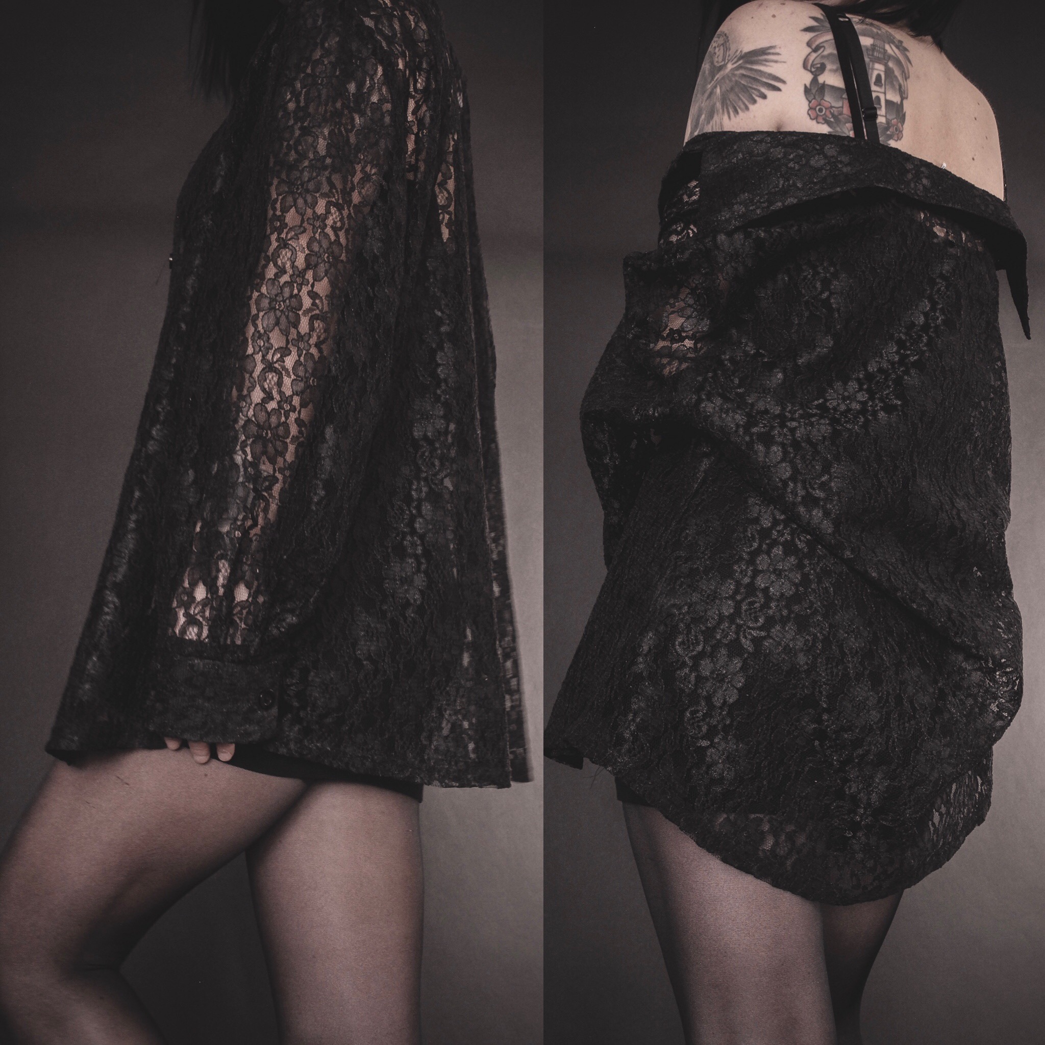 Vintage 90s sheer black lace button down. This is a Last Rites signature piece! Lightweight and flowy, great for transitional weather. Buttons down the front and at the cuffs. No stretch. Can be dressed up or down for all seasons. Pair with jeans, faux leather pants or leggings, just about any skirt or dress. Perfect throwover piece as a substitute for a jacket or cardigan. Looks super cute belted! Belt is not included.