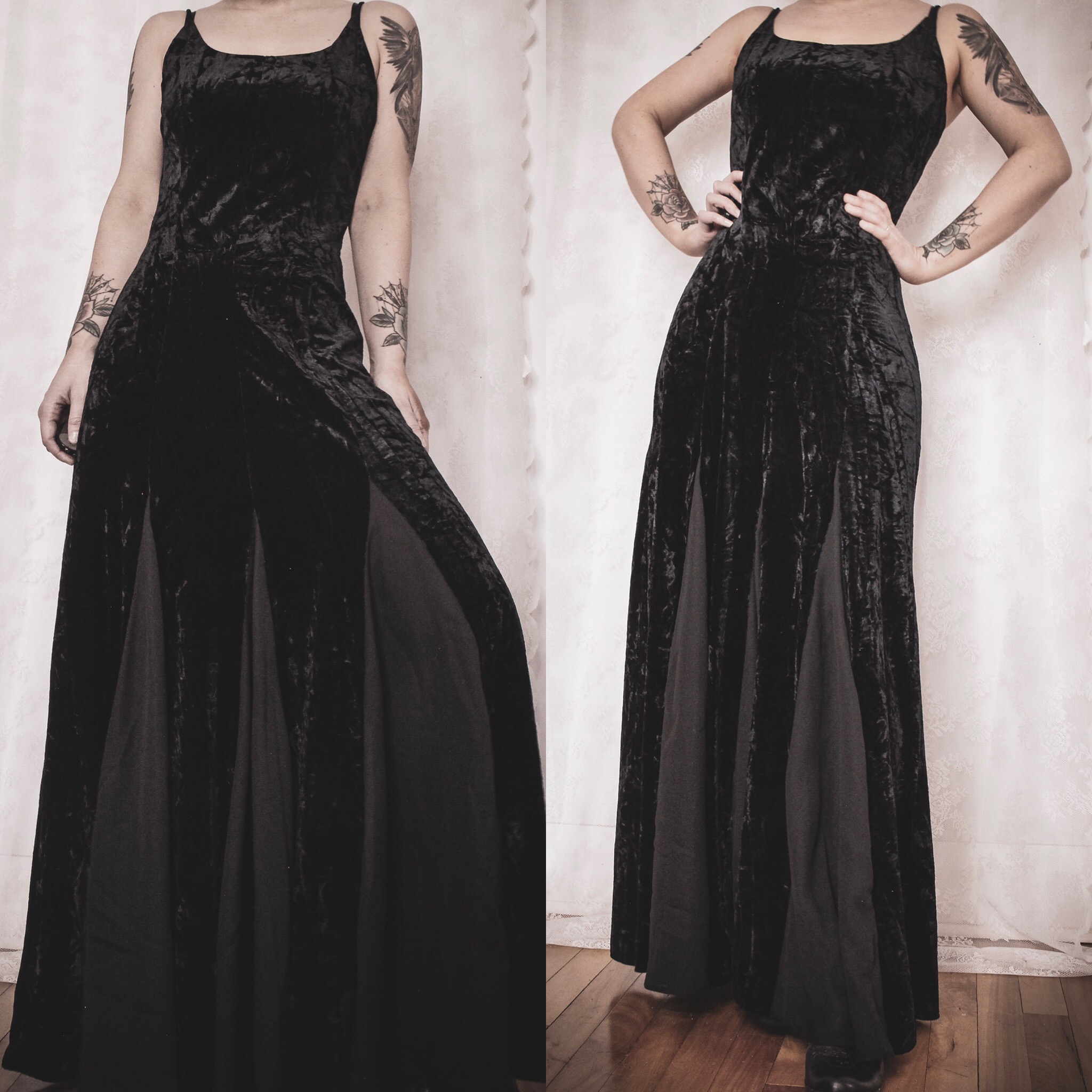 LILITH - Vintage 80s velvet gown. This is a dream dress for any lady of darkness. Floor length crushed black velvet, drop waist. Super full mermaid skirt with alternating panels of sheer chiffon all around. Lots of drama and movement. Pull-on style. Slightly stretchy all over. Thin straps, scoop neck and back. Very comfortable but insanely glam at the same time - wear this one to your next fancy event, or dress her down for daytime and wear her to the grocery store on a Tuesday, as one does.