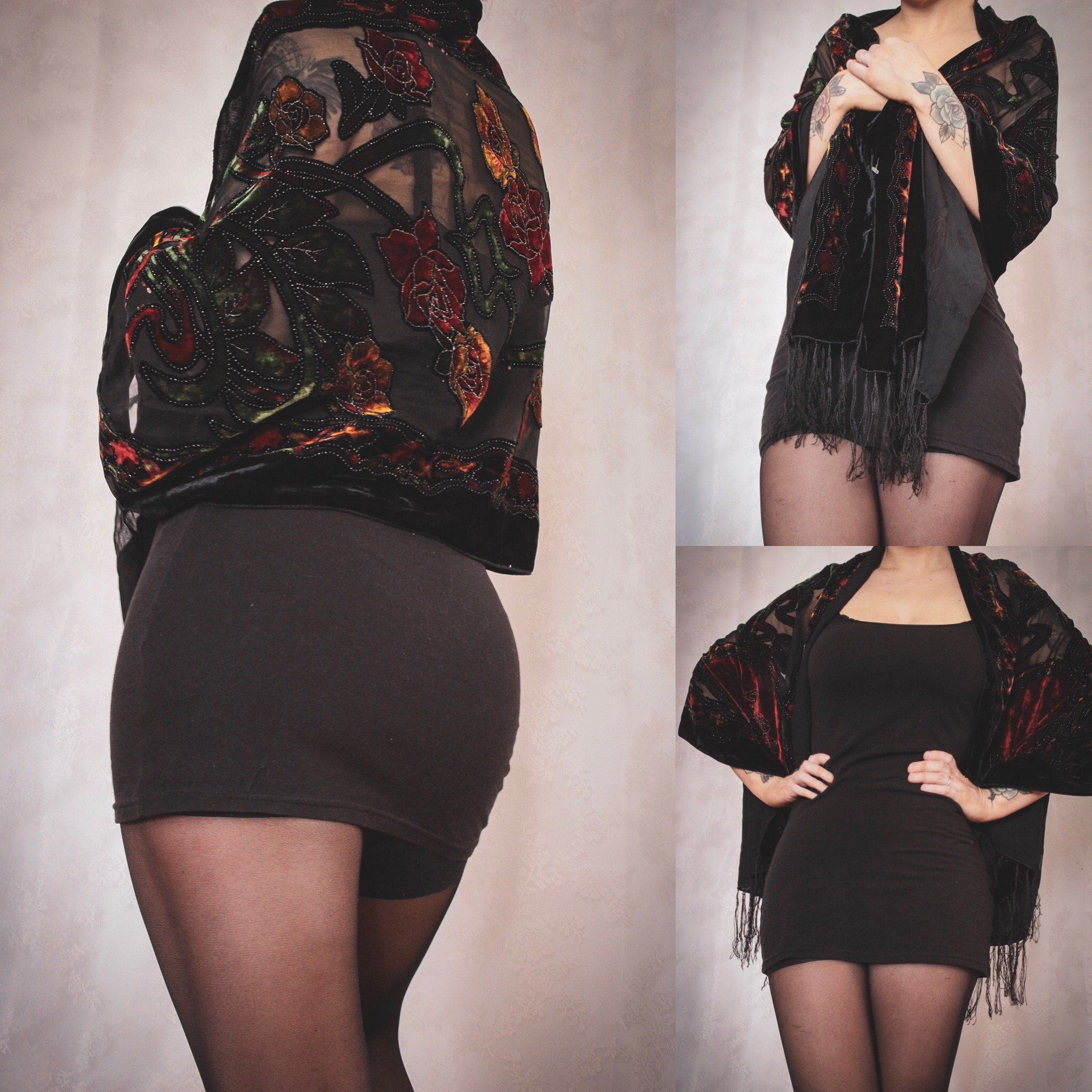 Vintage 80s signature velvet burnout shawl. All Last Rites signature velvet shawls are one of a kind with unique colors and patterns! This one has sheer black backing with a gorgeous autumn floral print with jade green, gold, pumpkin orange, and bright blood red roses. Black crushed velvet trim, long delicate fringe on both ends, and the most beautiful sparkly silver glitter accent threading throughout. Rectangular, measures 62" by 20", not including fringe.