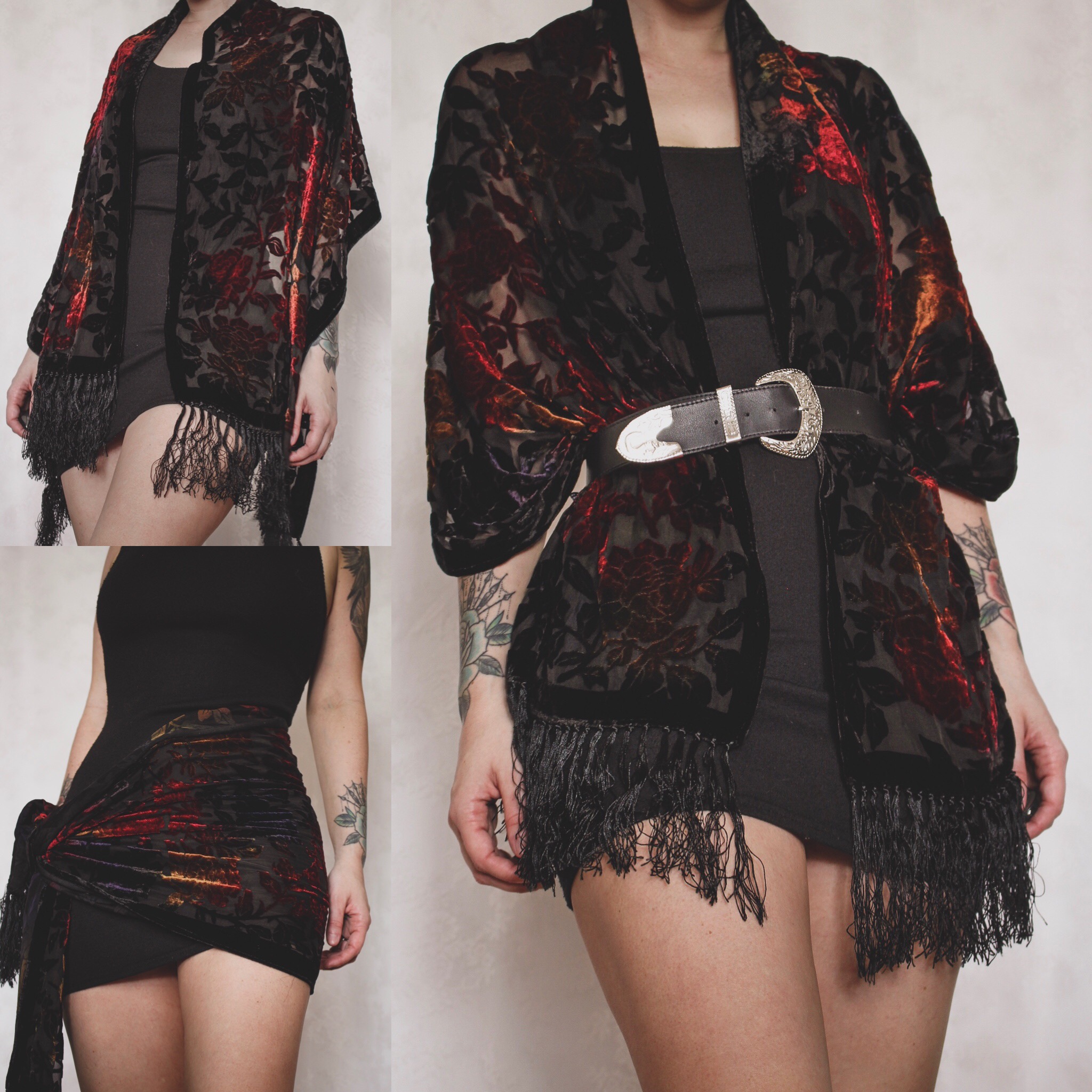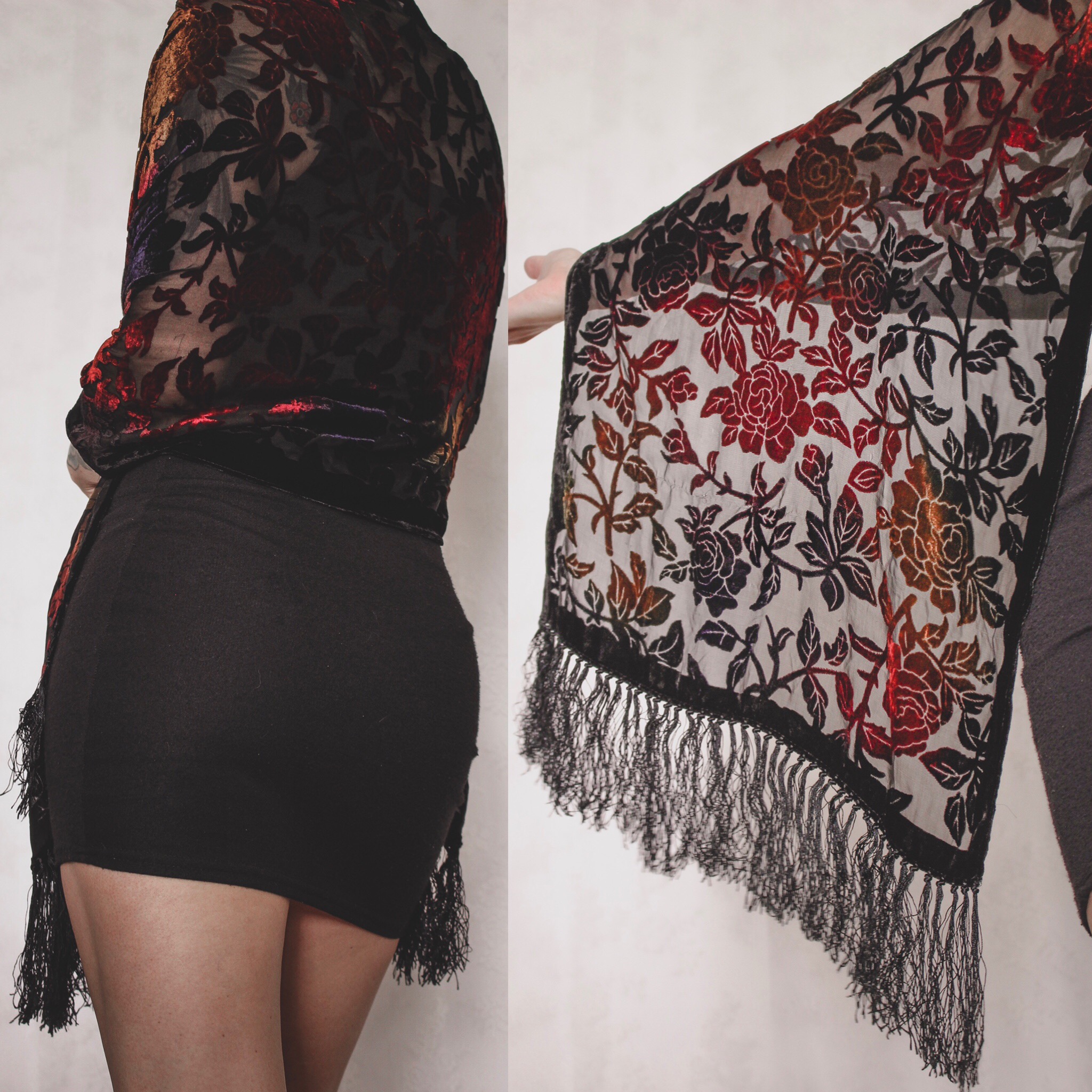 Vintage 80s signature velvet burnout shawl. All Last Rites signature velvet shawls are one of a kind with unique colors and patterns! This one is an extra special find. Sheer backing with a large, intricate floral velvet burnout overlay in the most gorgeous jewel-toned ombre rainbow design. Shades of bright blood red, navy, purple, emerald green, gold and pumpkin orange. I CANNOT GET OVER IT. Black crushed velvet trim, short delicate fringe on both ends. Rectangular, measures 60" by 20", not including fringe.