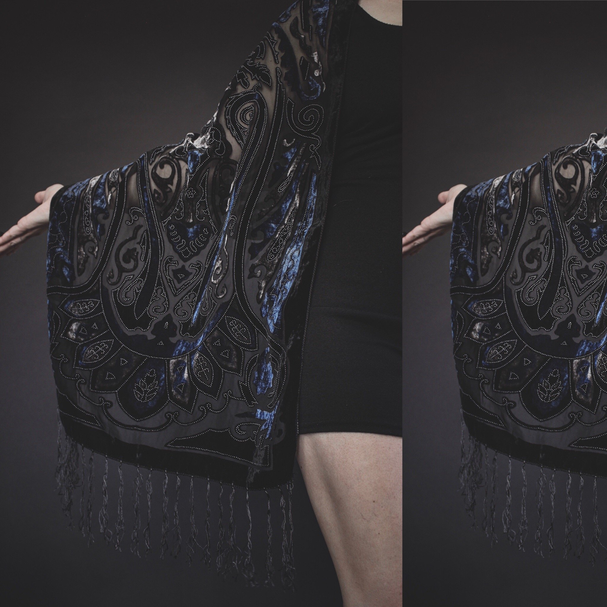 Vintage 80s Ravenclaw-inspired velvet burnout shawl. All Last Rites signature velvet shawls are one of a kind with unique colors and patterns! This one is named for the the beloved Hogwarts house! Sheer black backing with a gorgeous crushed velvet 3D "stained glass" Victorian floral pattern in shades of silver and sapphire blue. Black velvet trim and long delicate fringe on both ends. Rectangular, measures 60" by 21". This is a perfect throwover piece for chilly nights and can be layered for all seasons as a scarf or substitute for a jacket or cardigan, draped over your shoulders, or even as a wrap skirt or swim cover up! Or style it as home decor or an altar covering. Rowena Ravenclaw would be proud. One size fits most. Fringed will be steamed out before shipping.