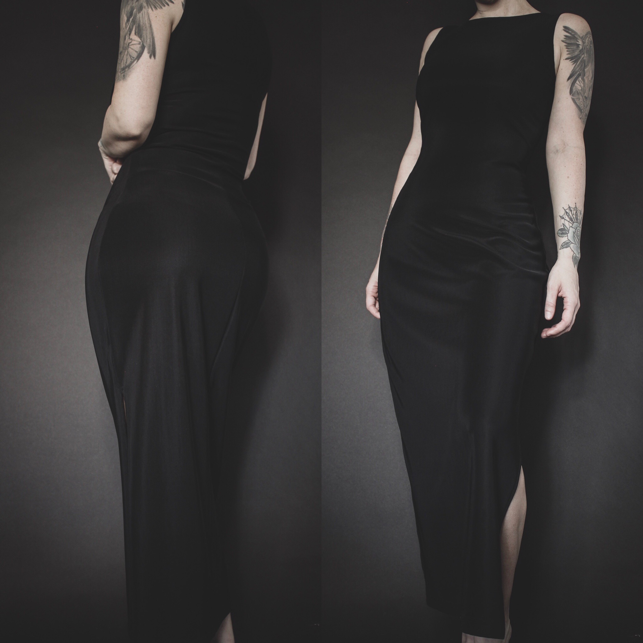 Vintage 90s Morticia gown! Fitted, slightly stretchy jersey material is comfy but sturdy and hugs your curves in all the right places. Sleeveless and straight cut from the shoulders down, full maxi length with a slim skirt and a high slit on one side. High neck. Pull on style.