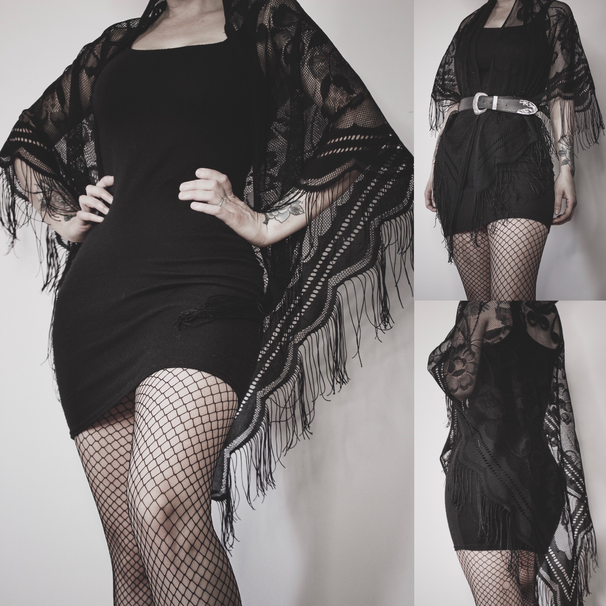 Vintage 70s black lace fringed shawl. This is a Last Rites signature piece in an oversize style for extra drama. All Last Rites signature shawls are one of a kind with unique colors, patterns and lace! No two are alike! This one is triangular in a beautiful black floral mesh lace and long delicate fringe on two sides. Can be worn over the shoulders in place of a cardigan or jacket, or as a classic scarf, belted and worn as a top, tied as a wrap skirt or swim coverup, home decor - the options are endless! Perfect throwover piece, especially for transitional or warm weather. Works for all seasons and can be dressed up or down. Stevie Nicks would be proud.