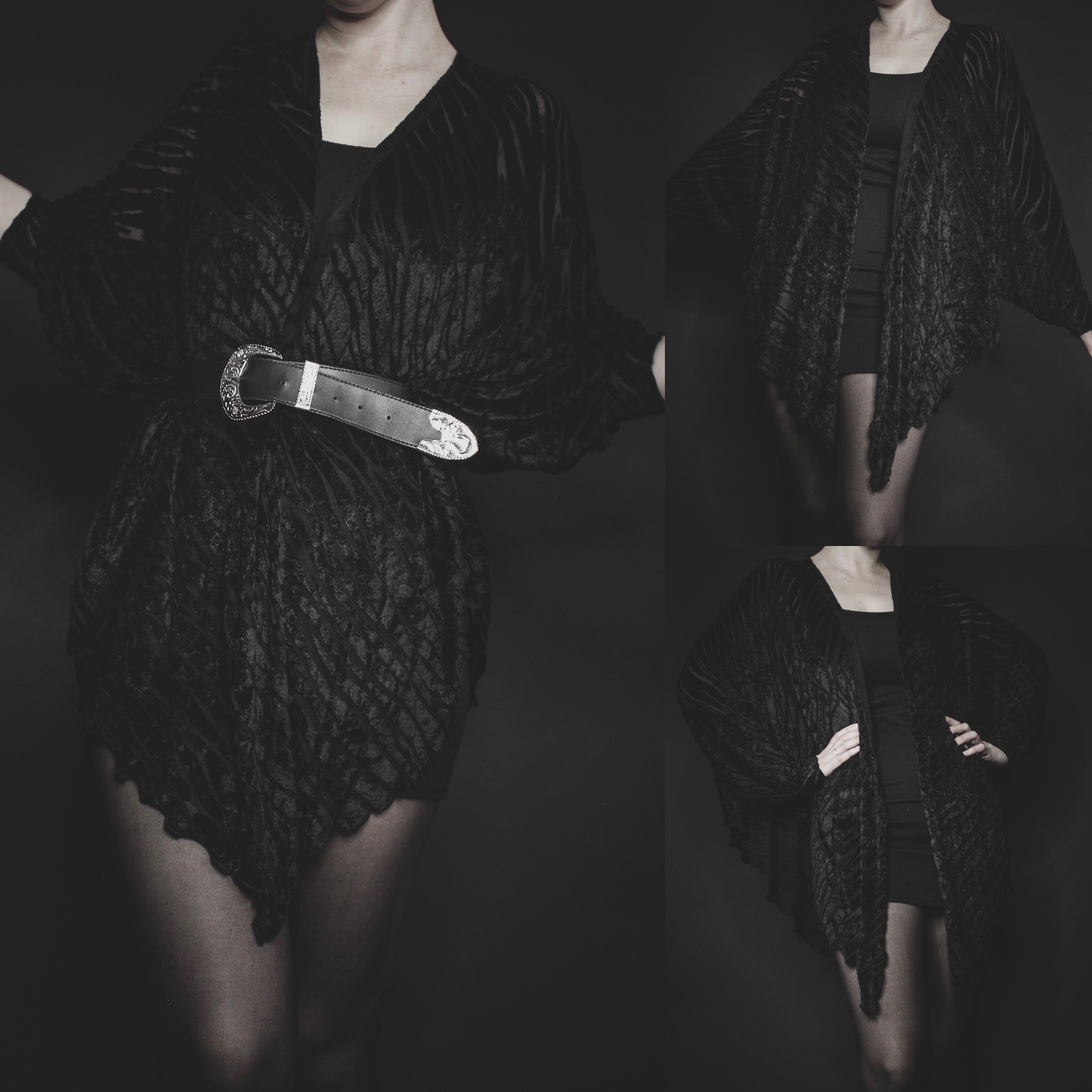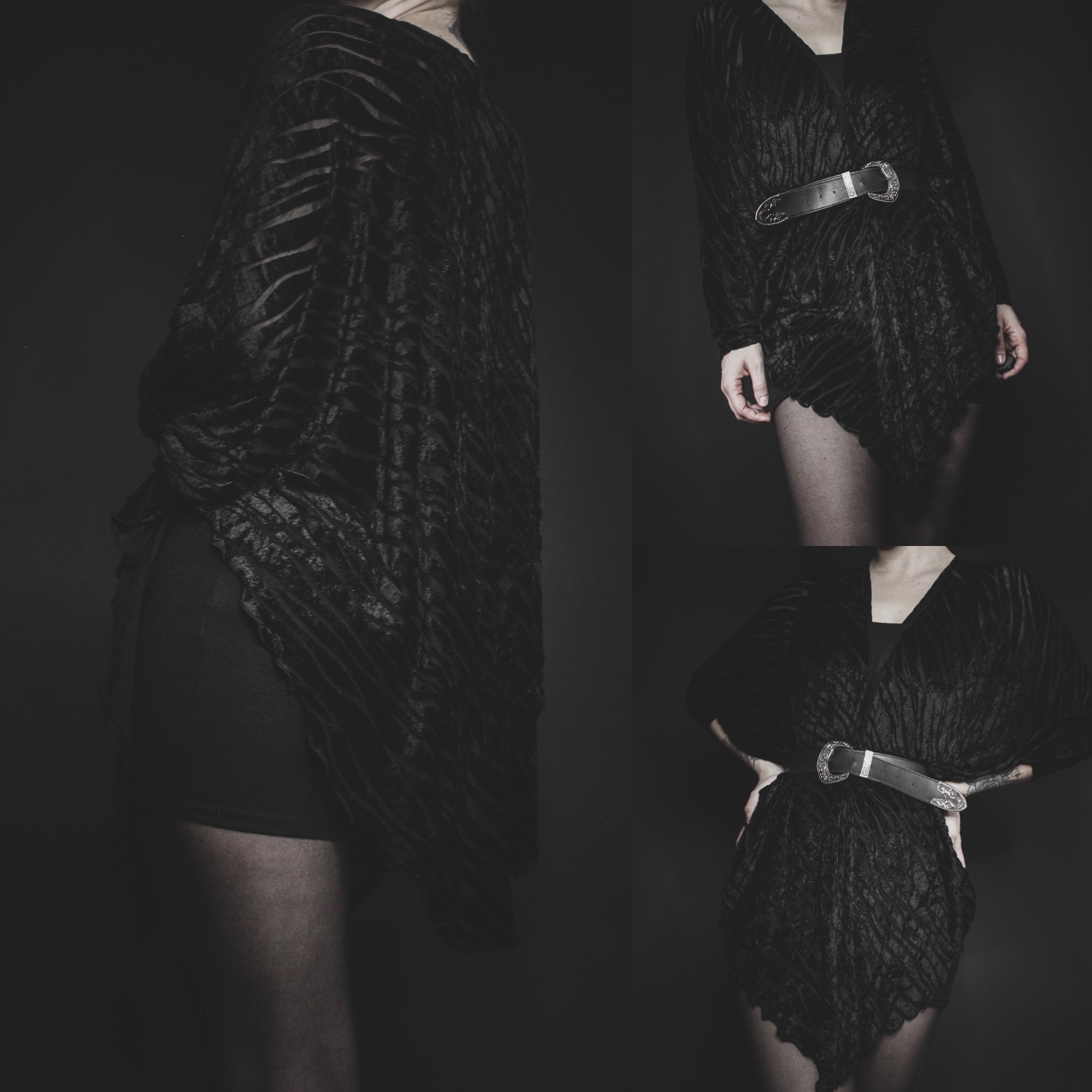 Vintage 80s black velvet batwing cardigan. Lightweight with a crushed velvet animal print burnout pattern. Loose batwing sleeves, open front style, asymmetrical cut (longer in front) with scalloped trim. Perfectly slouchy with a little bit of stretch all over, though it is meant to drape loosely.