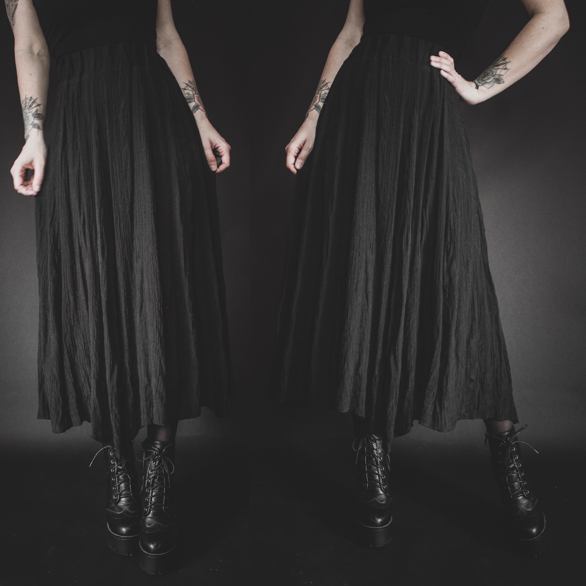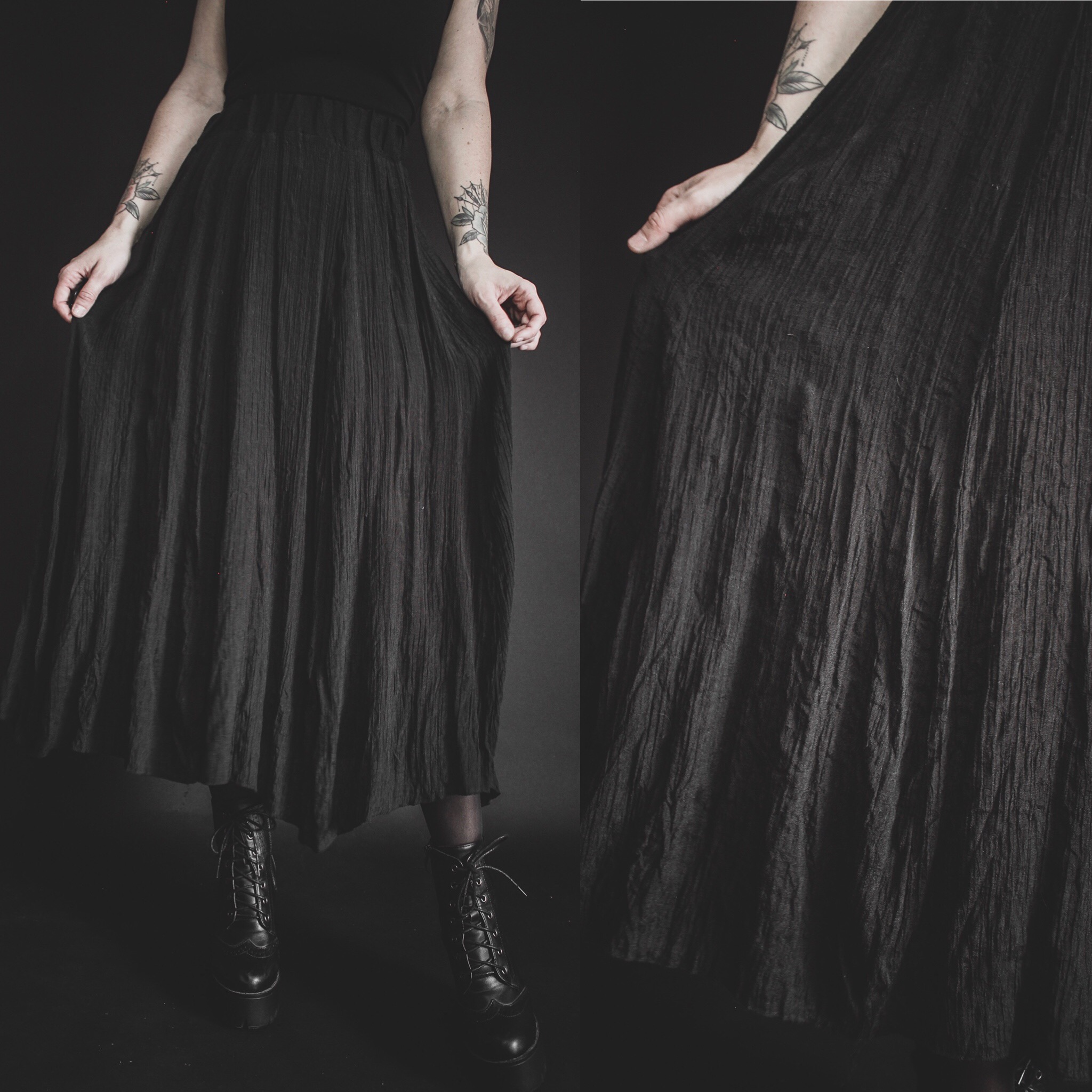 Vintage 80s black textured witch skirt. Super comfortable and versatile! Crinkled, textured gauze-like fabric is lightly pleated. Semi-sheer, super lightweight. A-line shape flares out slightly from the waist down. Pull-on style with a wide, comfortable waistband and subtle belt loops on either side of the waist.