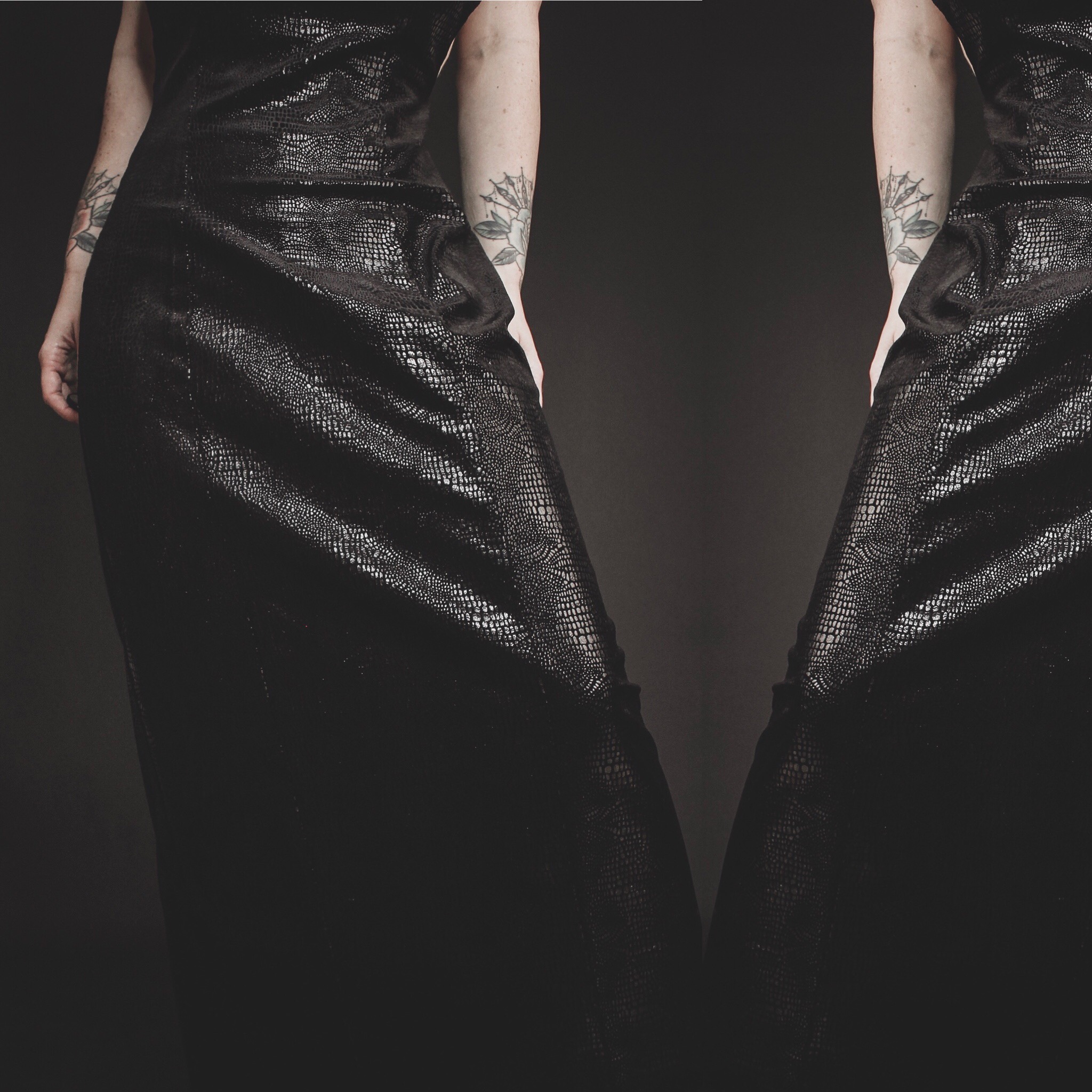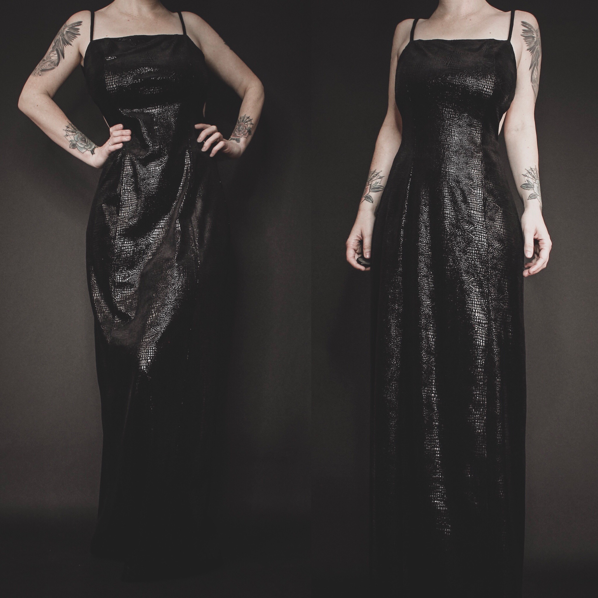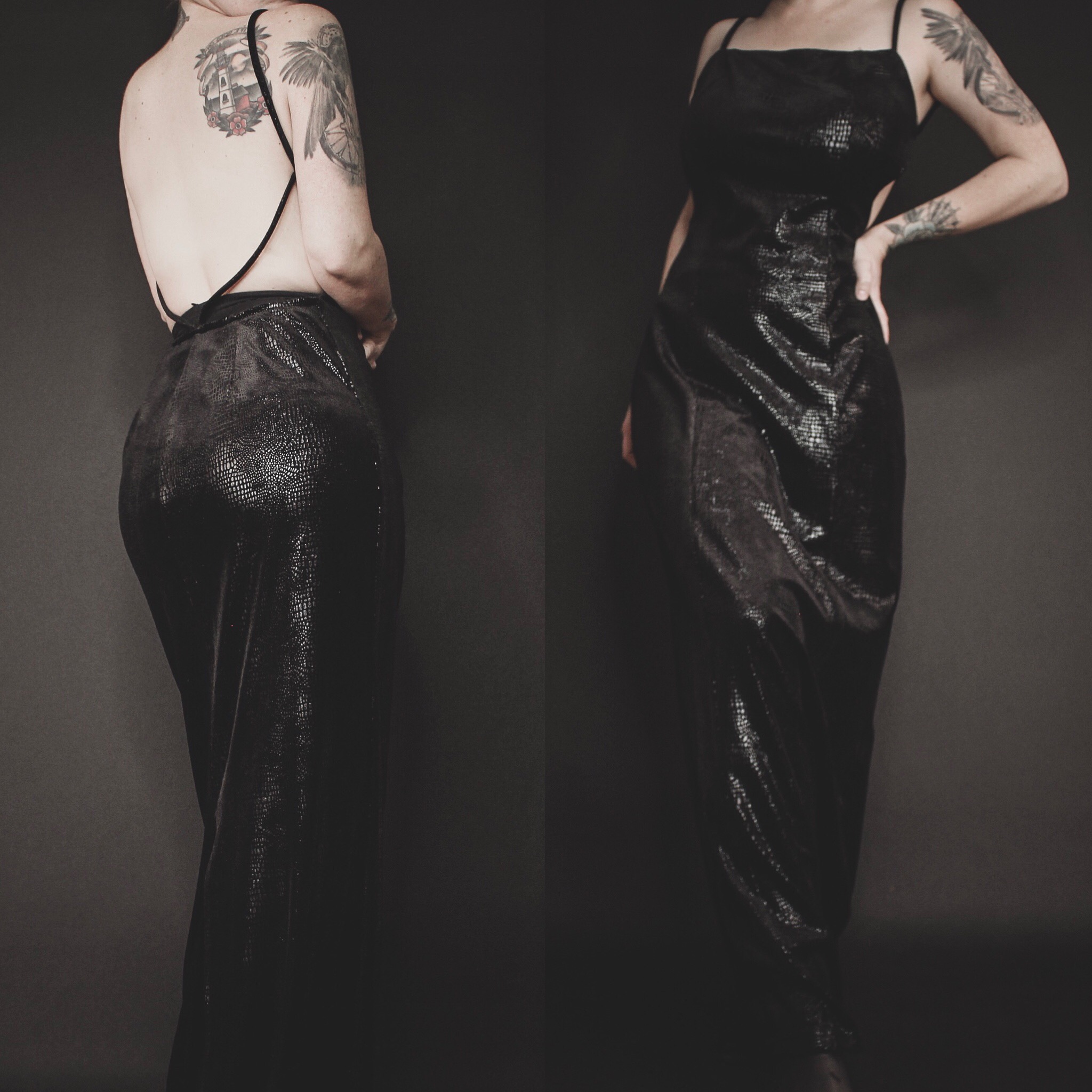 Black-on-black shiny faux snakeskin gown. The snake print is a shiny vinyl-like finish, so the dress itself looks metallic and sparkly but also sort of a "wet look" from a distance - it's SO COOL. Backless with thin straps and a high straight-cut neckline. Midweight poly-spandex blend fabric hugs your curves in all the right places - it definitely has some "give" but is not super stretchy, so it really holds everything in and gives you a super sleek look. Pull-on style.