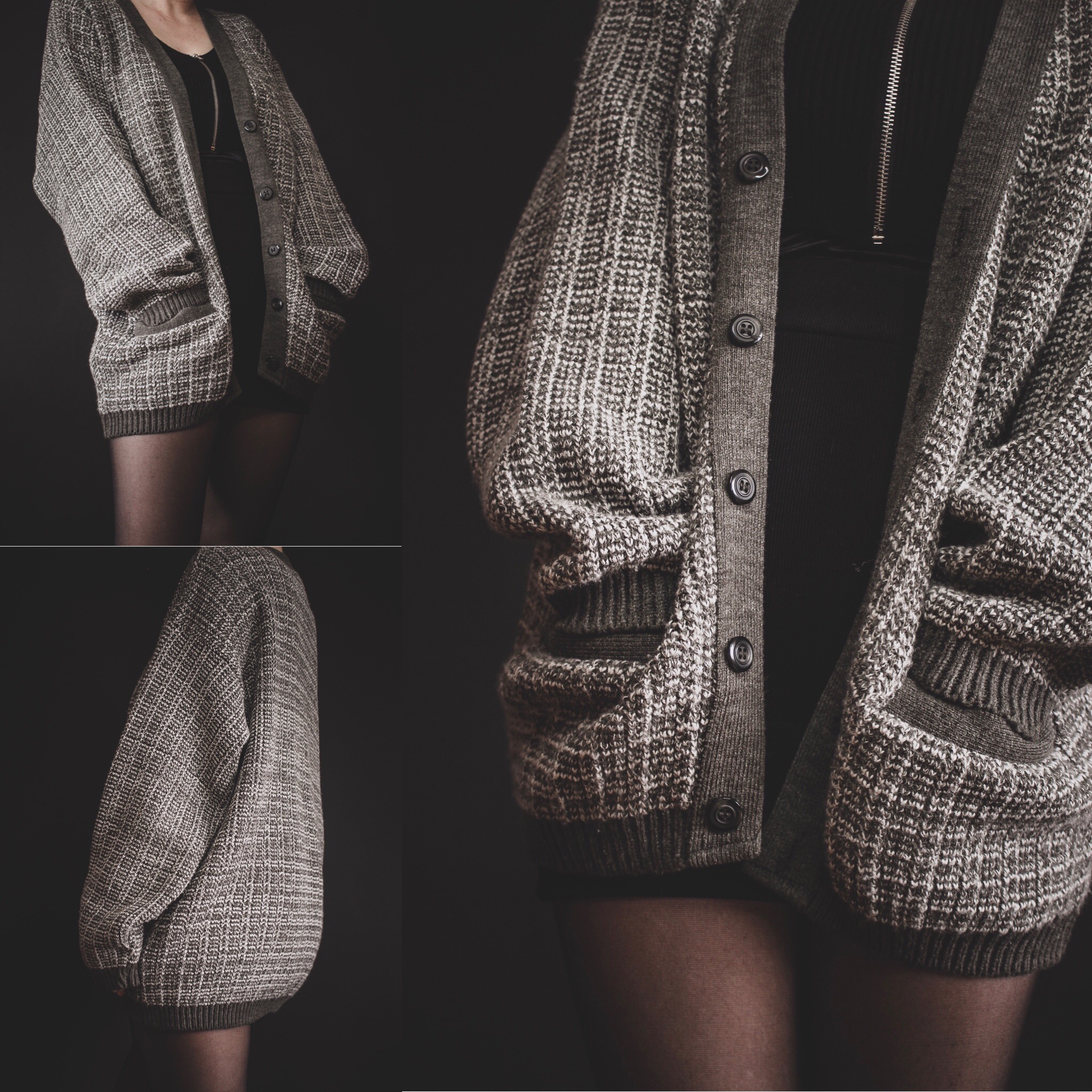 Vintage 90s signature slouchy cardigan. All Last Rites signature sweaters are one-of-a-kind unisex vintage finds straight out of the 80s and 90s, with unique collars and patterns! This one is a midweight waffle knit in cream and faded olive green. The color reminds me of a snow-covered forest in early winter. V-neck, buttons down the front, contrasting trim, loose balloon sleeves and a boxy cut. Acrylic and wool blend, feels soft to me but might have a bit of itch factor to some people - if you're not sensitive to knits or like to layer long sleeves under your sweaters, you'll be fine! Wonderfully slouchy, cozy and comfy.